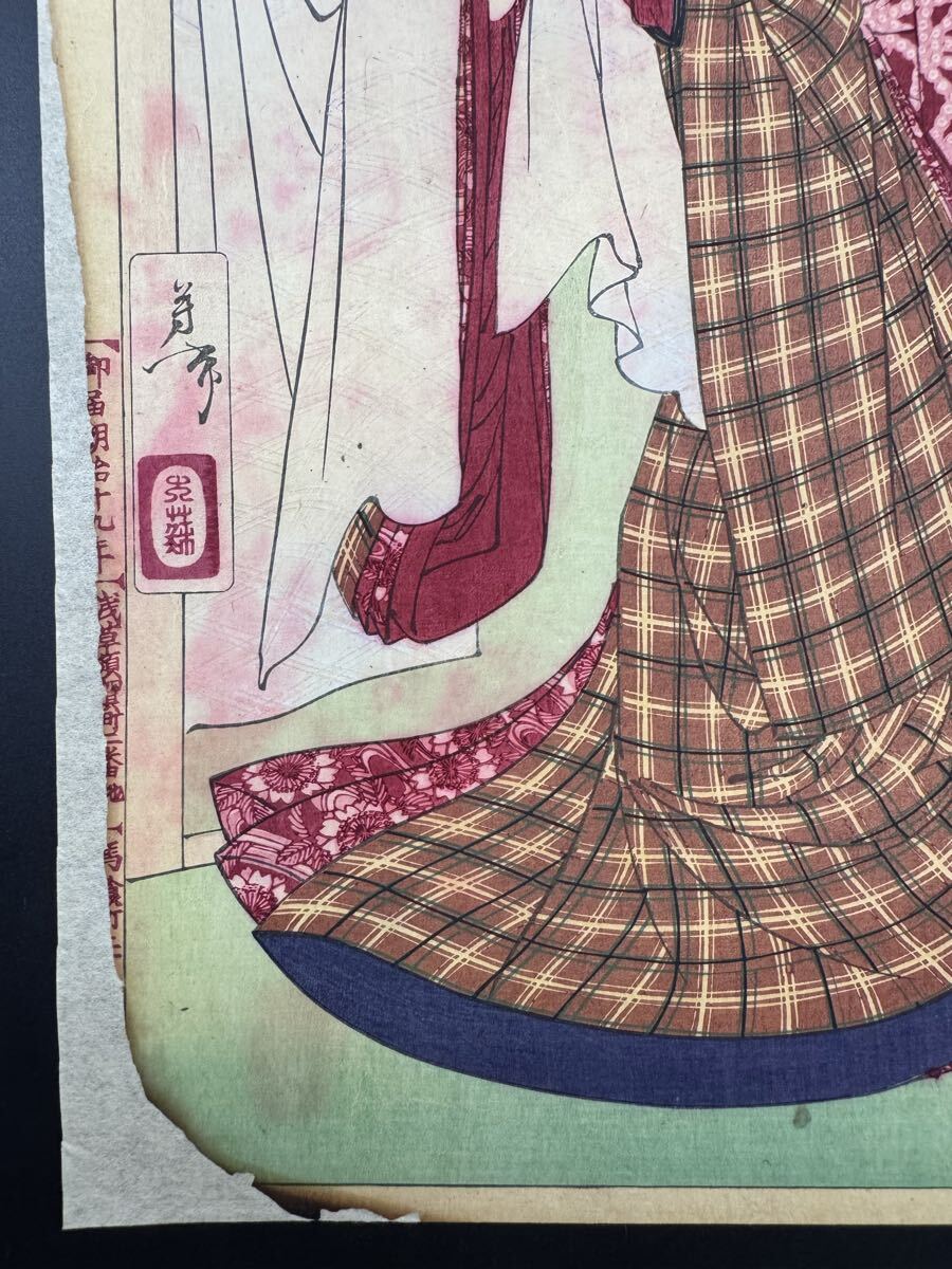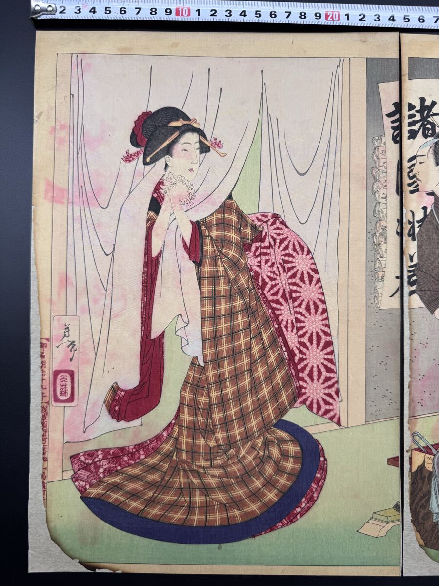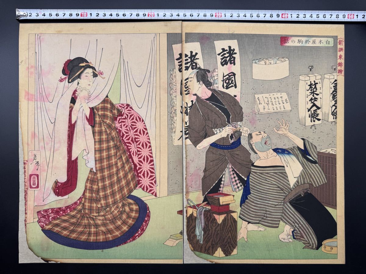 【真作】名作!本物浮世絵木版画 月岡芳年「新撰東錦絵 白木屋お駒の話」明治期 二枚続 武者絵 錦絵 大判 保存良い 裏打ち