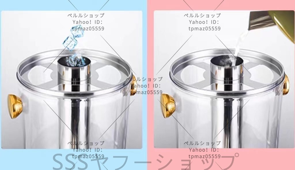 【アイスチャンバー】: 内部のアイスコア (コンテナ) とボトムスタンドユニットを氷で満たすだけで、飲み物をすばやく冷やすことができ、パーティー、イベント、ピクニック中も涼しく保つことができます。