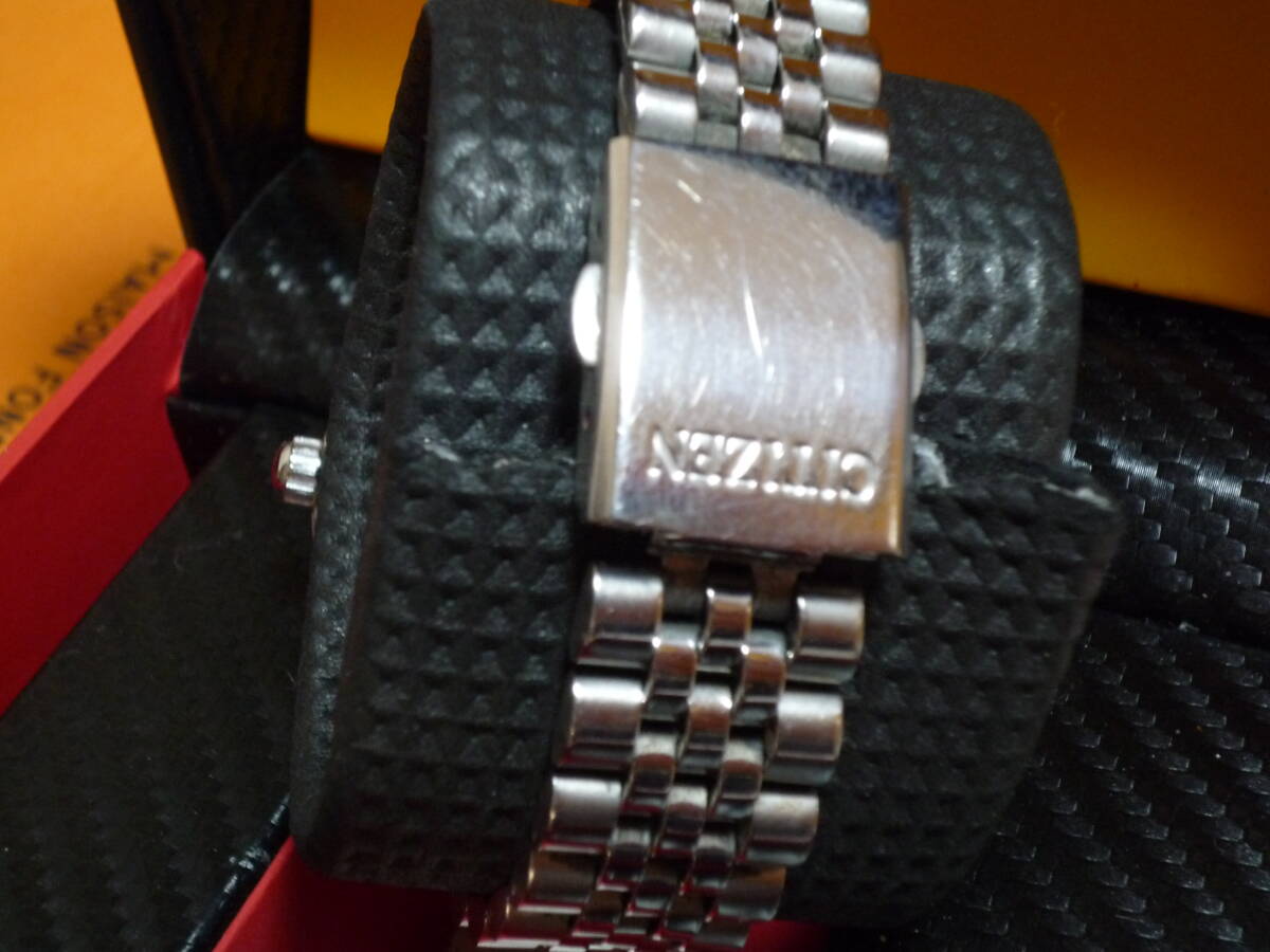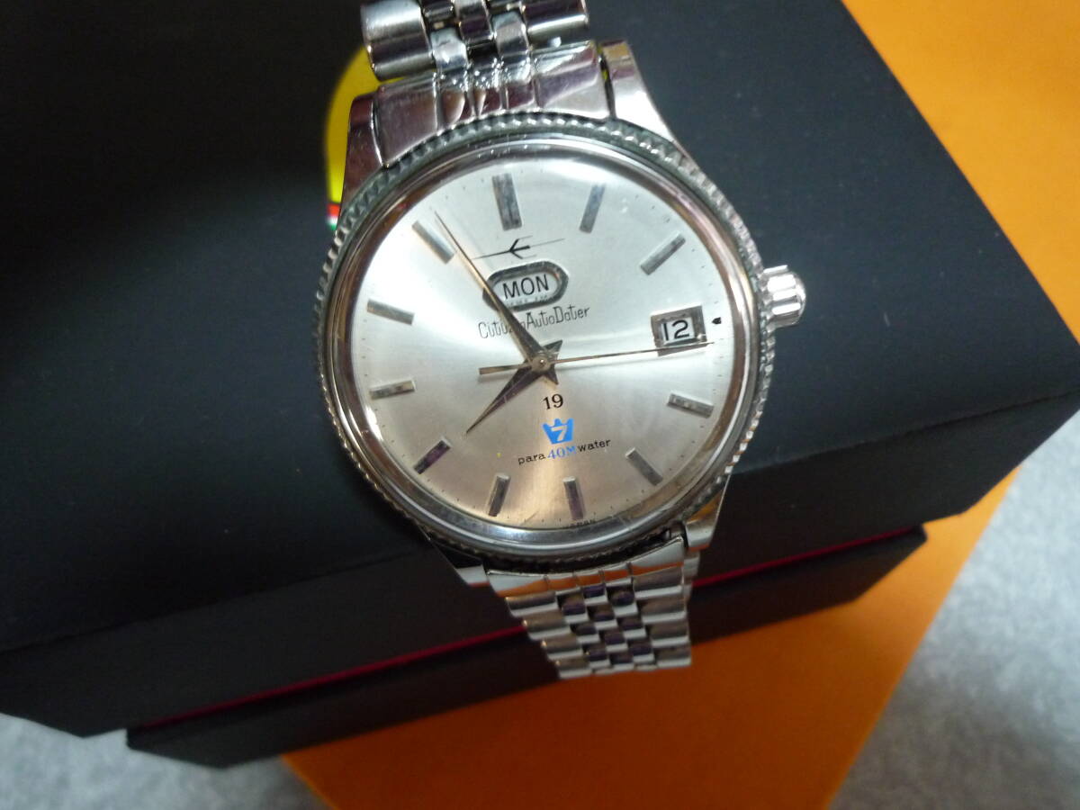 CITIZEN シチズン Auto Dater オートデーターセブン Para 40M Water 腕時計 です ケースサイズ 約 47mm× 38mm × 12mm リューズ含まず ムーブは デイト付き19石オートマチックです 状態は、風防に小傷 ケースに多少擦れ薄汚れ有りますがその他は目立つダメージは有りません 画像を参考にしてください 詳細は自己紹介欄をご覧ください 発送はゆうパケットプラスですこの商品¥8950円即決ですよろしくお願いします、