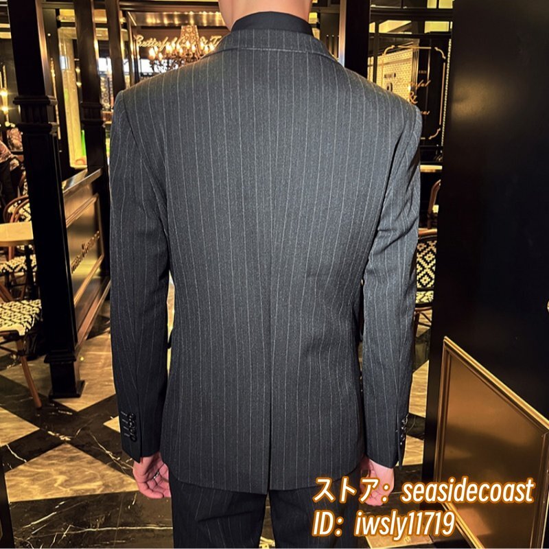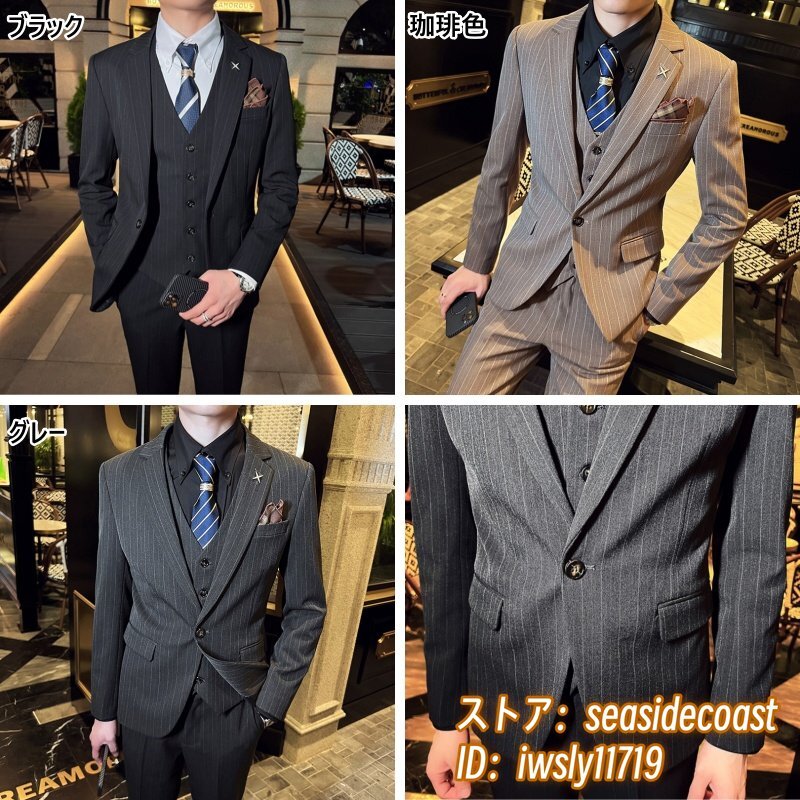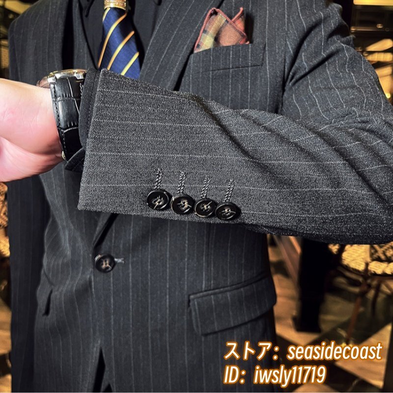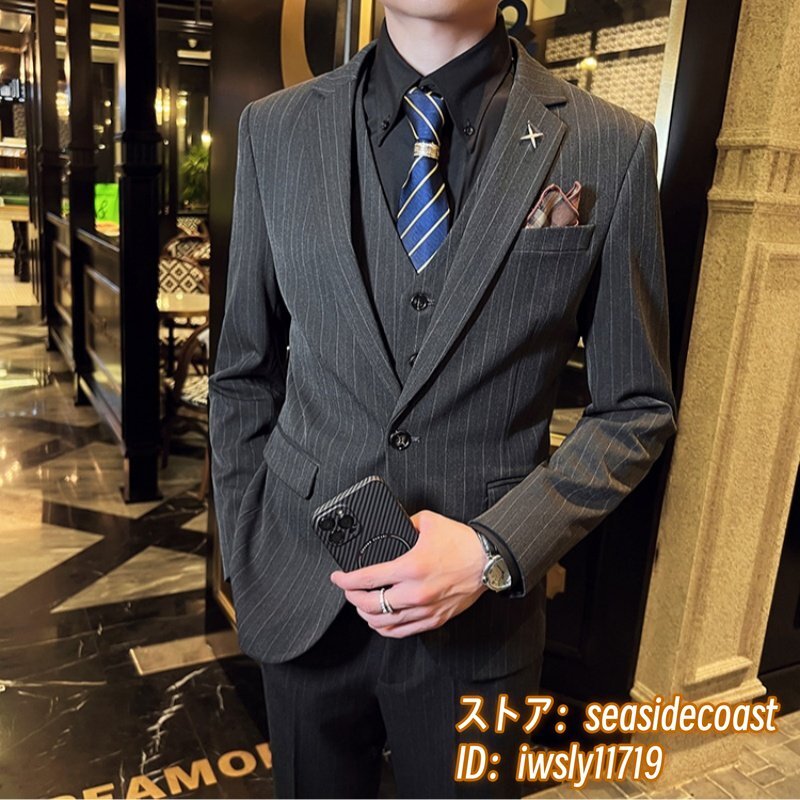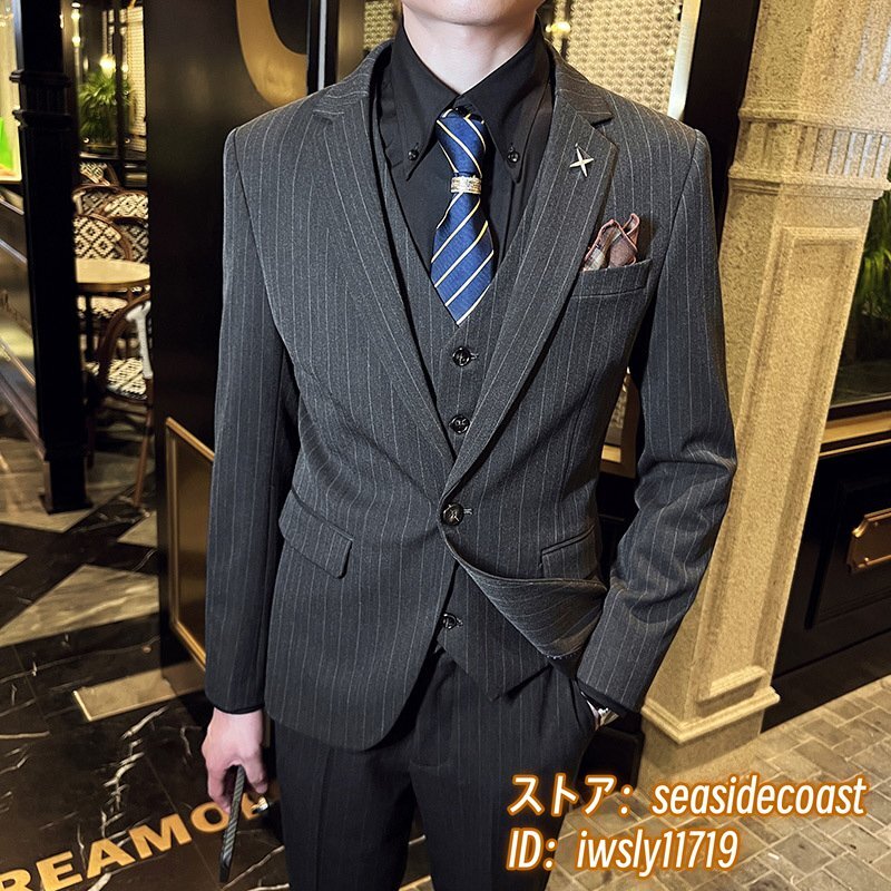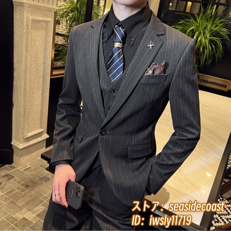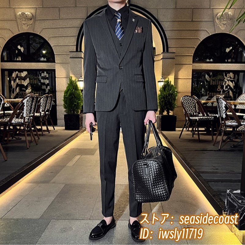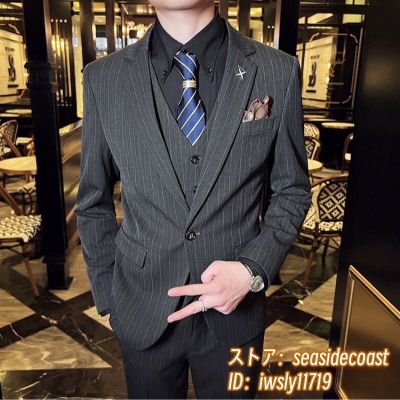 シングルスーツ スリーピース 極美新品♪メンズ スーツセット 3点セット ストライプ柄 背広 スタイリッシュ 結婚式 一つボタン グレー M