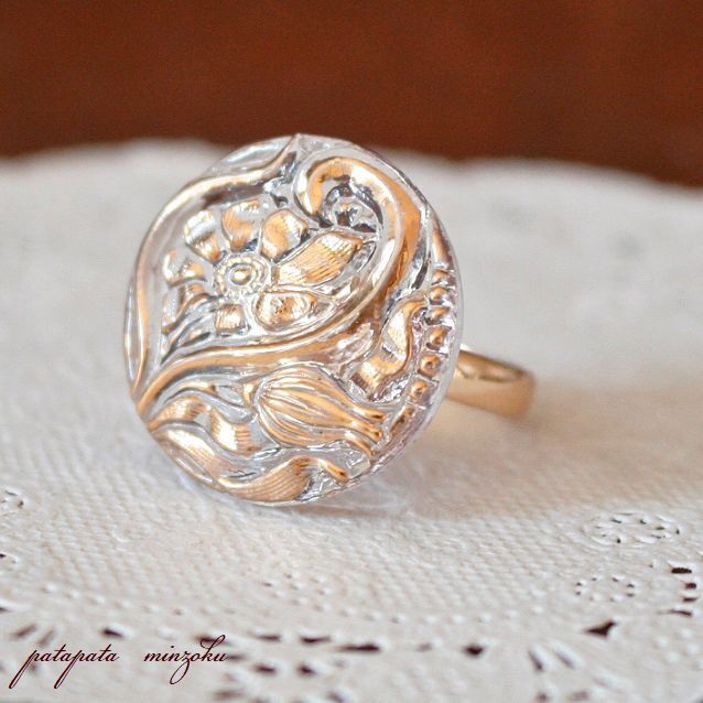 チェコ・ボヘミア ガラス クリアフラワー リング チェコガラス パタミン アクセサリー ボタン チェコ 指輪
