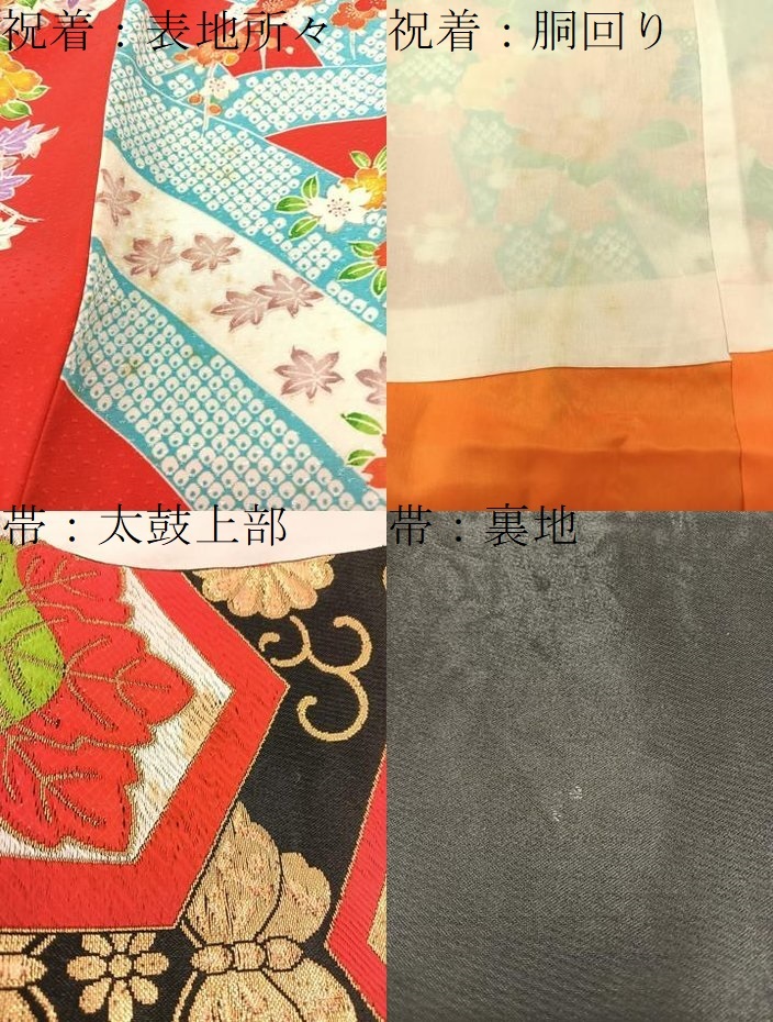 | 着物【正絹】の状態は接写画像のように 表地所々・胴裏に薄い汚れがございます。 袋帯【化繊】の状態は接写画像のように 太鼓上部・裏地に薄い汚れがございますが その他特に目立ったシミ汚れなどもなく大変良い状態です。 大変上質な逸品になりますのでぜひお手入れをされてお召しになられてはいかがでしょうか。 お安く出品致しますので、是非この機会にいかがでしょうか?