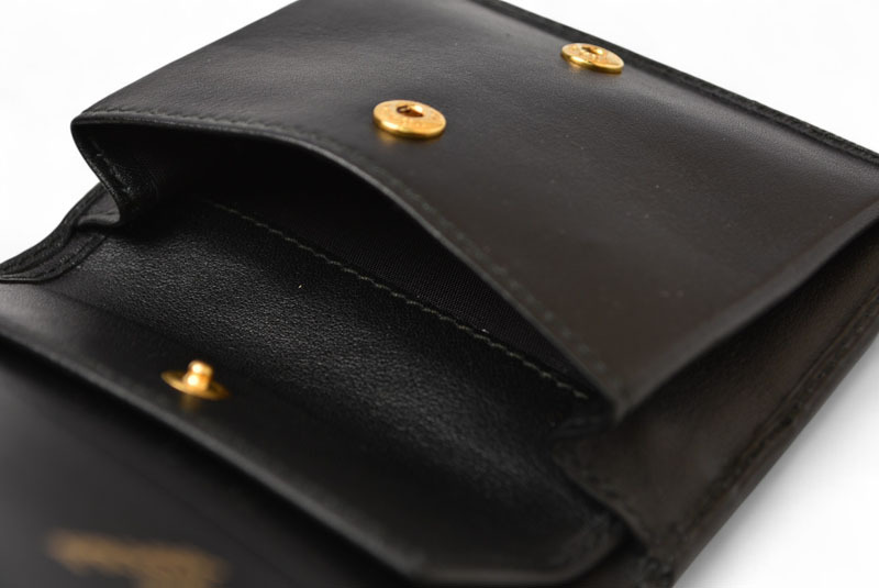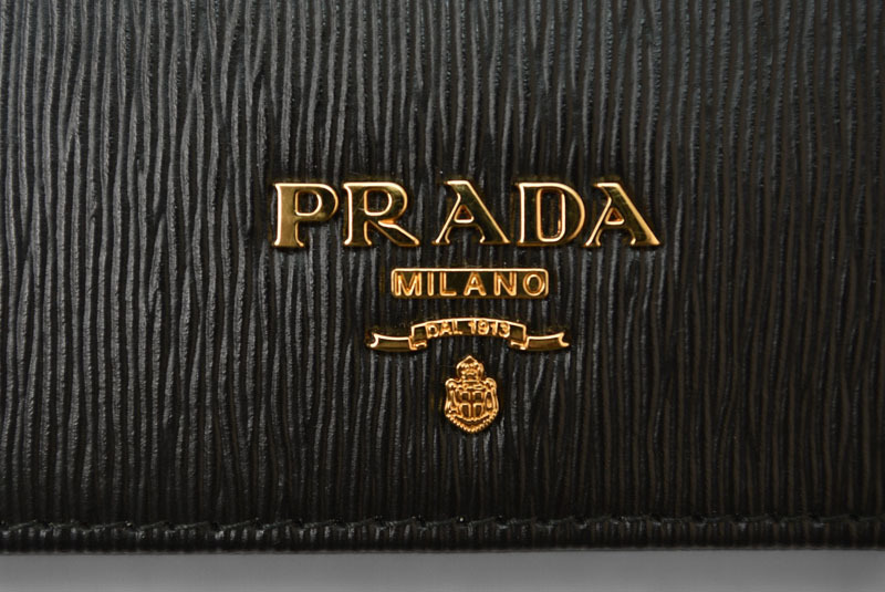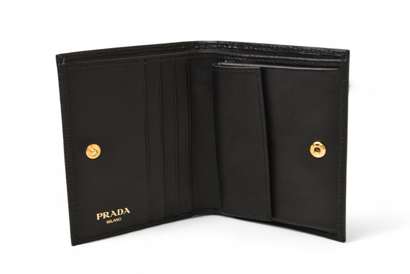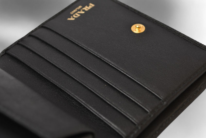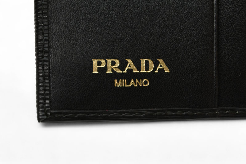 商品説明 | プラダより、折財布です。シンプルなブラックカラーのお財布です。傷や汚れに強いレザーです。センターにはPRADAのロゴがデザインされ、高級感を感じさせます。コンパクトサイズで、スマートに収納が可能です。 |