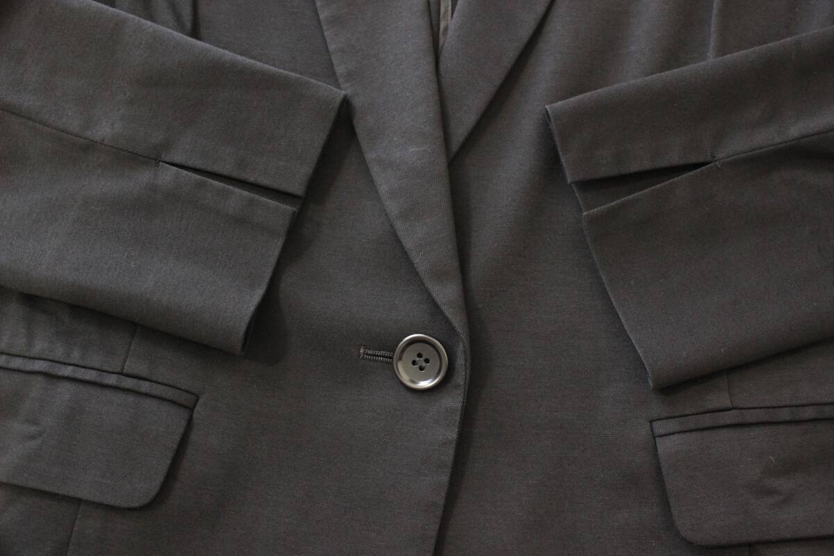 ジャケット:一つボタン・シンプルデザイン。ノーベント仕様で洗練された印象。袖口はスリット入りで、折り返しても着用可能。