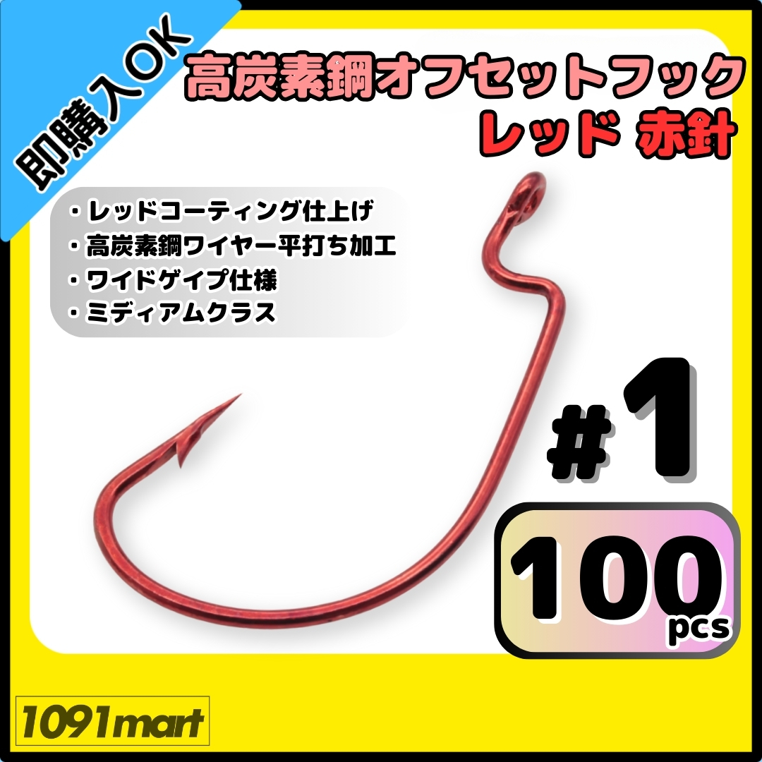 【送料無料】高炭素鋼 オフセットフック レッド赤針 #1 100本セット レッドコーティング仕上げ ワームフック テキサスリグ等様々なリグに