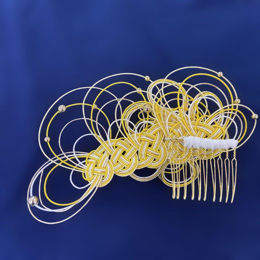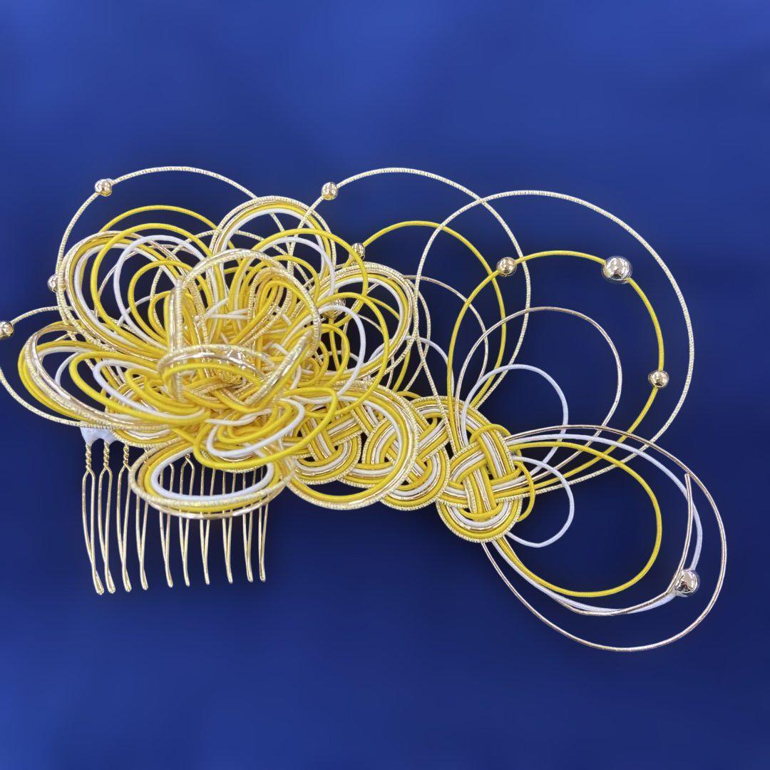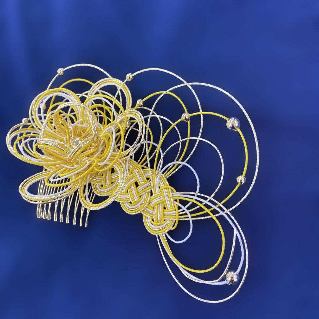 水引の黄色と白の花飾り、伝統的な和装に最適。