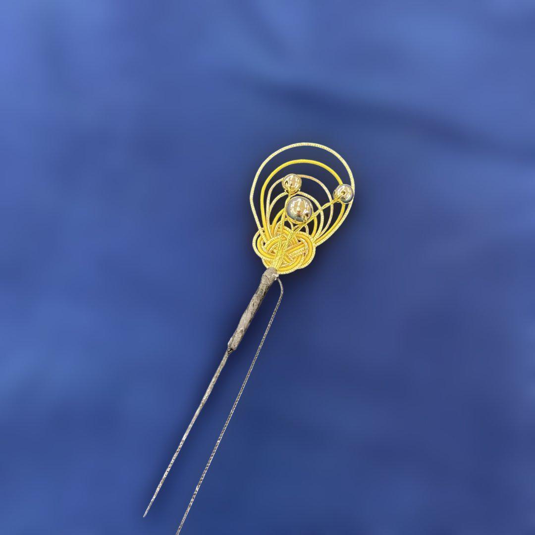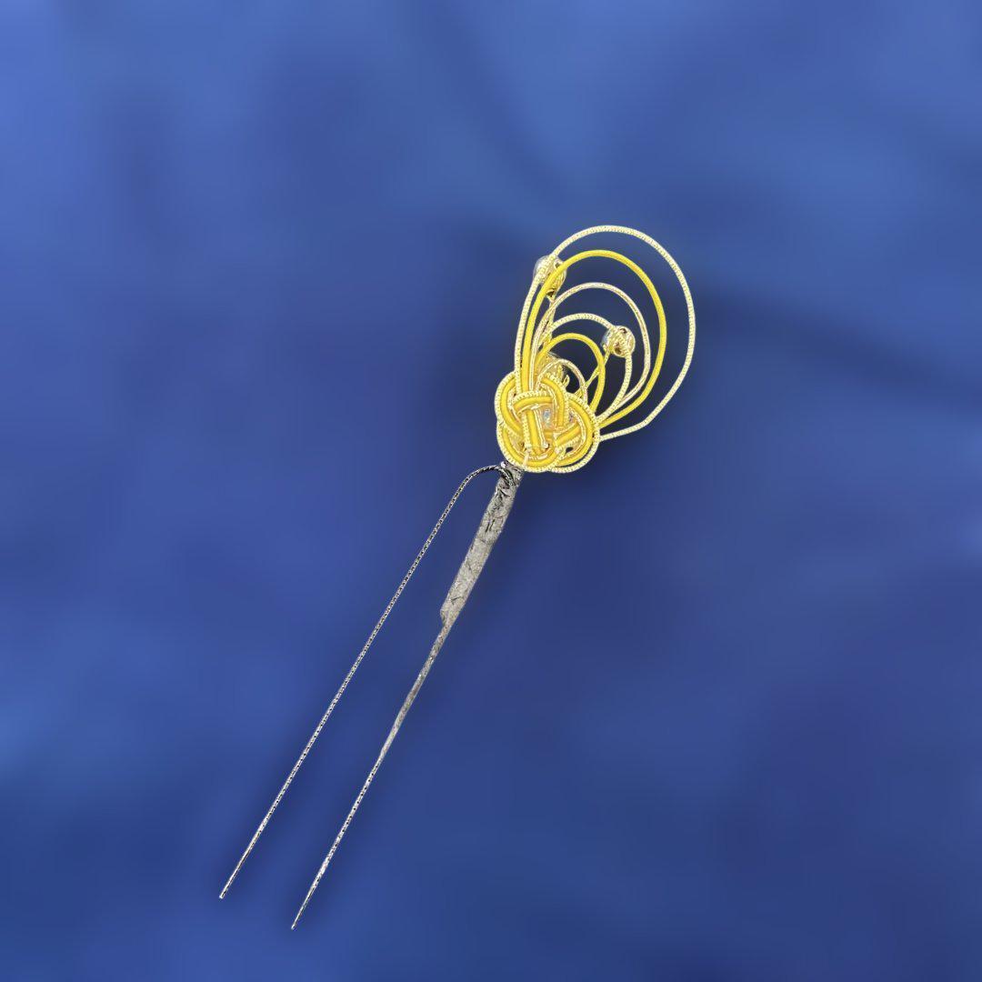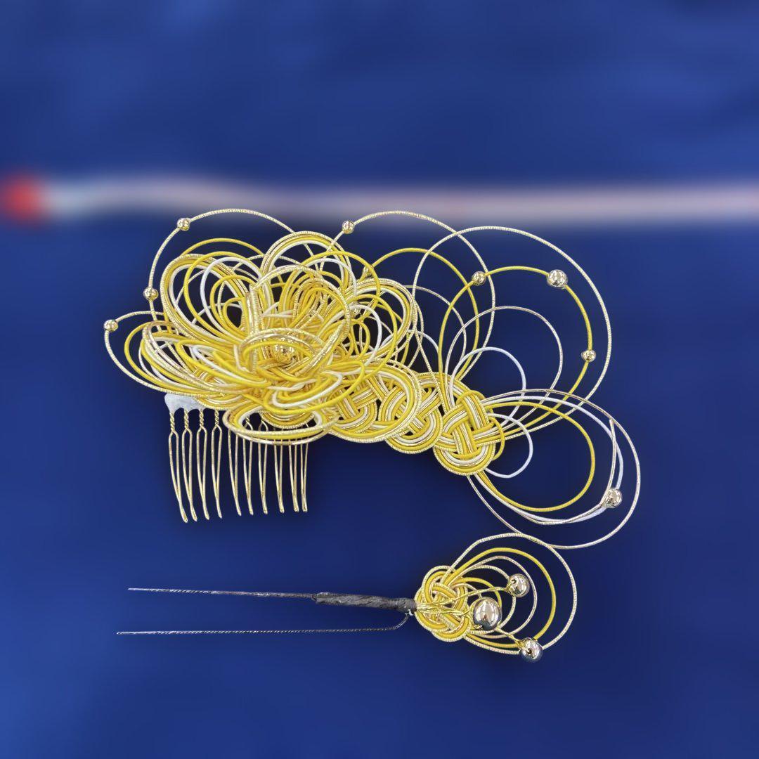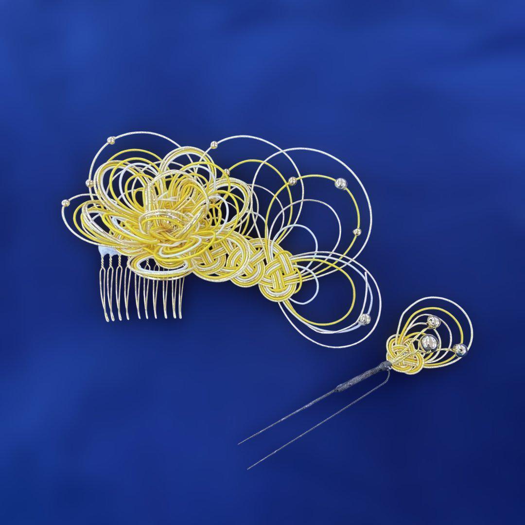 水引の黄色と白の花飾り、伝統的な和装に最適。
