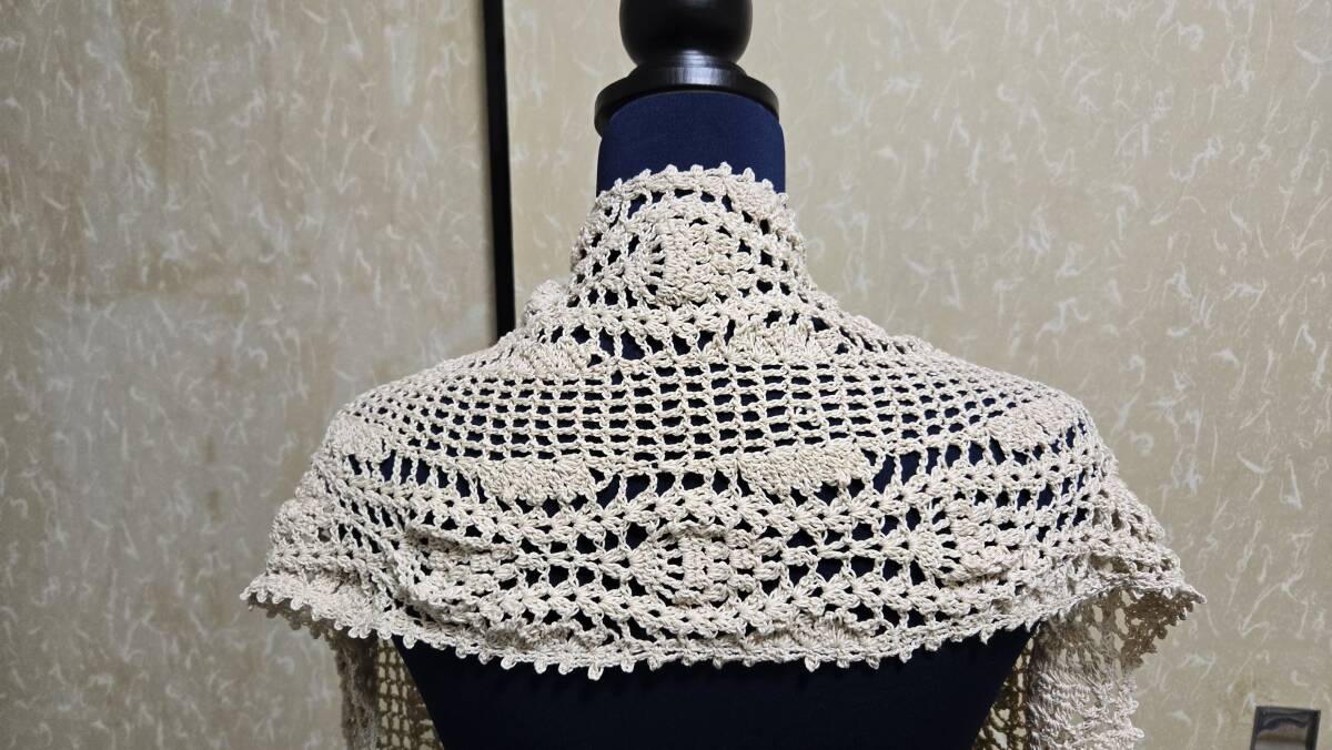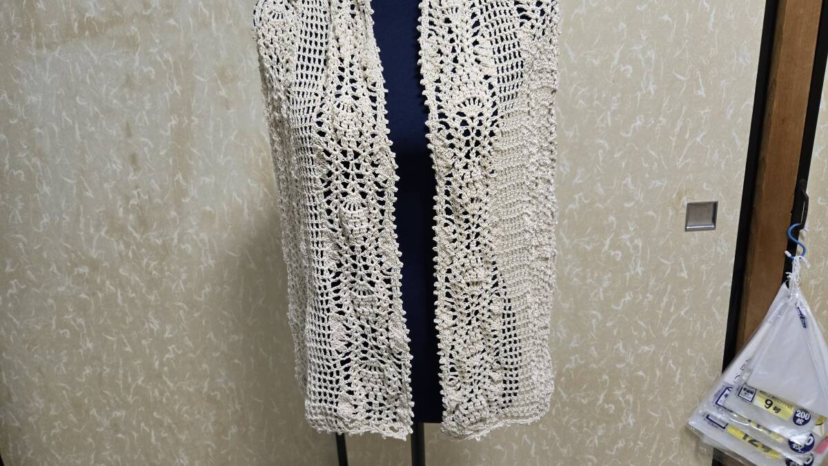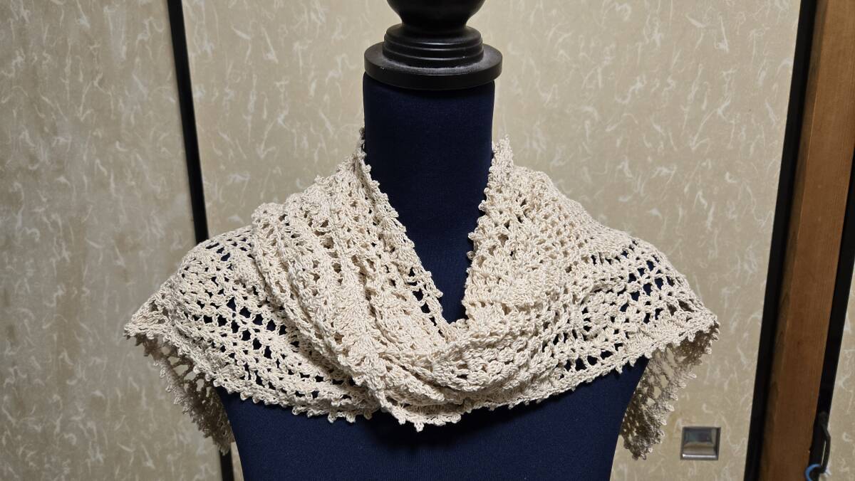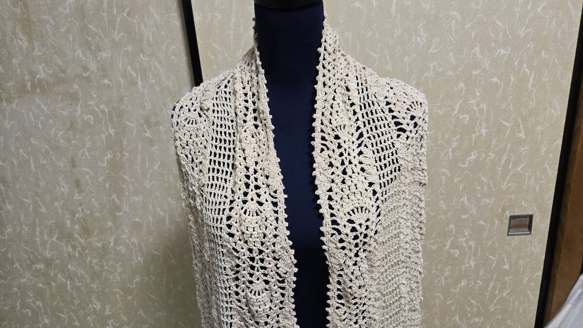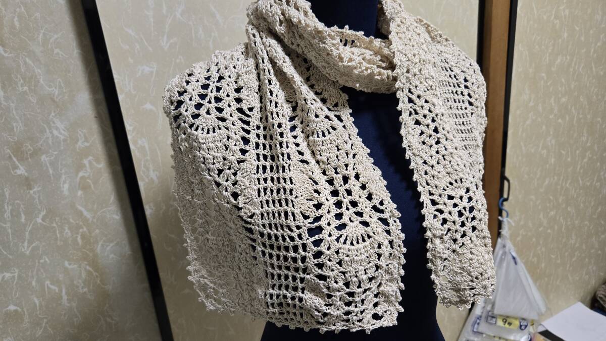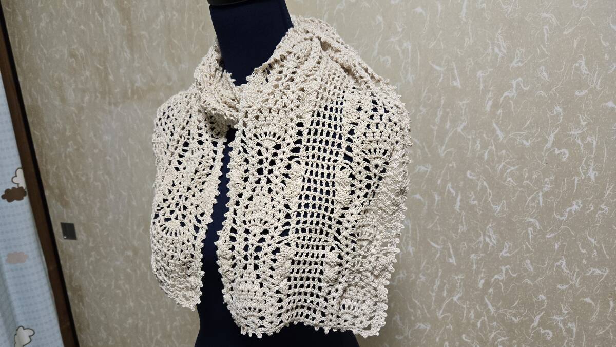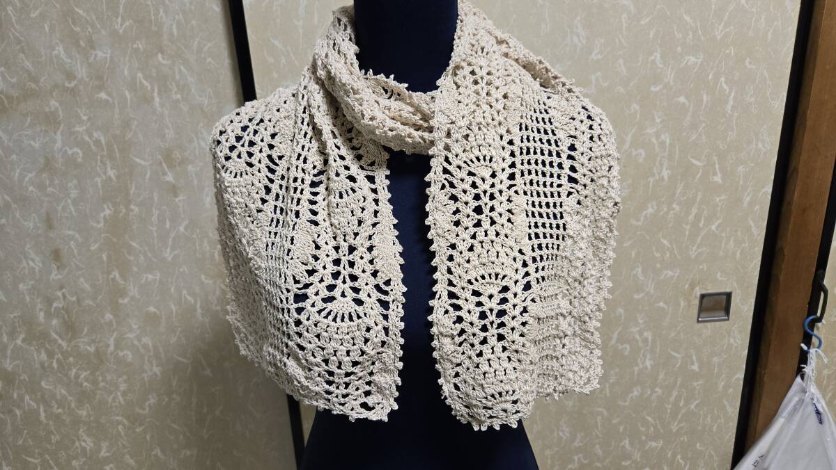 ☆綿100%レース糸☆手編み☆玉編みパイナップルのストール(クリームベージュ)♪送料無料♪