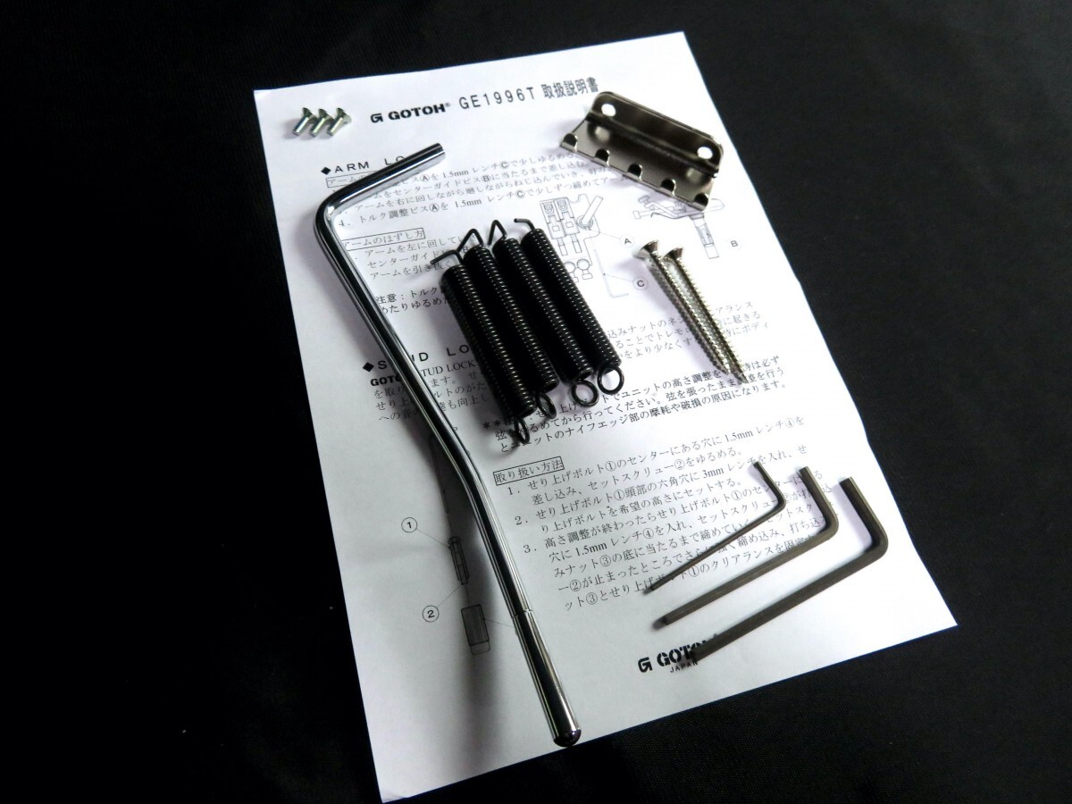 ◆内容物:トレモロ本体、付属品一式(アーム、せり上げボルト、スプリング ×4、スプリングホルダー、ホルダー止めスクリュー ×2、ビス、レンチ×3種)、取扱い説明書