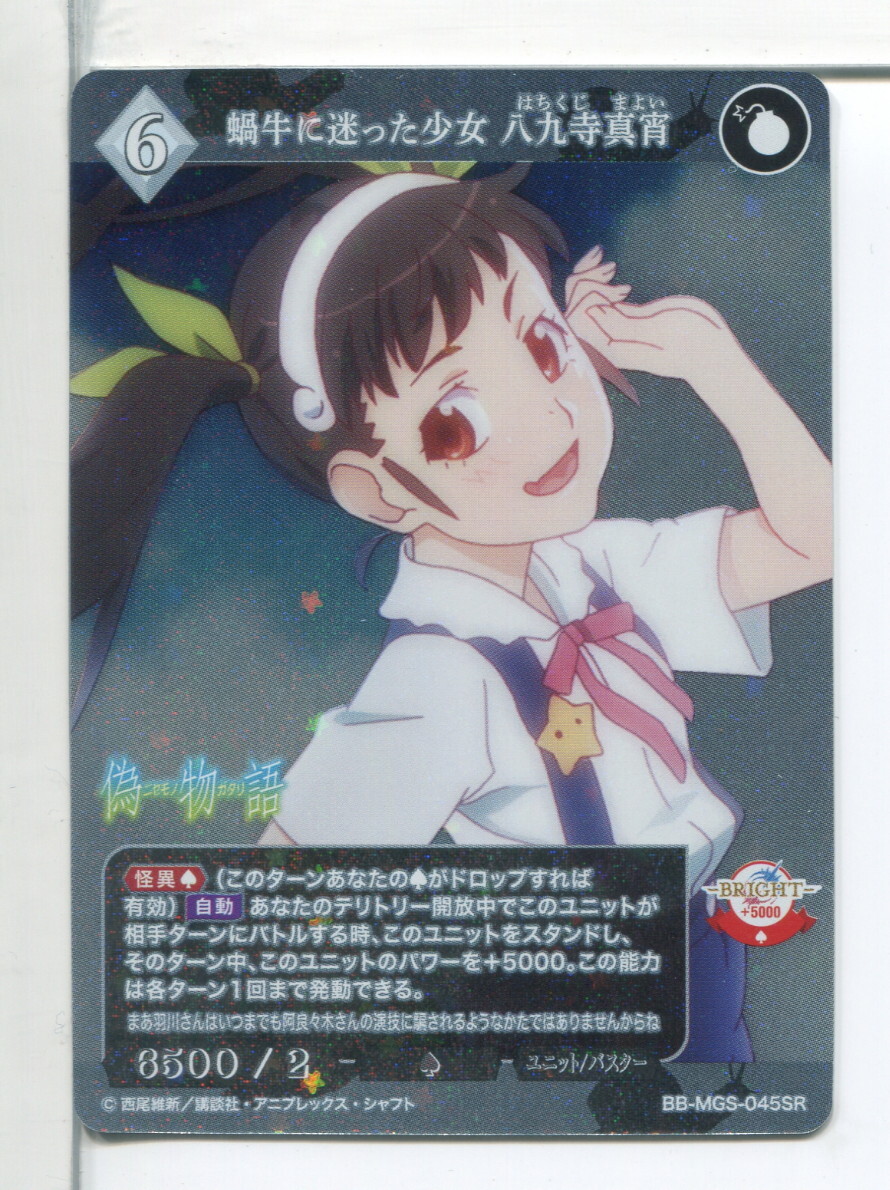 | ビルディバイド 物語シリーズ 蝸牛に迷った少女 八九寺真宵 SRカードです。スレなどの傷みがあります。注意事項と発送詳細(送料)をご確認のうえ、ご入札をお願いいたします。 ※カード番号は下記の通りですが、記載ミスがあるかもしれませんので画像で最終確認をお願いいたします。 BB-MGS-045SR |