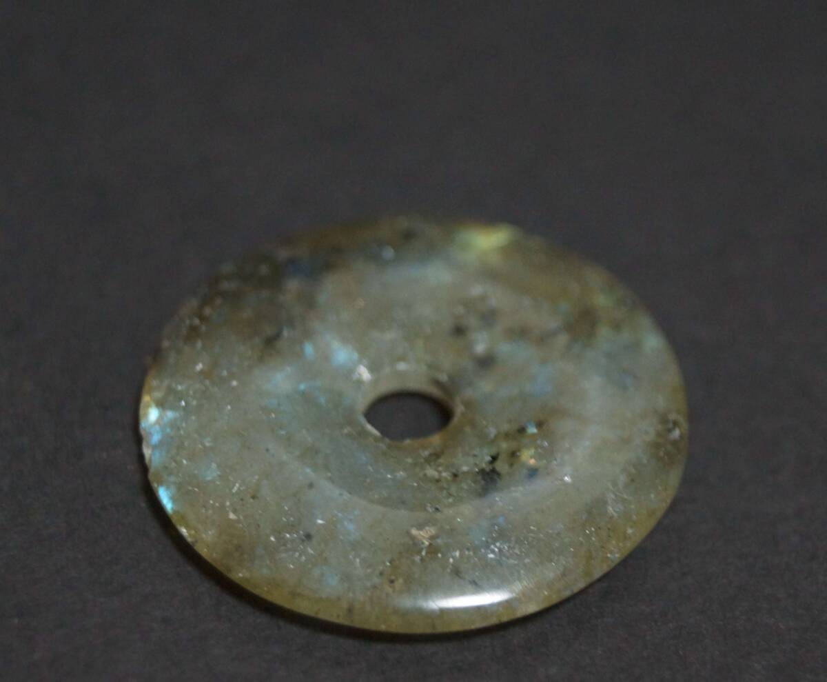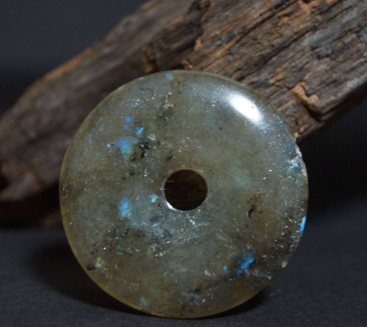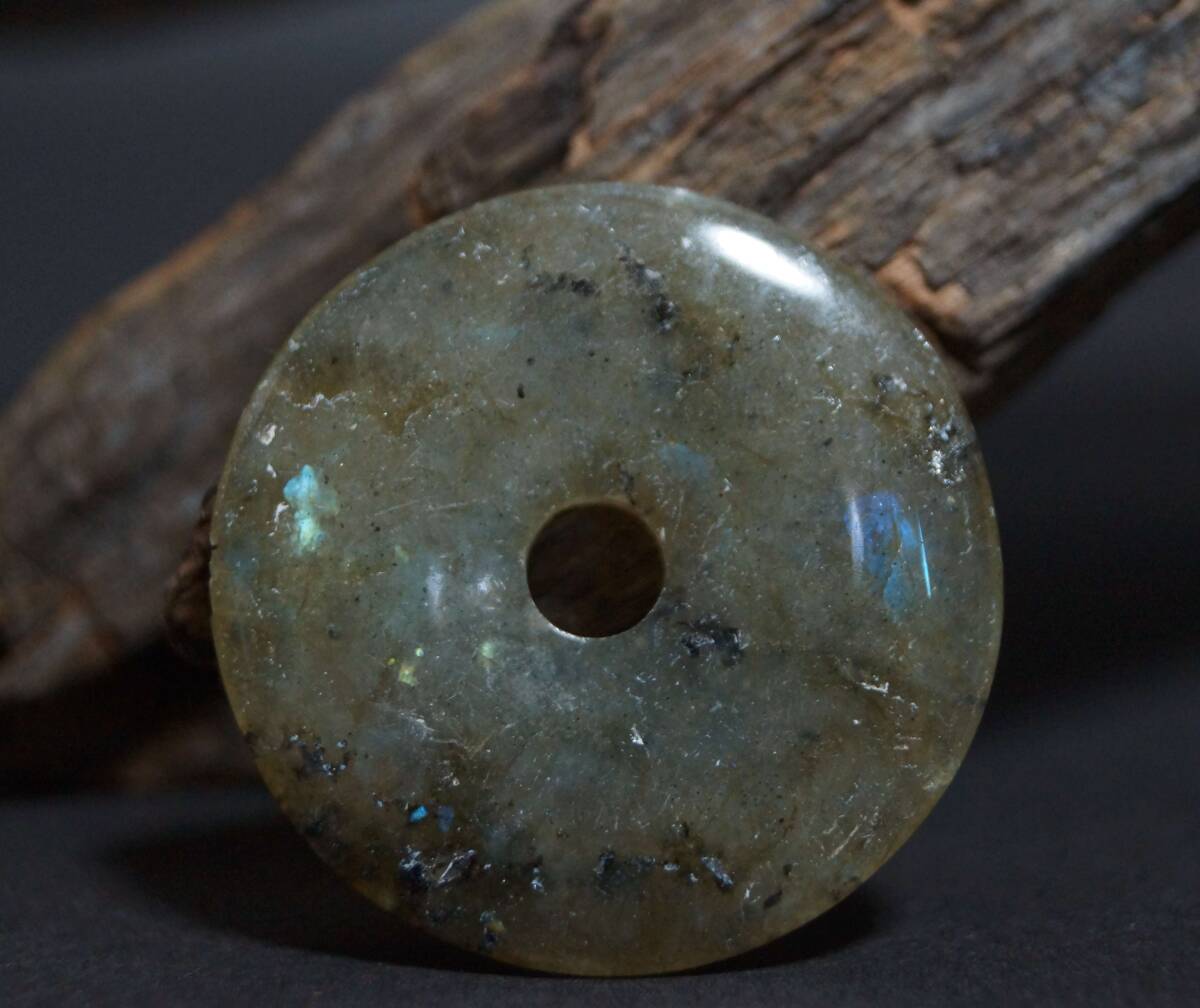 【寂】天然石 ラブラドル長石 ラブラドライト ドーナツ型 根付 緒締玉 アゲート 提げ物 Dziビーズ 装飾品 径2.9cm☆時代物☆s70926
