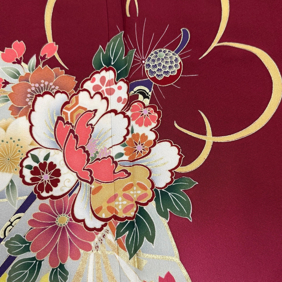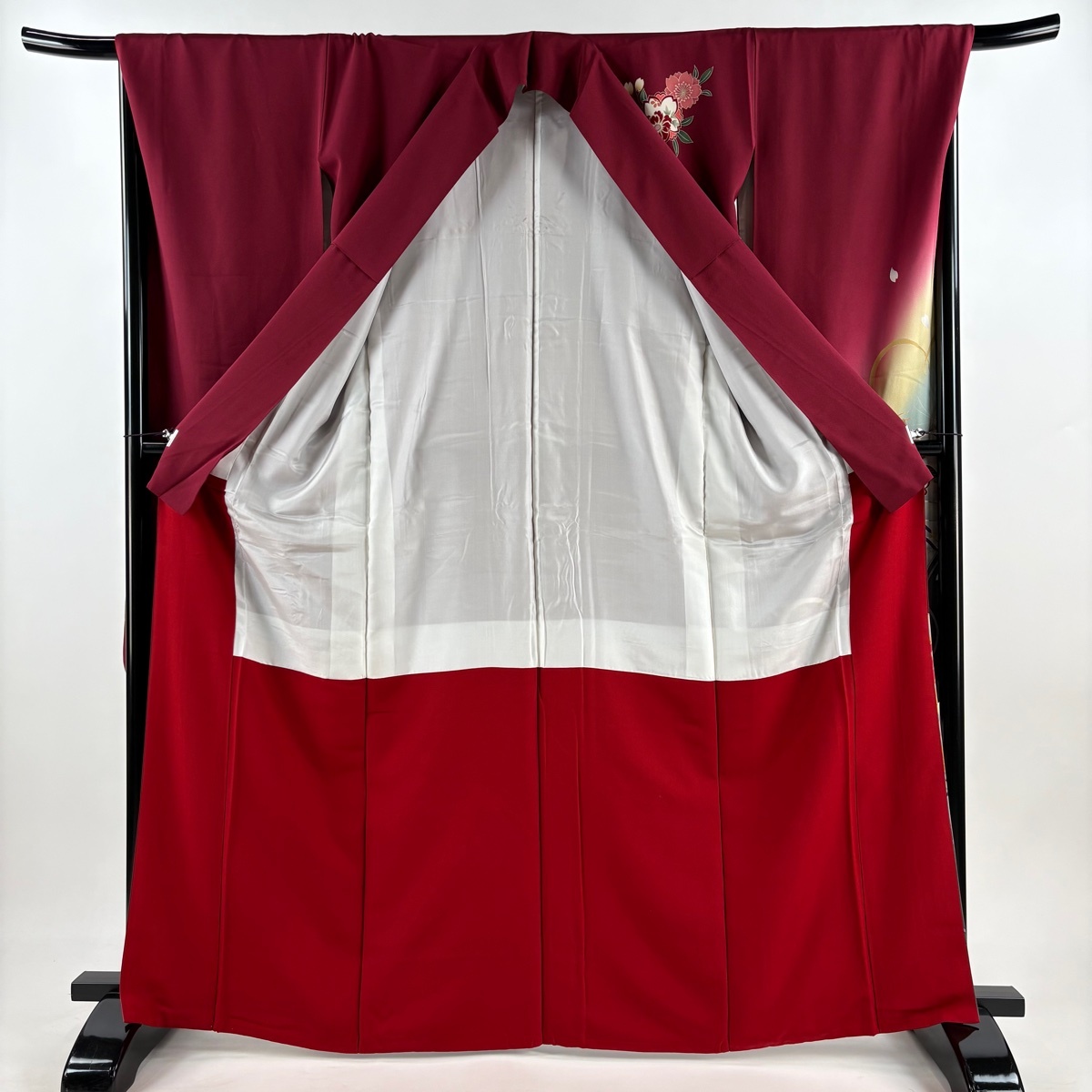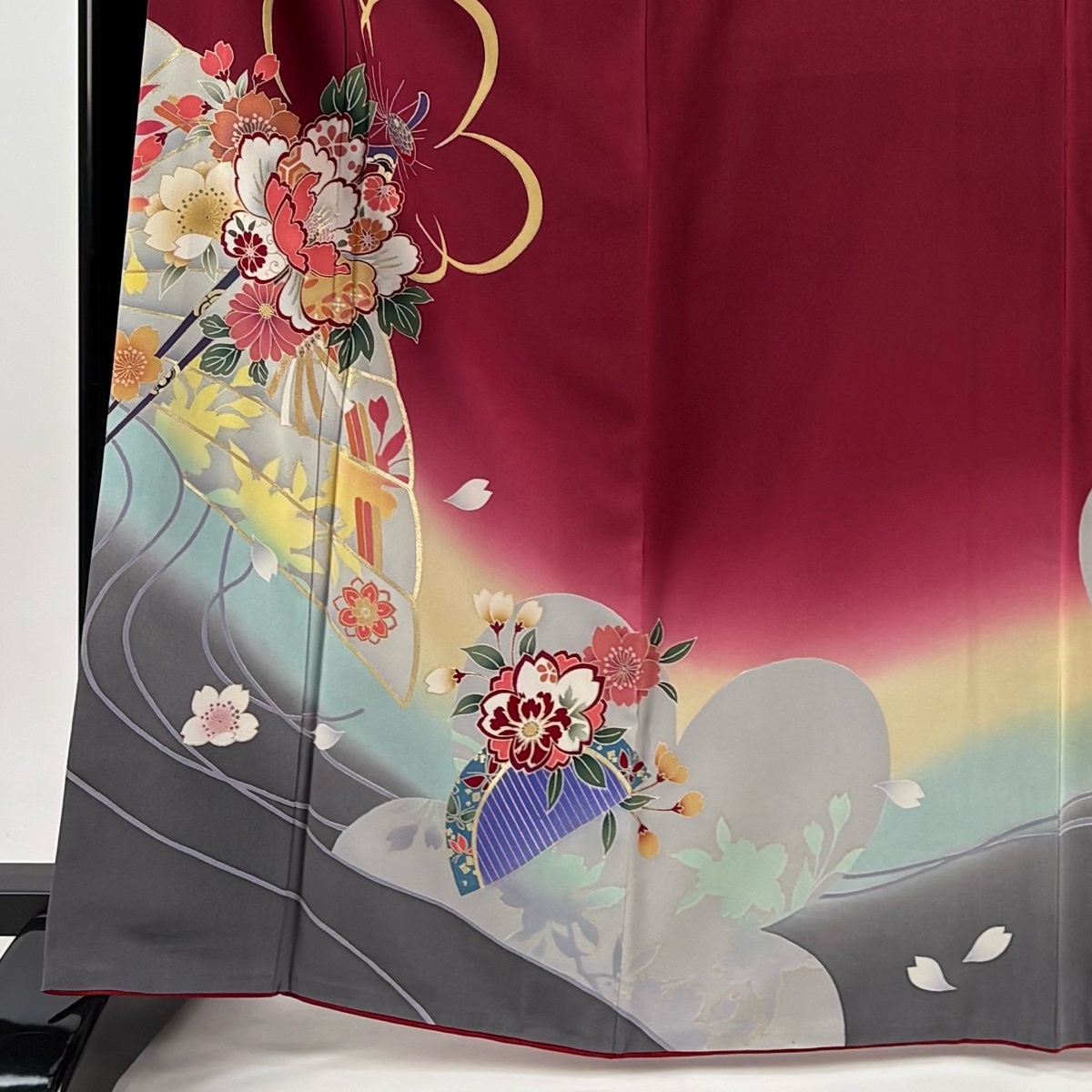 振袖 秀品 桧扇 かんざし 金彩 染め分け えんじ色 袷 身丈165 裄丈68 L 正絹 【中古】 |