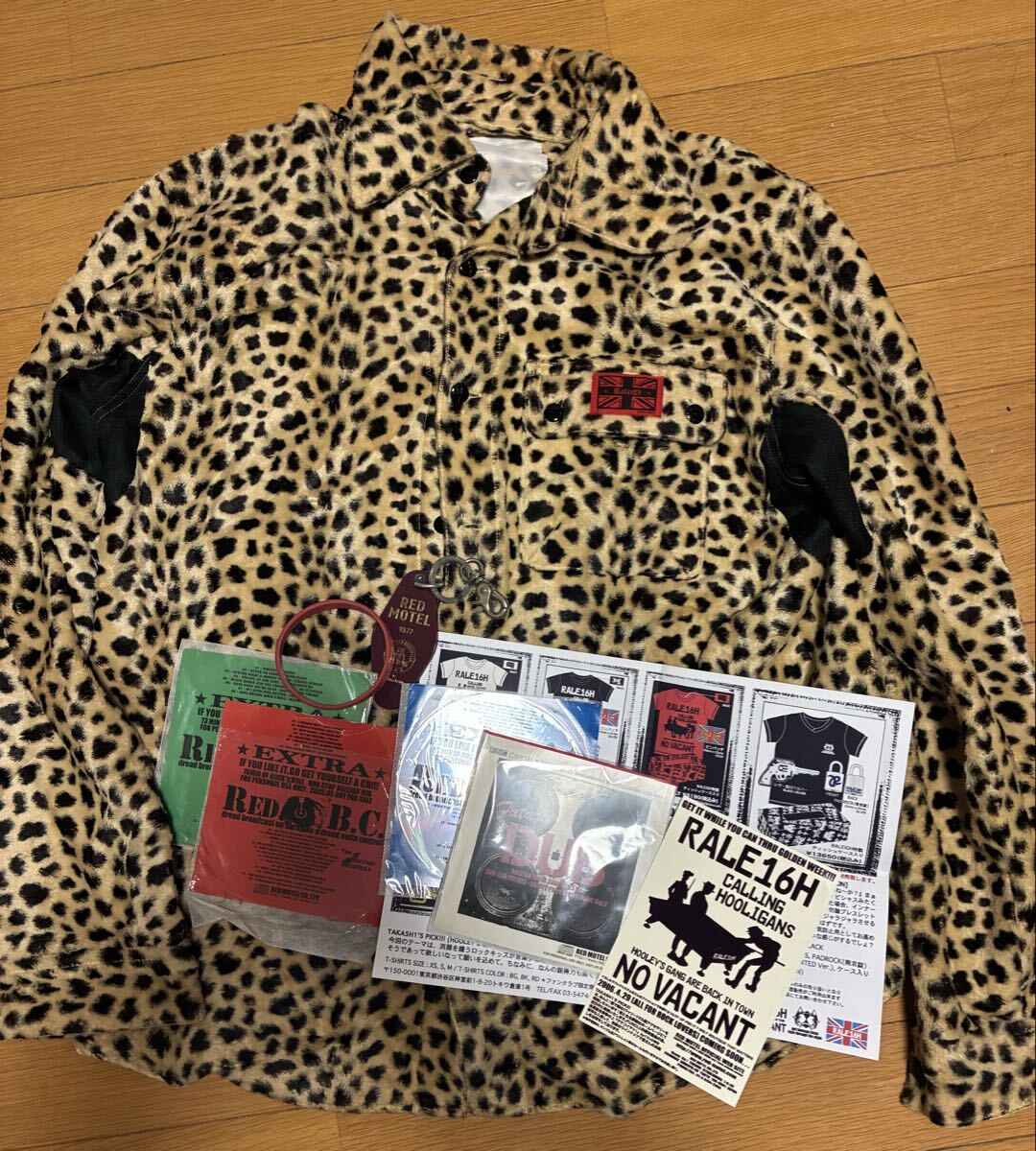 ラリーの豹柄シャツ(毛の抜けあり、Mサイズ)ラバーバンド、ノベルティーのCD4枚とチラシとポストカード、レッドモーテルのキーホルダーもあったのでおまけで付けます。