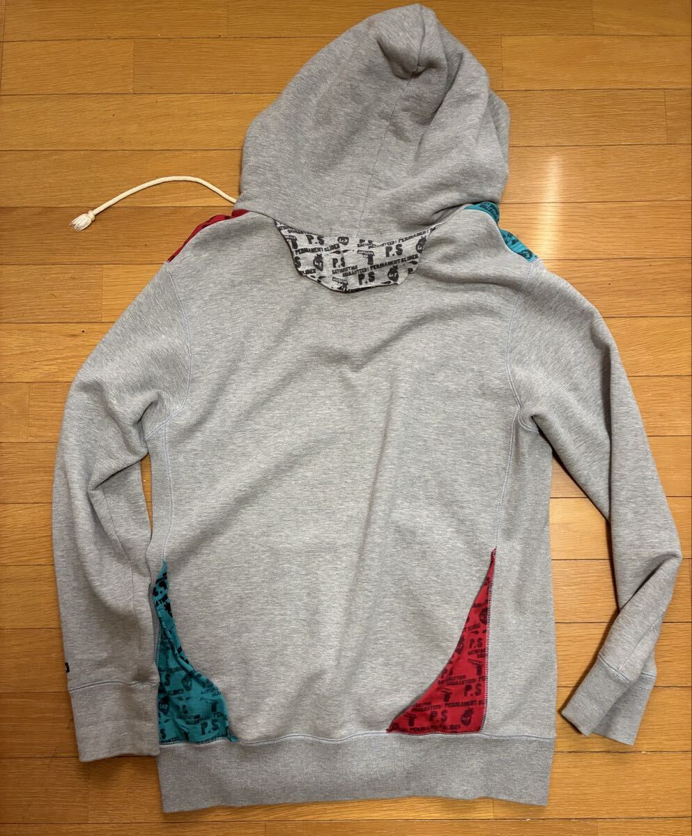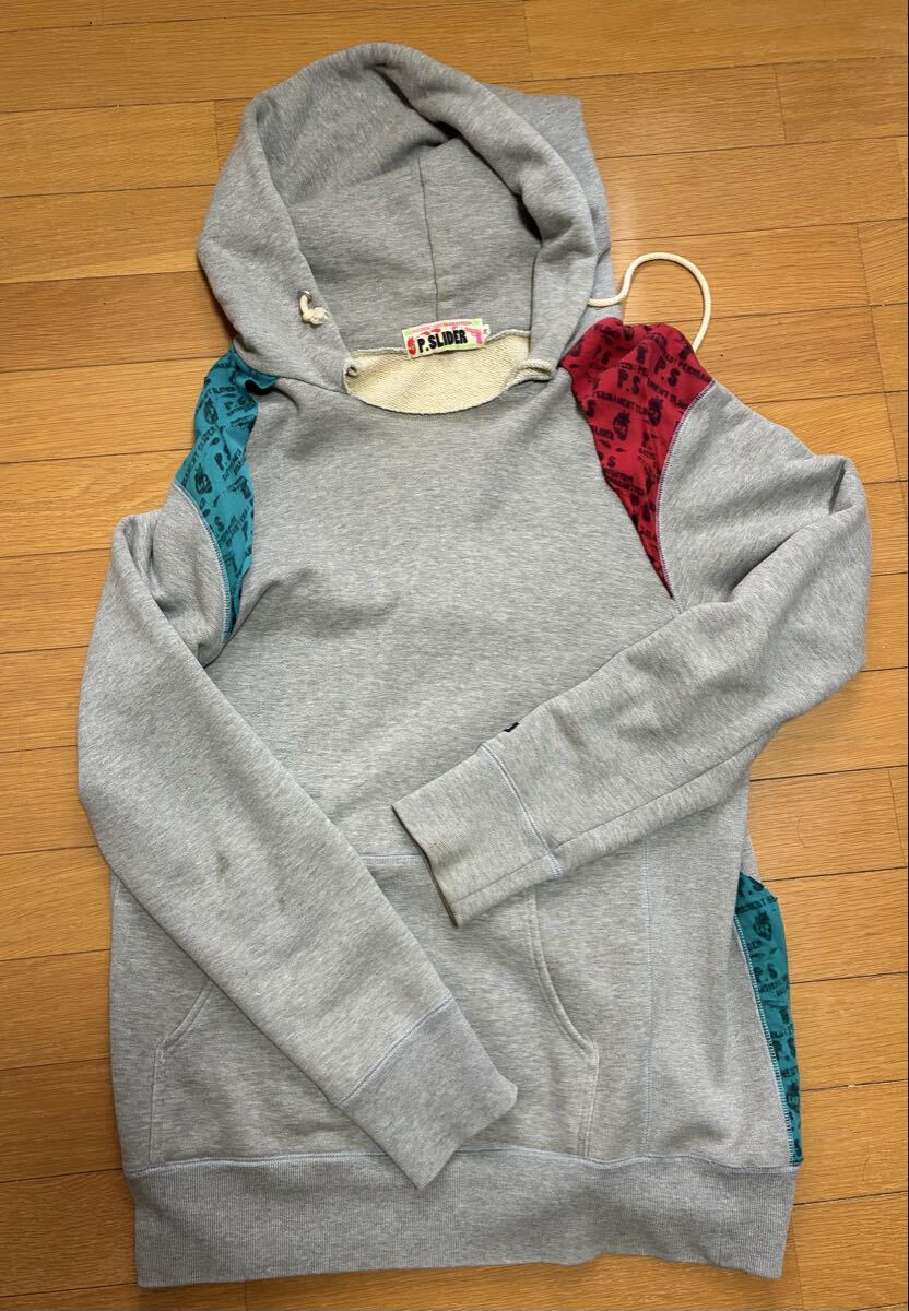 パーカーは袖口に薄汚れ、お腹の辺りに傷(穴)があります。