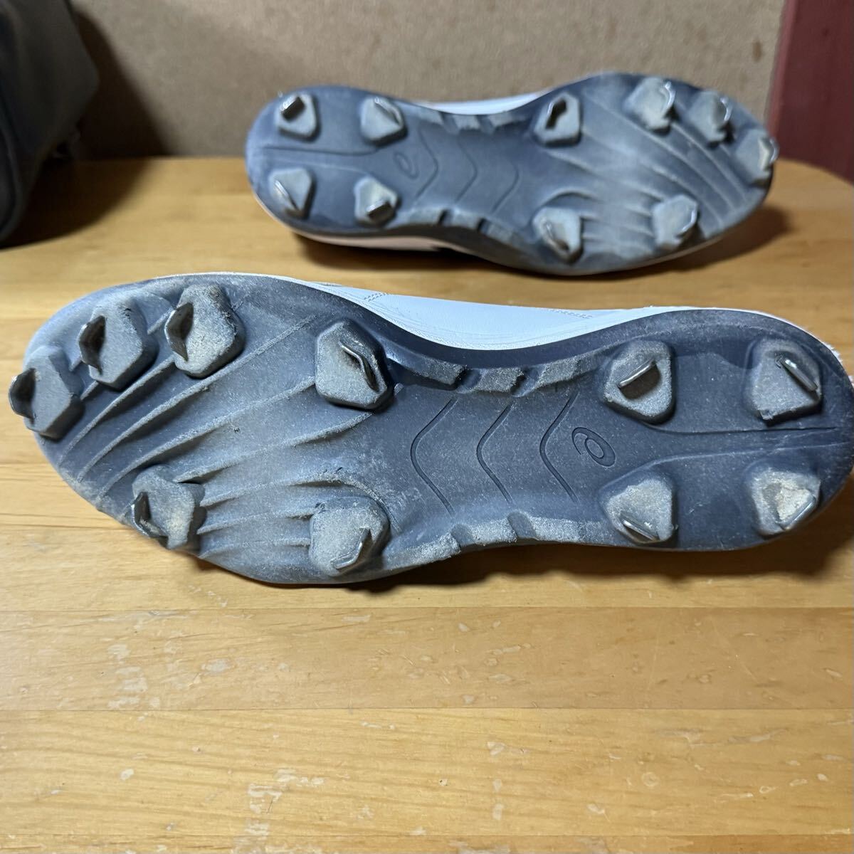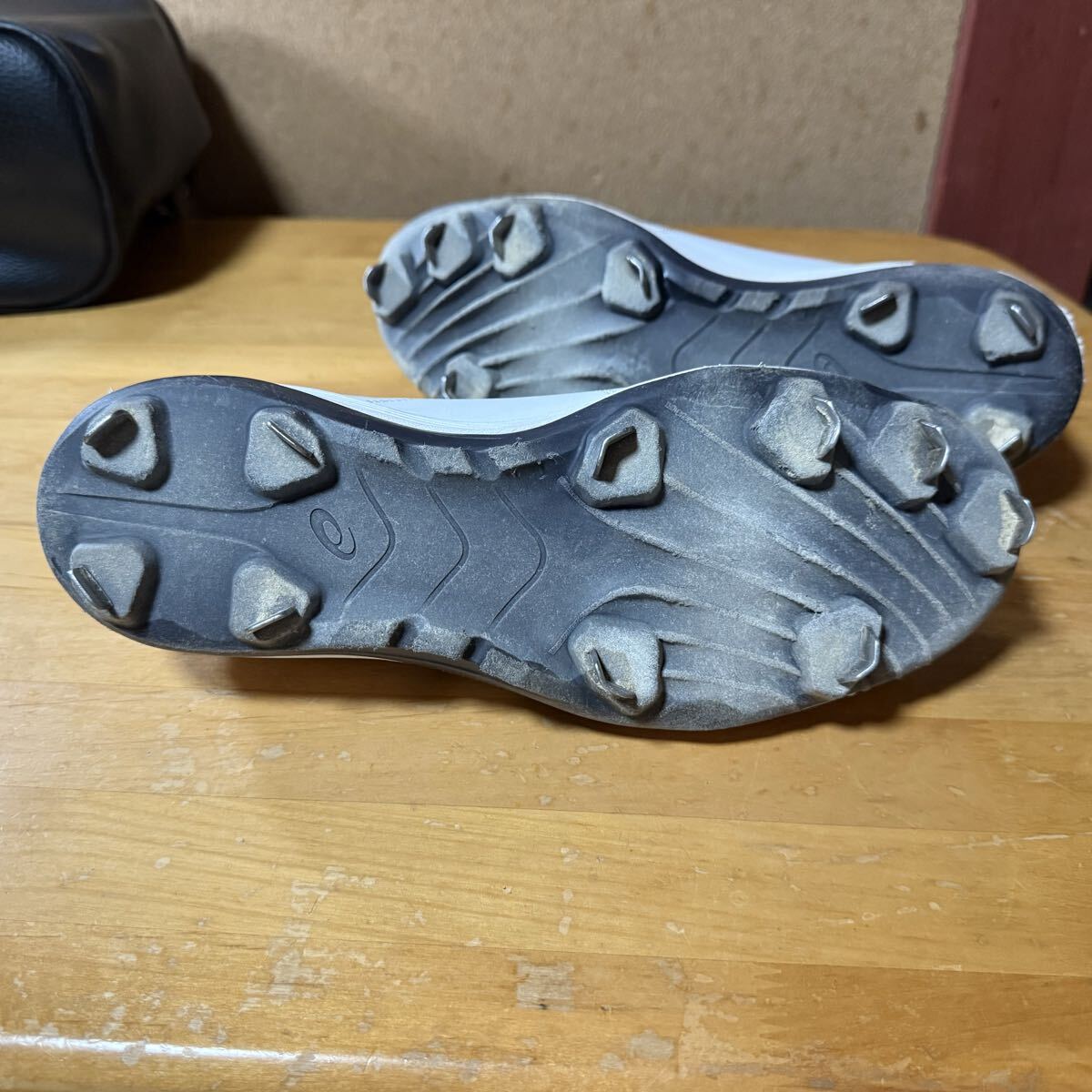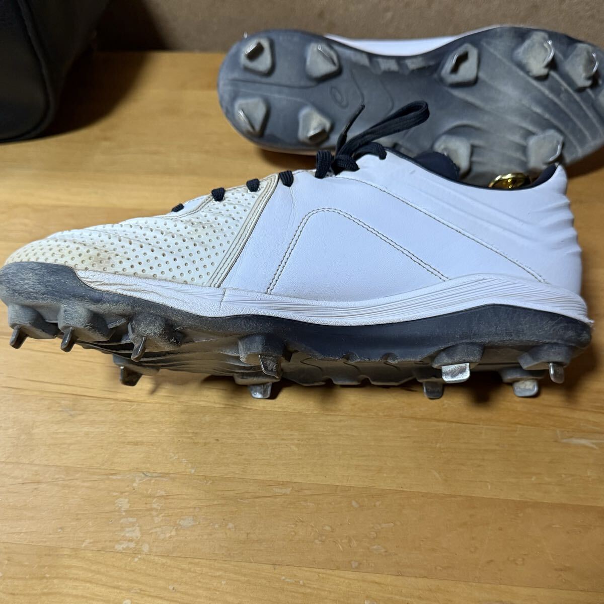 メッシュアッパーのASICSスパイクシューズ、ホワイト/ネイビーの配色で、野球に最適。