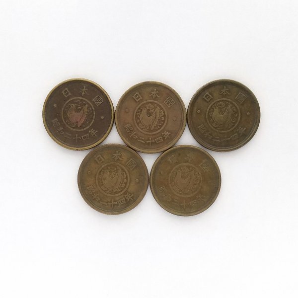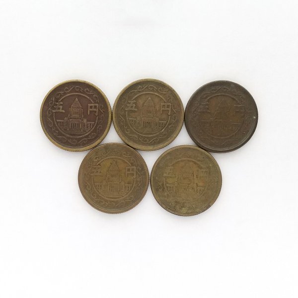 昭和24年 穴なし5円 楷書体 黄銅貨 5枚です。