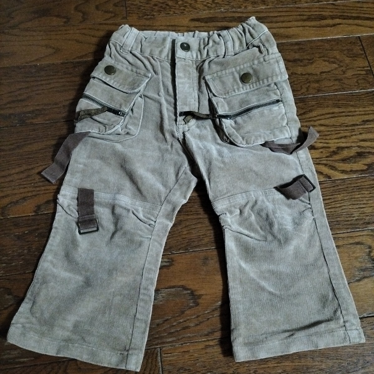 コーデュロイ素材のベージュカーゴパンツ、4つのポケット付きで実用的。