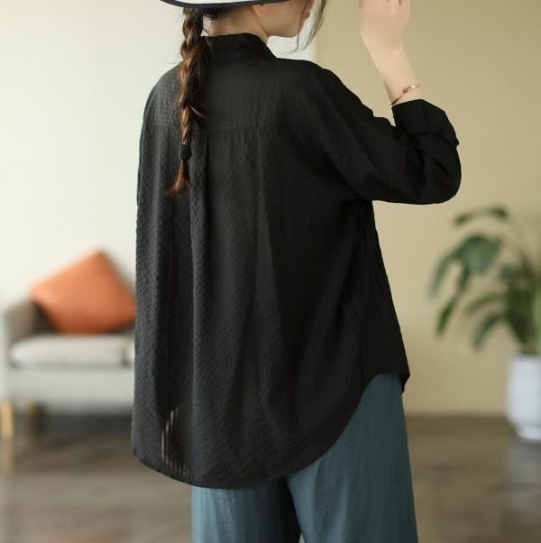 カジュアル 綿麻 シャツ ボーダー柄 大きいサイズ シンプル 長袖 トップス ブラウスシャツ★ブルー/Mサイズ