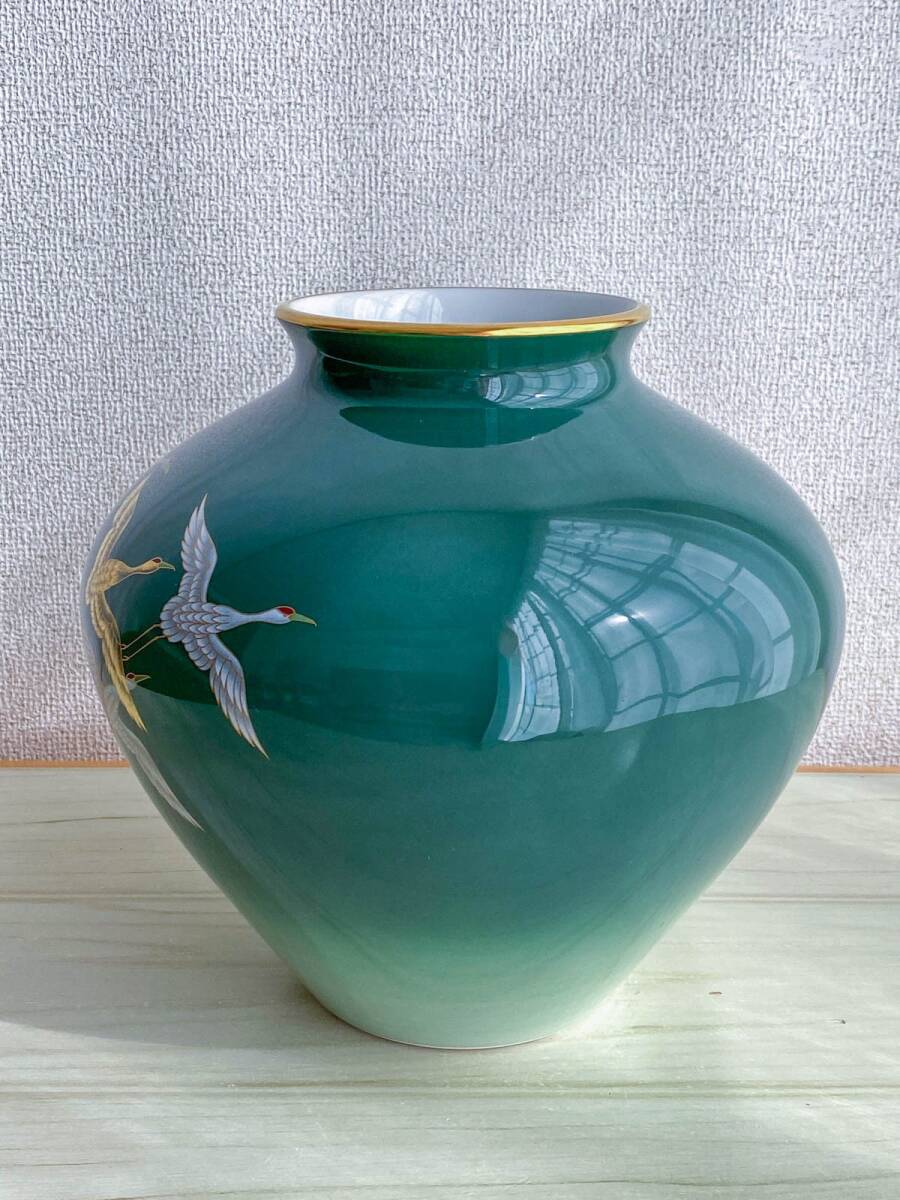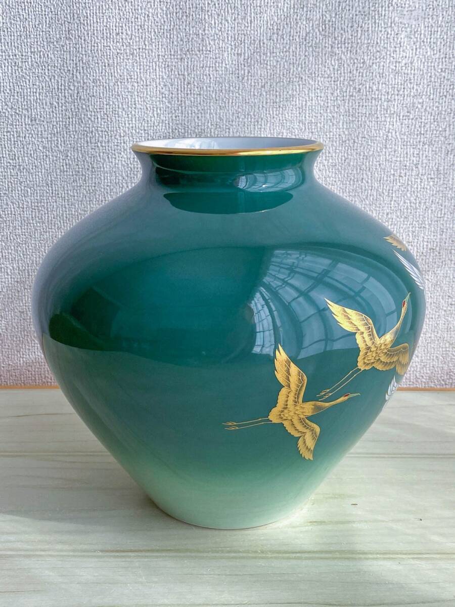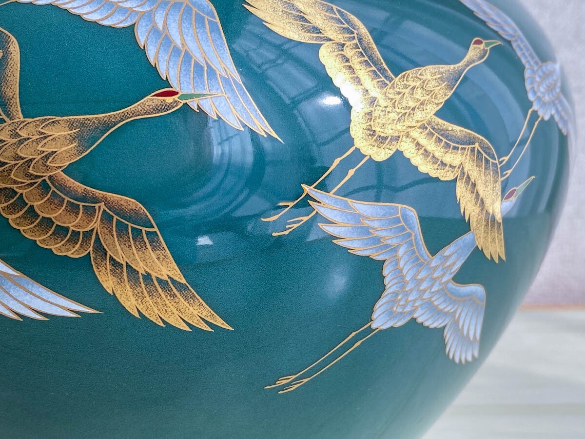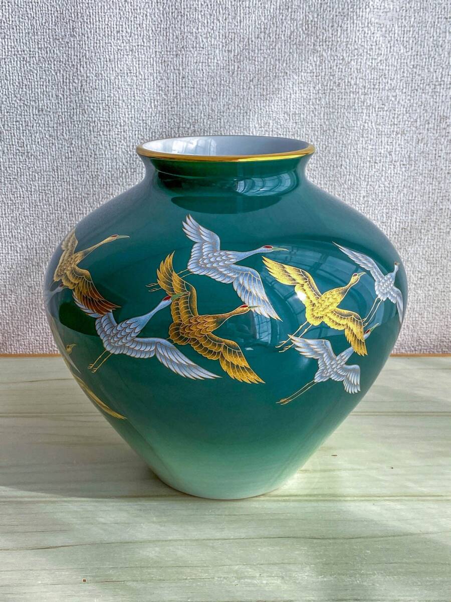 有田焼の老舗、香蘭社製の花瓶です。「鶴の舞」と呼ばれる意匠で、金、緑、銀、白の色鮮やかな金彩鶴絵が豪華な雰囲気を醸し出しています。