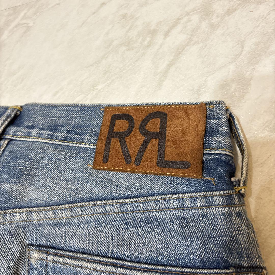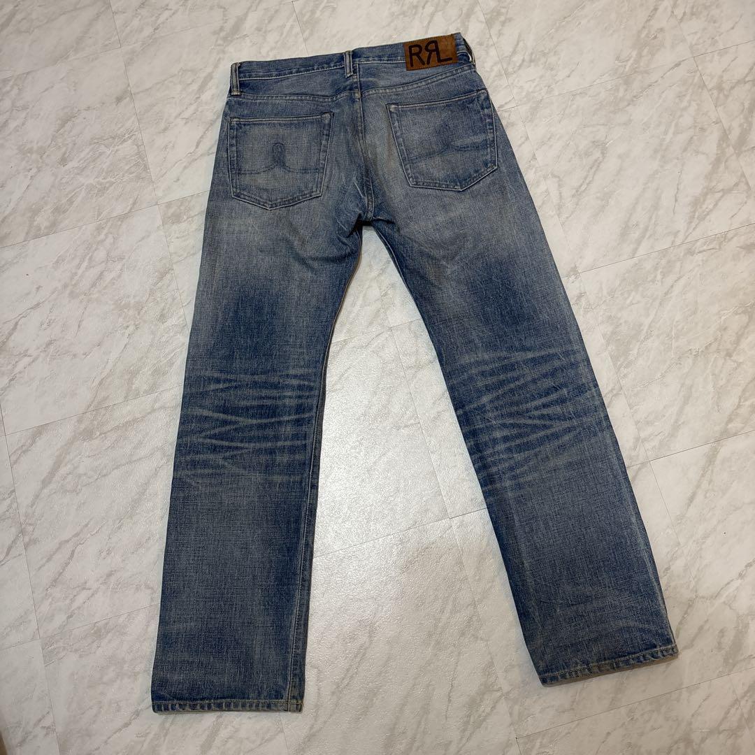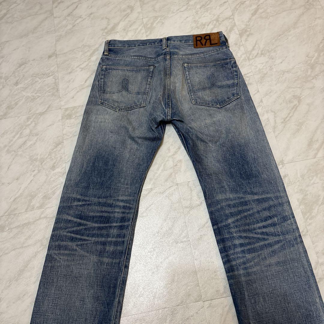 希少 RRL ストレート30 セルビッチ ジーンズ Vステッチ オフセット ヴィンテージ加工 革パッチ チェーンステッチ ボタンフライ デニム デニムパンツ ヒゲ ハチノス 加工 ユーズド加工 ダメージ加工 チェーンステッチ 黒カン ダブルアールエル ラルフローレン