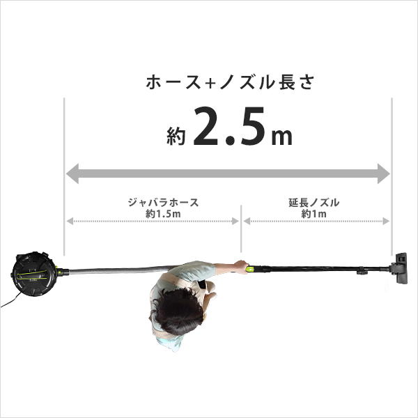 ジャバラホース(1.5m)と延長ノズル(1m)をつけた状態で、最大約2.5m。