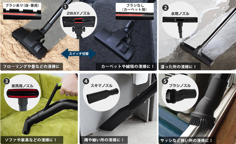 ノズルが5種類付属しており、乾いた場所・湿った場所・隅や狭い場所など様々な用途にご使用いただけます。