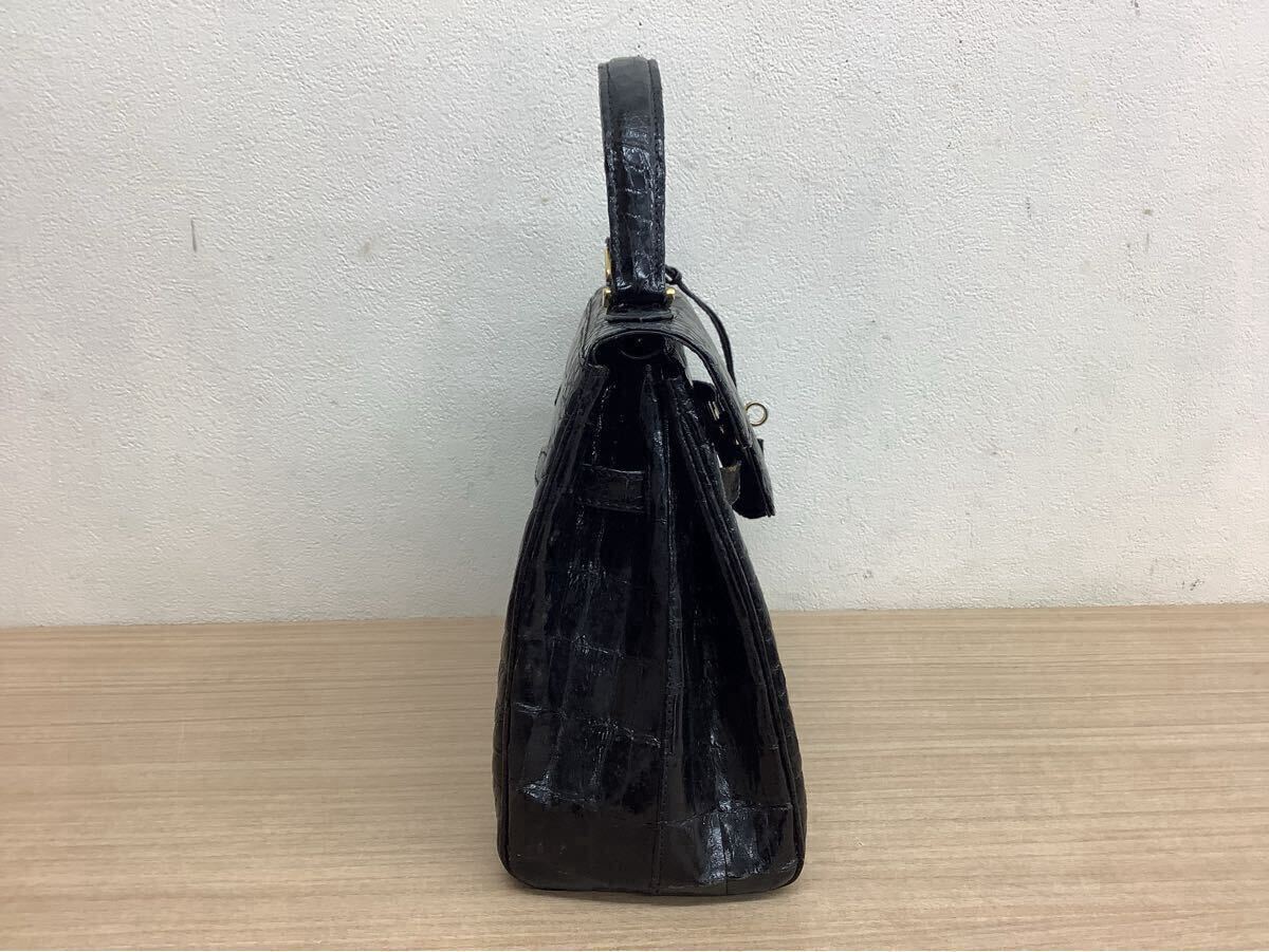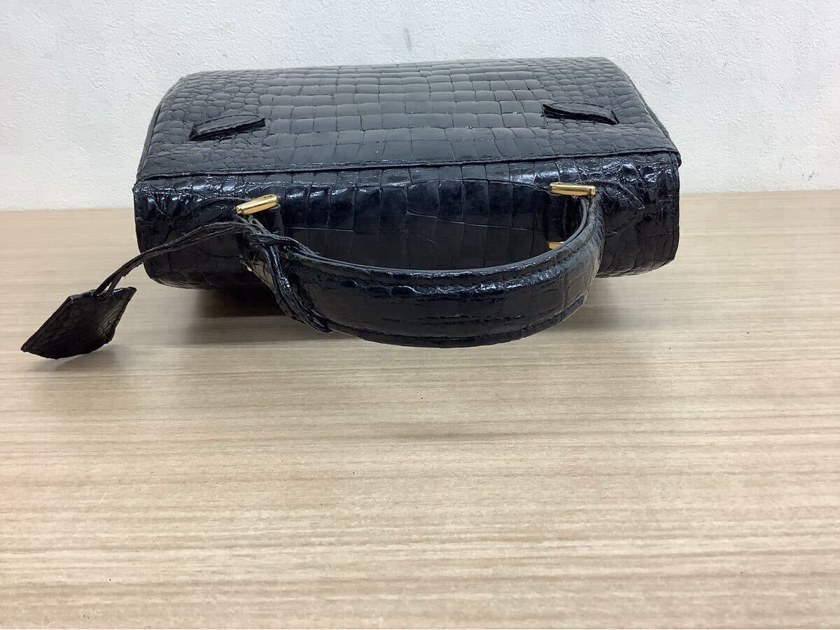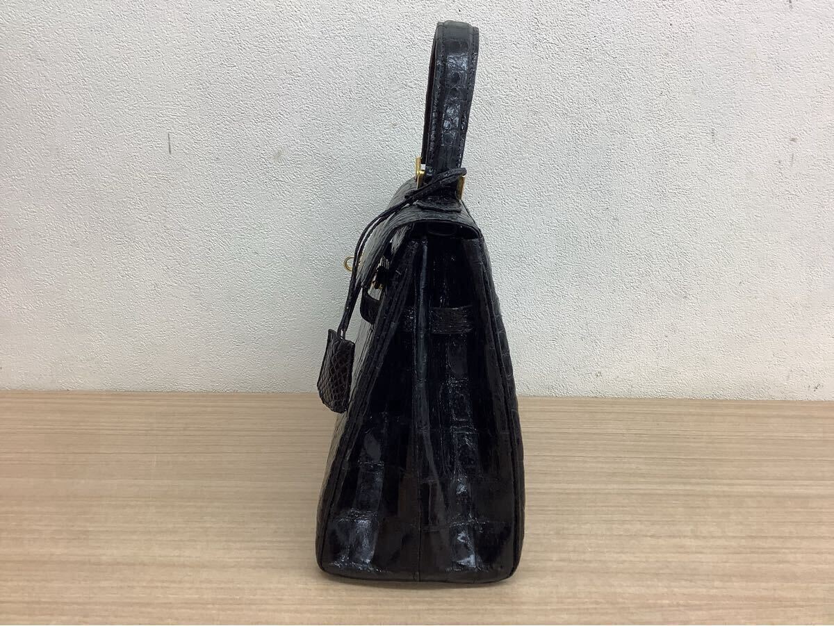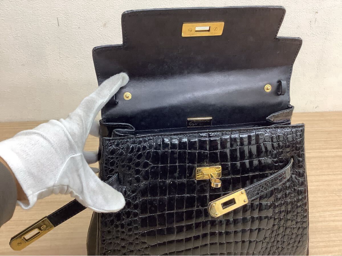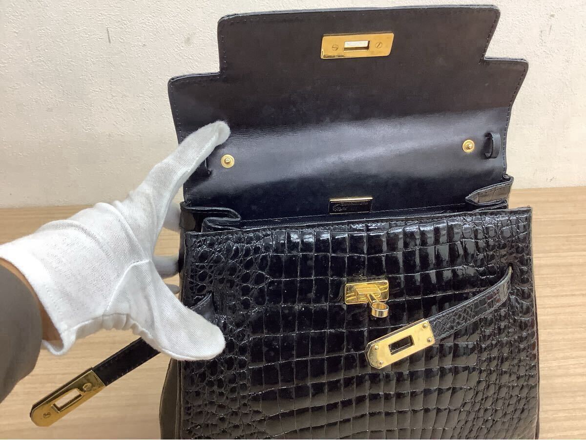 本革 クロコダイル レザー ハンドバッグ KAWO製 ケリータイプ 黒 ブラック ゴールド金具 高級 ワニ革