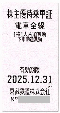 有効期限は「2025年12月31日」です。 本券1枚で1名片道に限り電車全線にご乗車いただけます。 ※詳細につきましては、画像やホームページの株主優待制度をご覧ください。 |