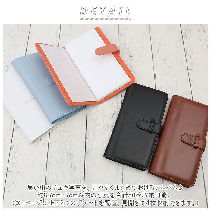 商品説明 | ・・思い出のチェキ写真を、見やすくまとめておけるアルバム♪ ・約8.7cm×7cm以内の写真を合計80枚収納可能。(※1ページに上下2つのポケットを配置、見開きで4枚収納できます。) ・手触り滑らかなPUレザー素材を使用。手帳のような見た目で高級感を演出。 ・しっかりホールドしてくれるベルトループ付き。 ・縦型のスリムタイプだから、カバンにサッと収納可能。持ち運びがラクラク。 ・チェキ写真はもちろん、カードやシールを入れてもOK! |