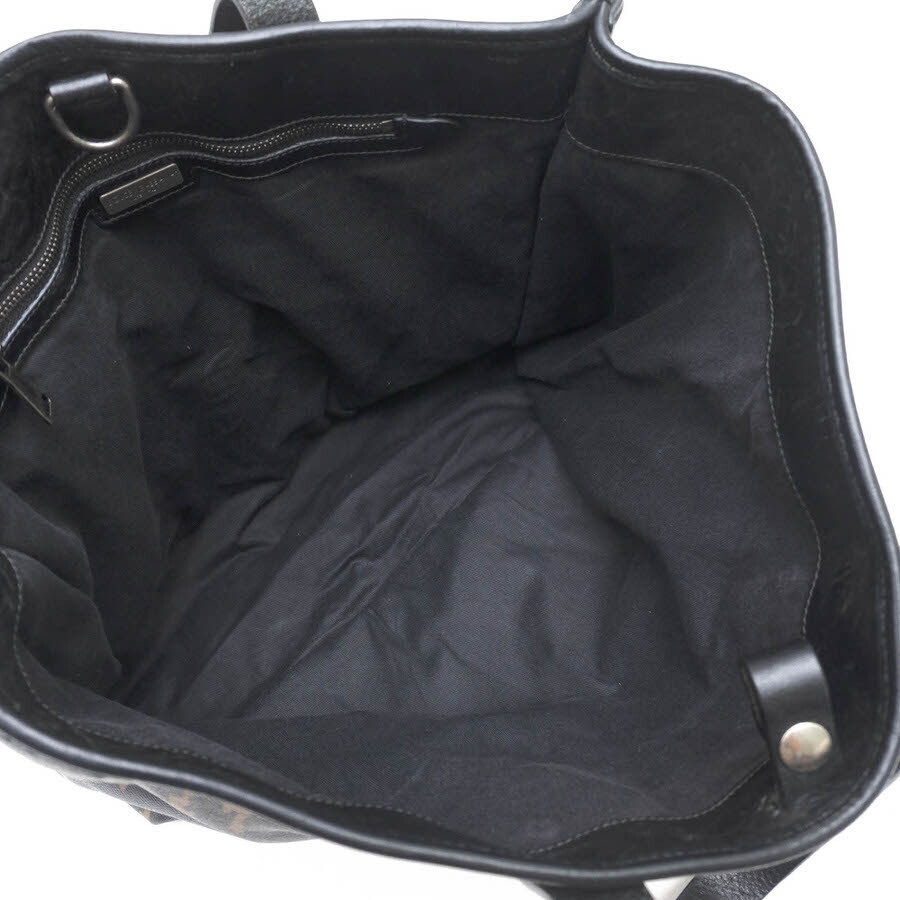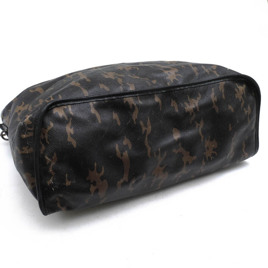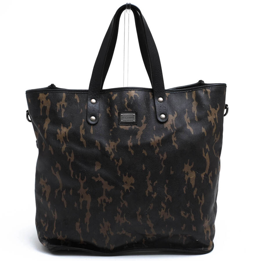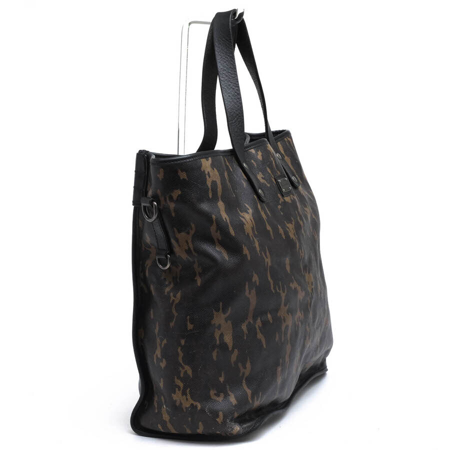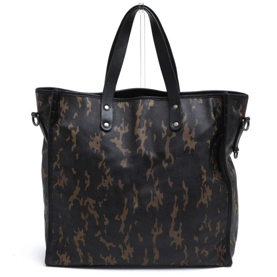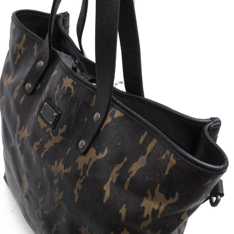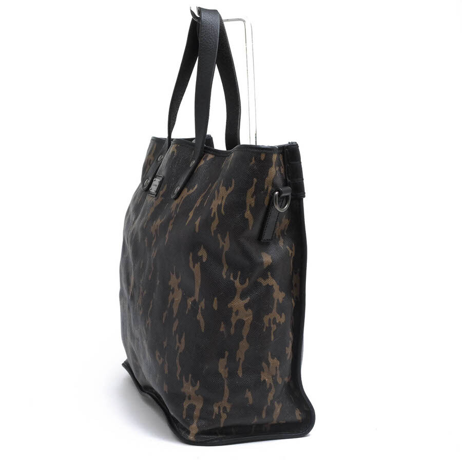 迷彩柄にブランドロゴプレートがデザインされたトートバッグ。PVCコーテッドキャンバスと牛革のコンビで、撥水性能も高く、耐久性に優れています。メインコンパートメントはスナップボタンで開閉でき、内ポケットも備えているため、小物の整理も容易です。 |
