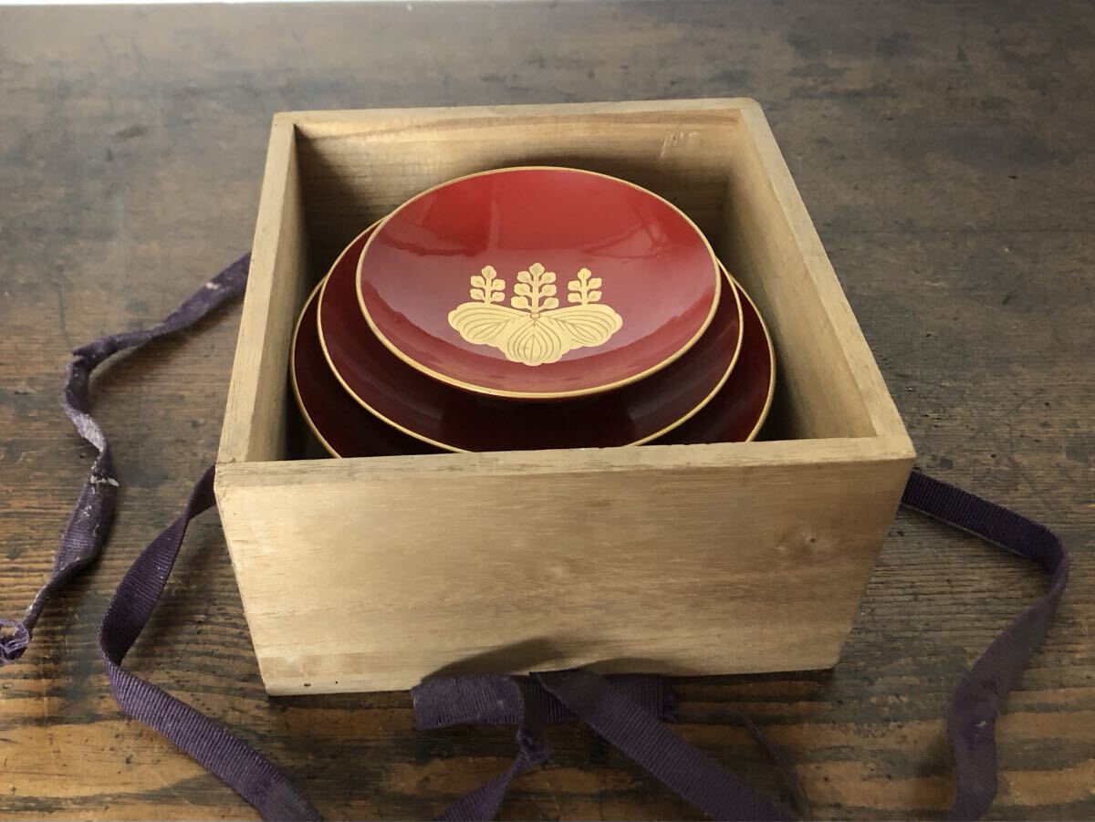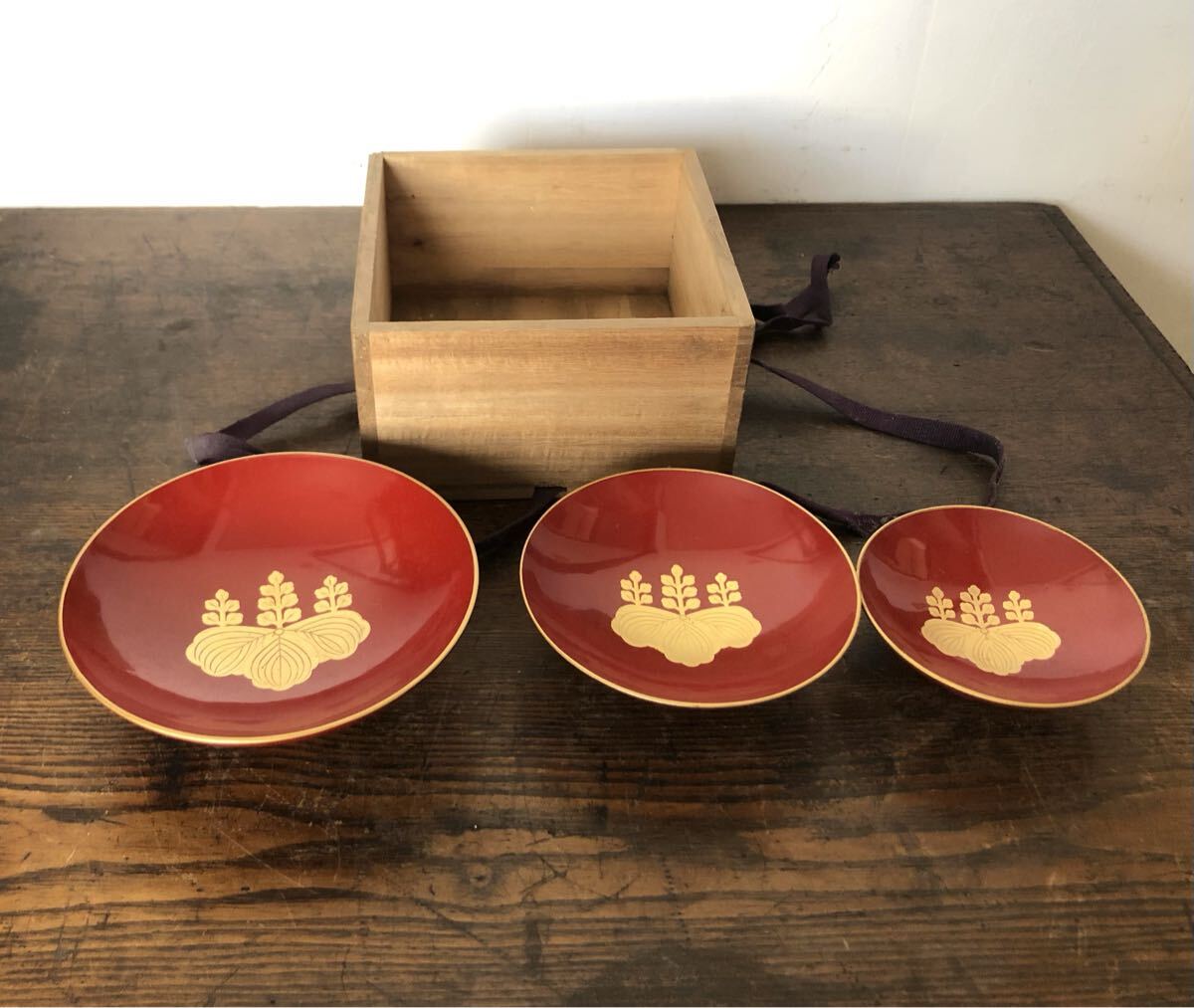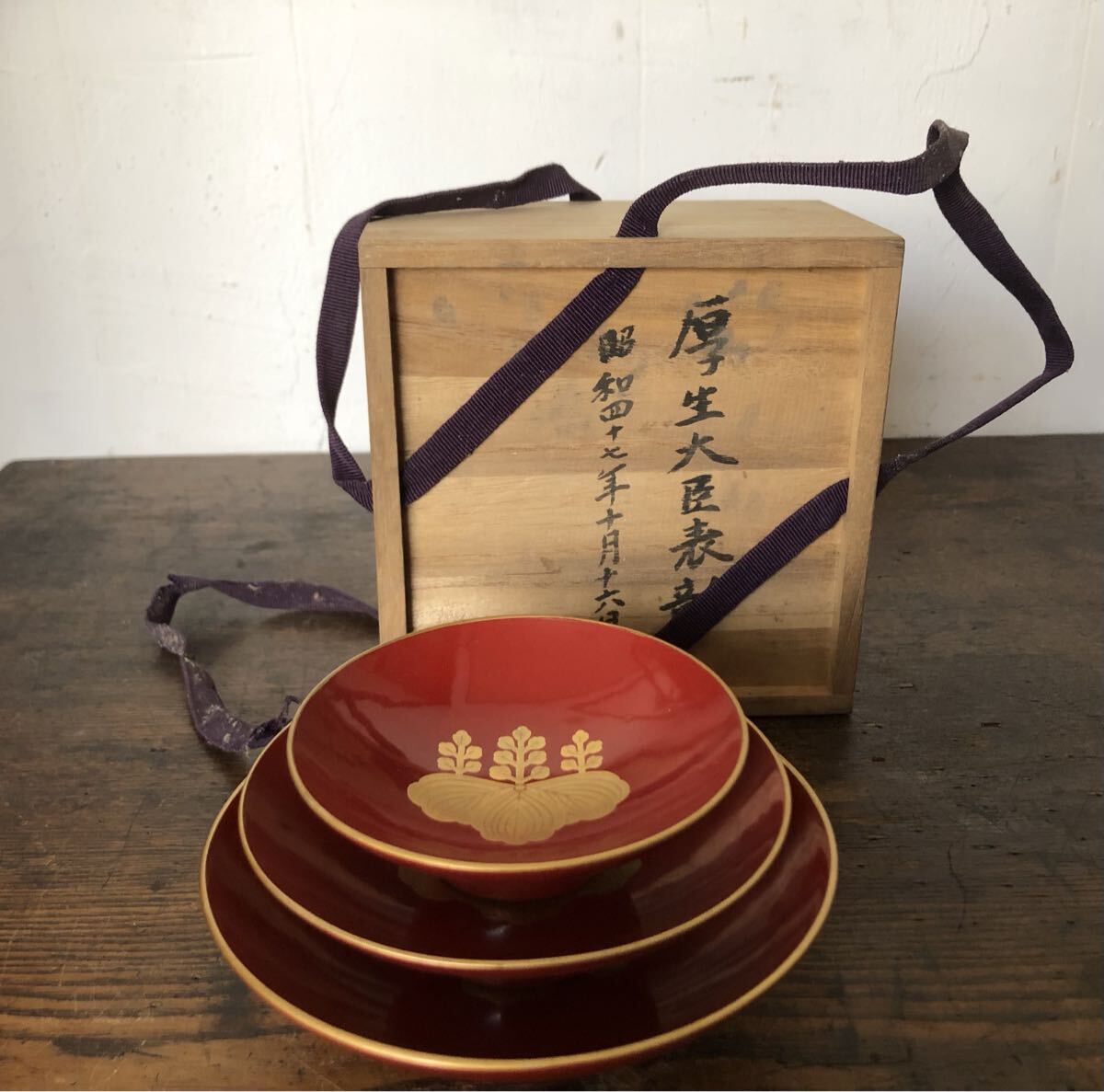 商品名 : 漆器 盃/ 杯/三つ組/五七の桐紋/厚生労働大臣/ 酒器/ 木箱/蓋なし