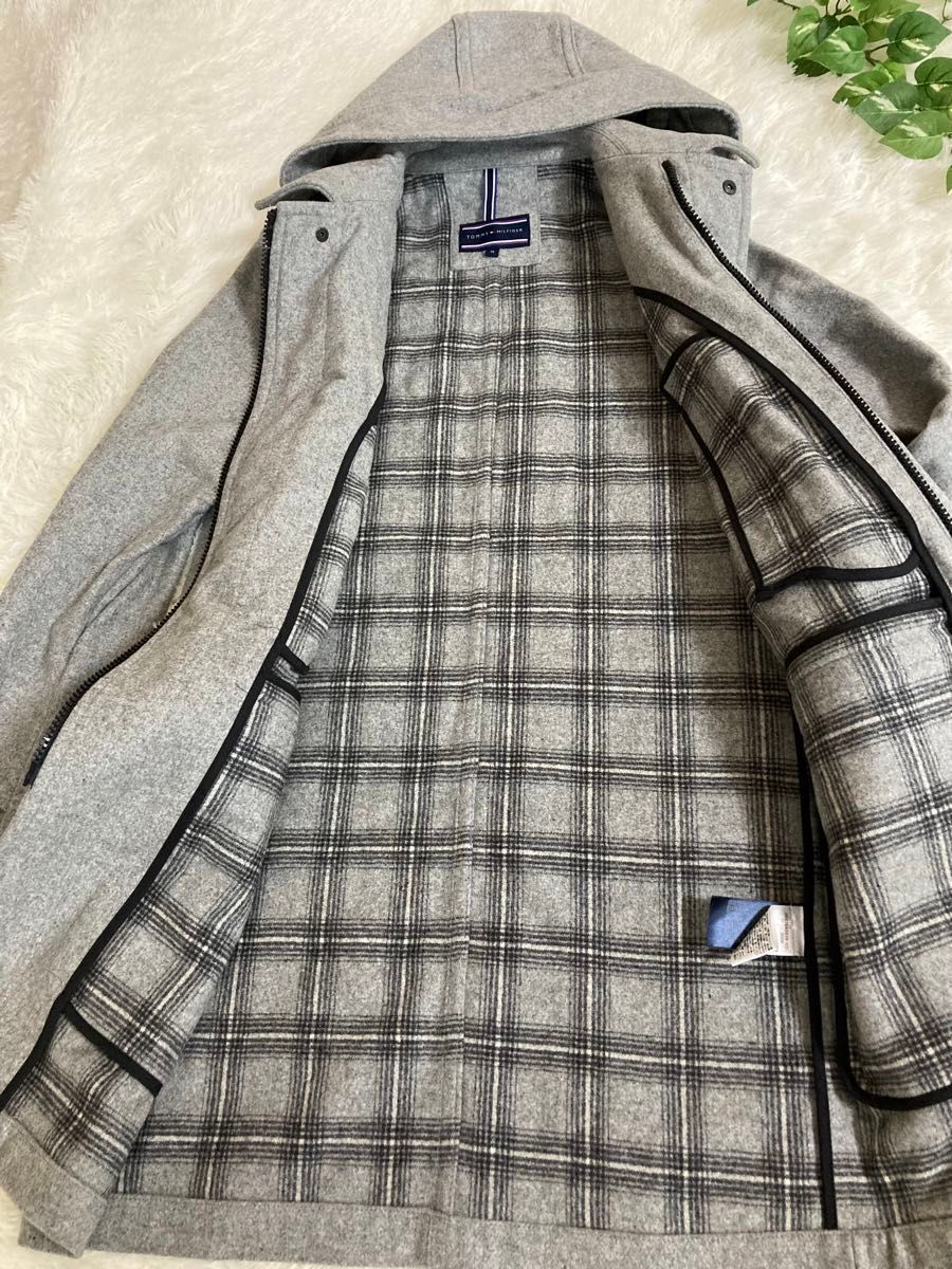 ウール・カシミア混のグレーのダッフルコート、チェック柄の裏地付きで、フードが特徴的です。