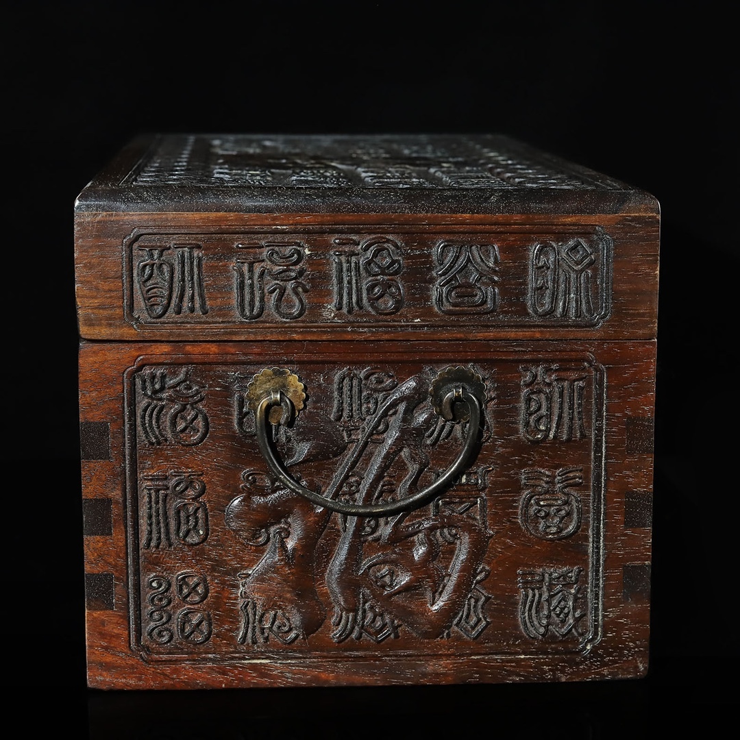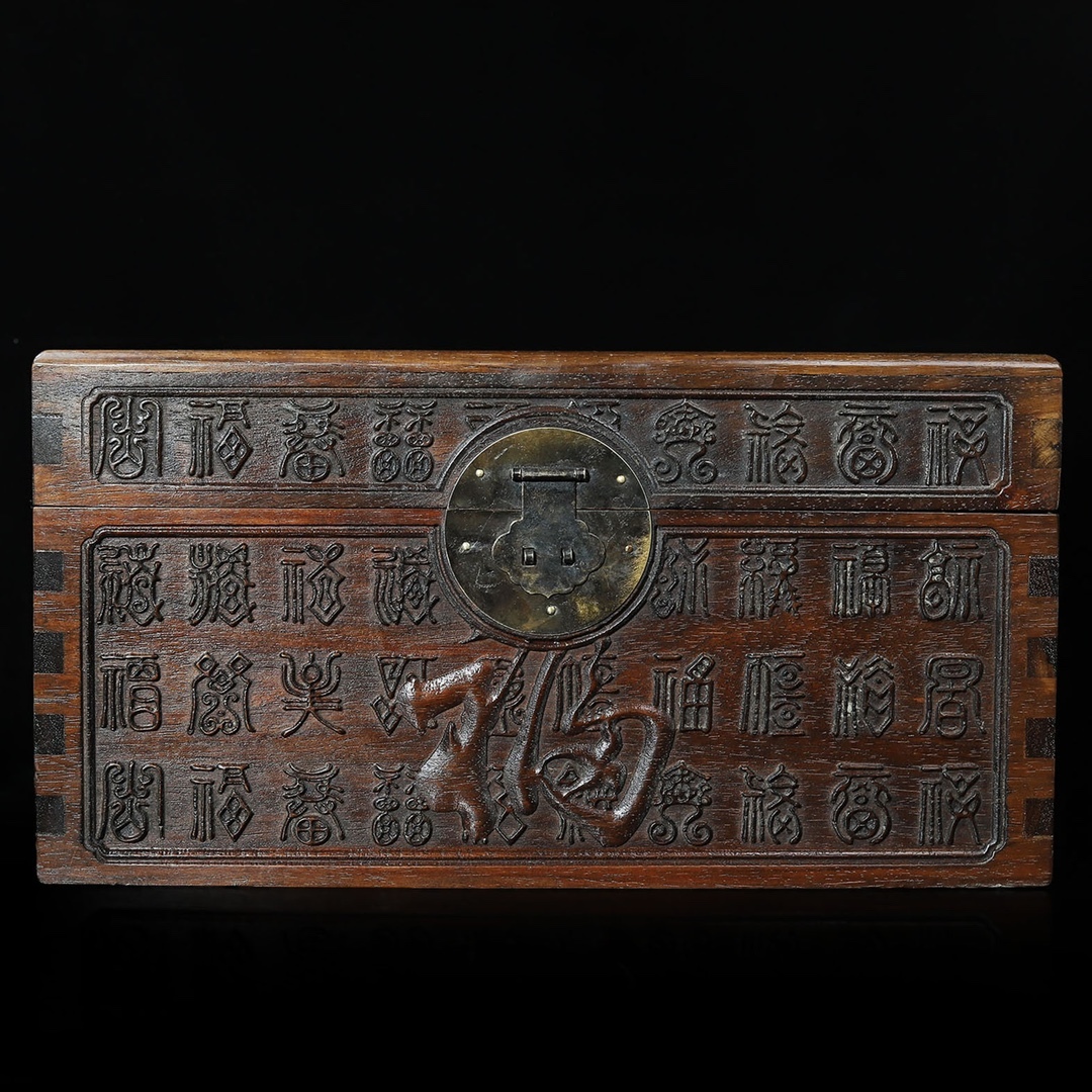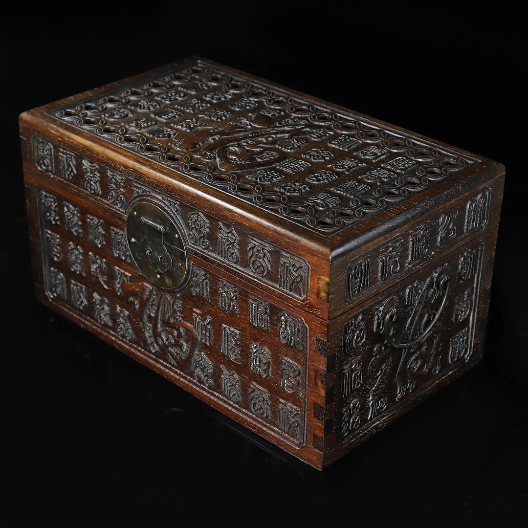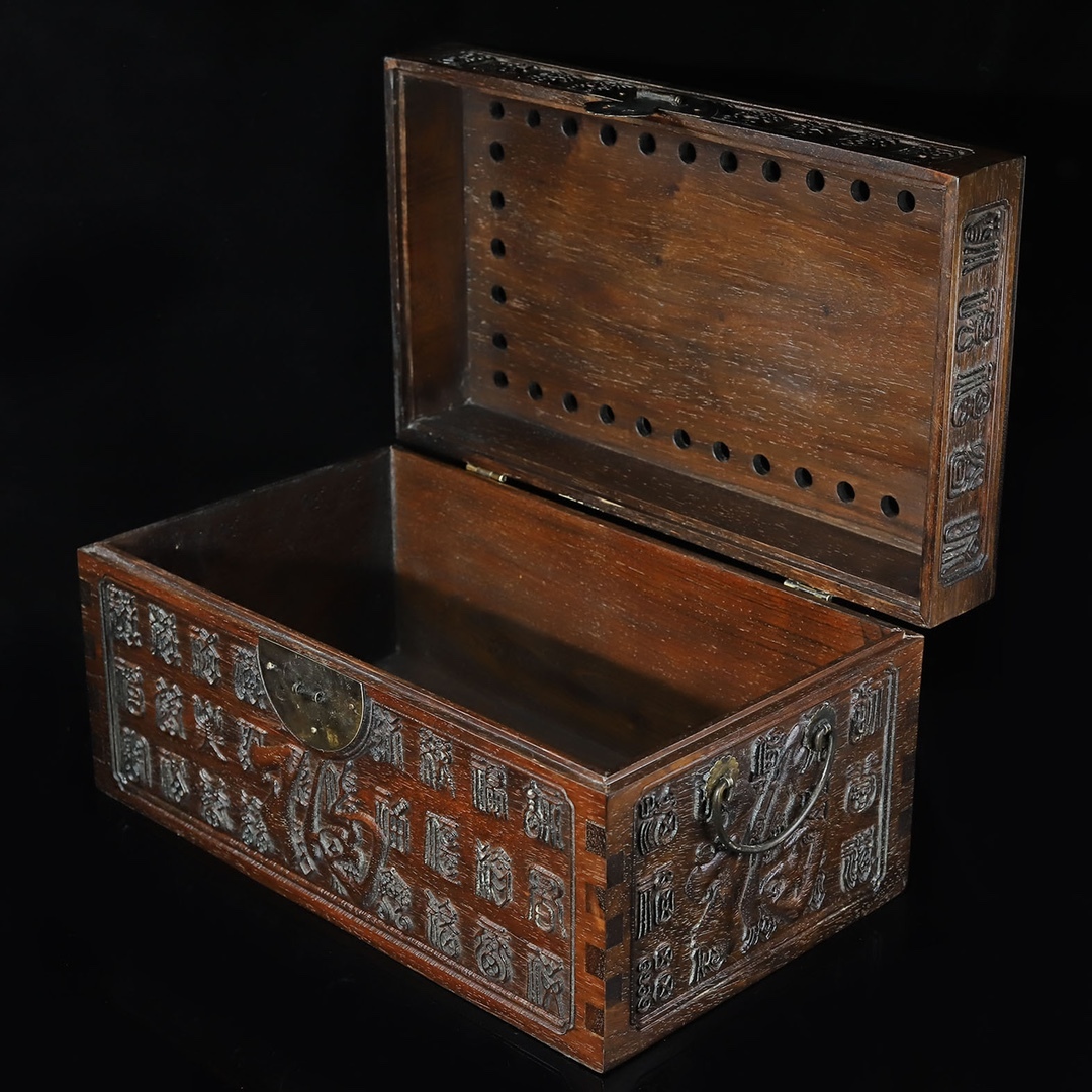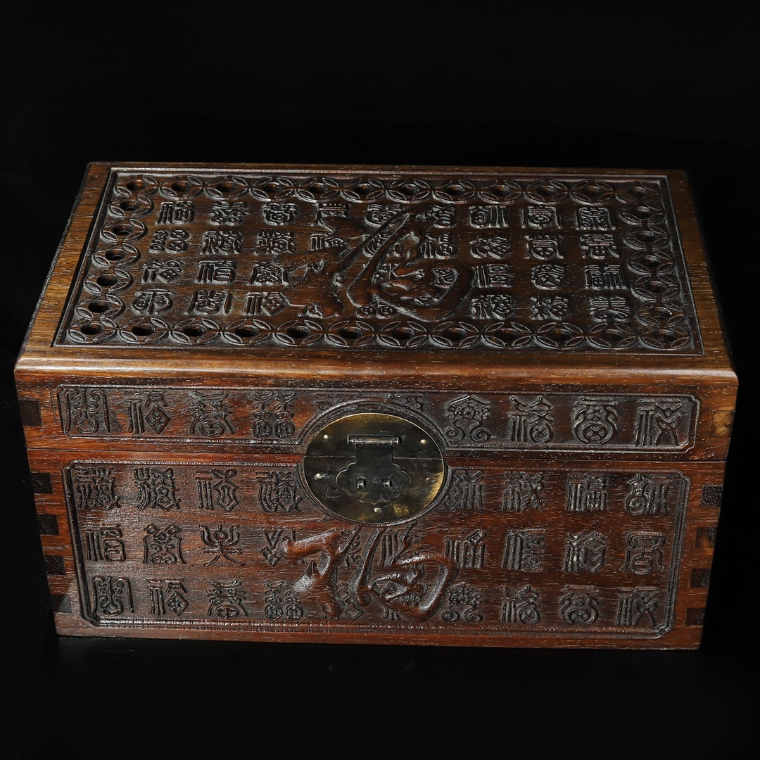 清時代 古花梨木彫 空彫 福字 百福 長盒 收納盒 儲物箱 收納箱 古玩家具 文案置物 擺件 時代物 骨董品 旧家蔵出し 唐物 中国古玩 古美術品