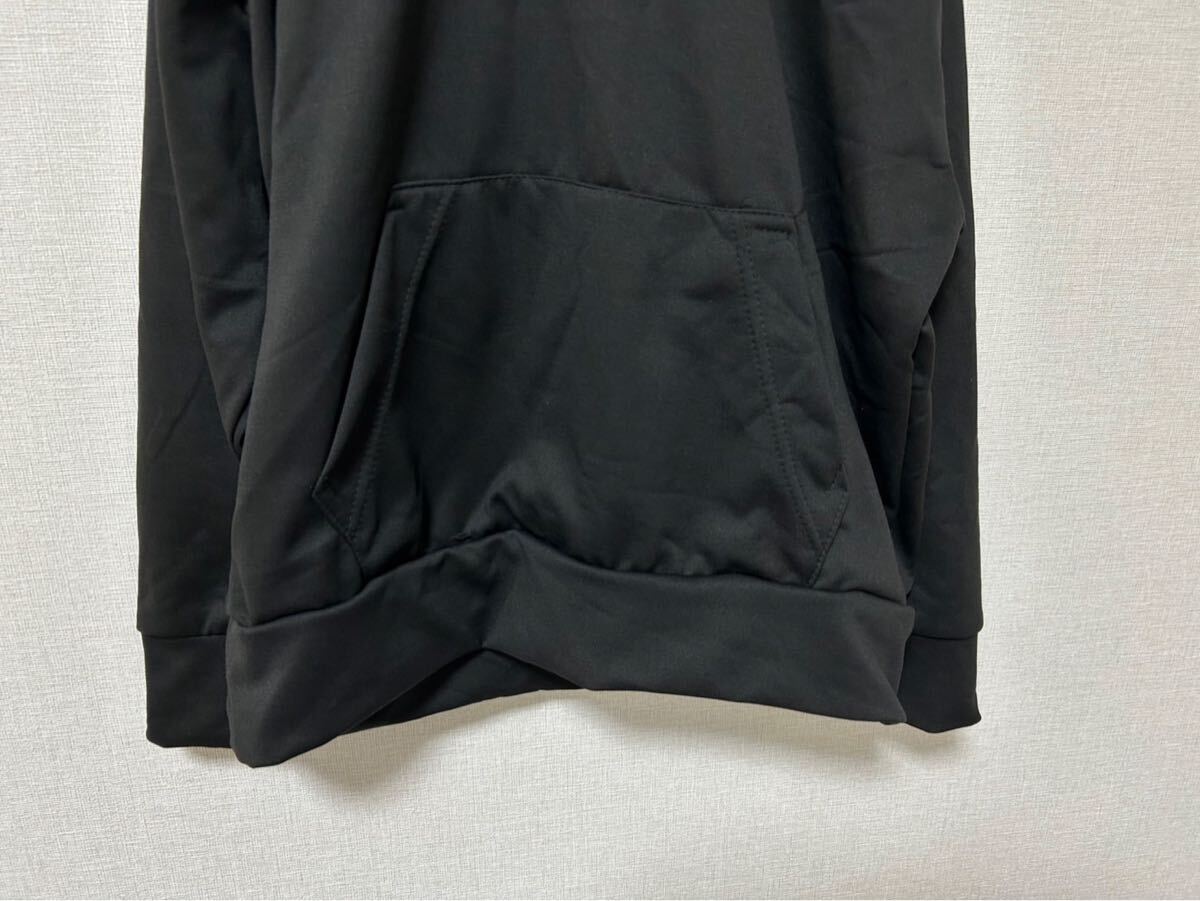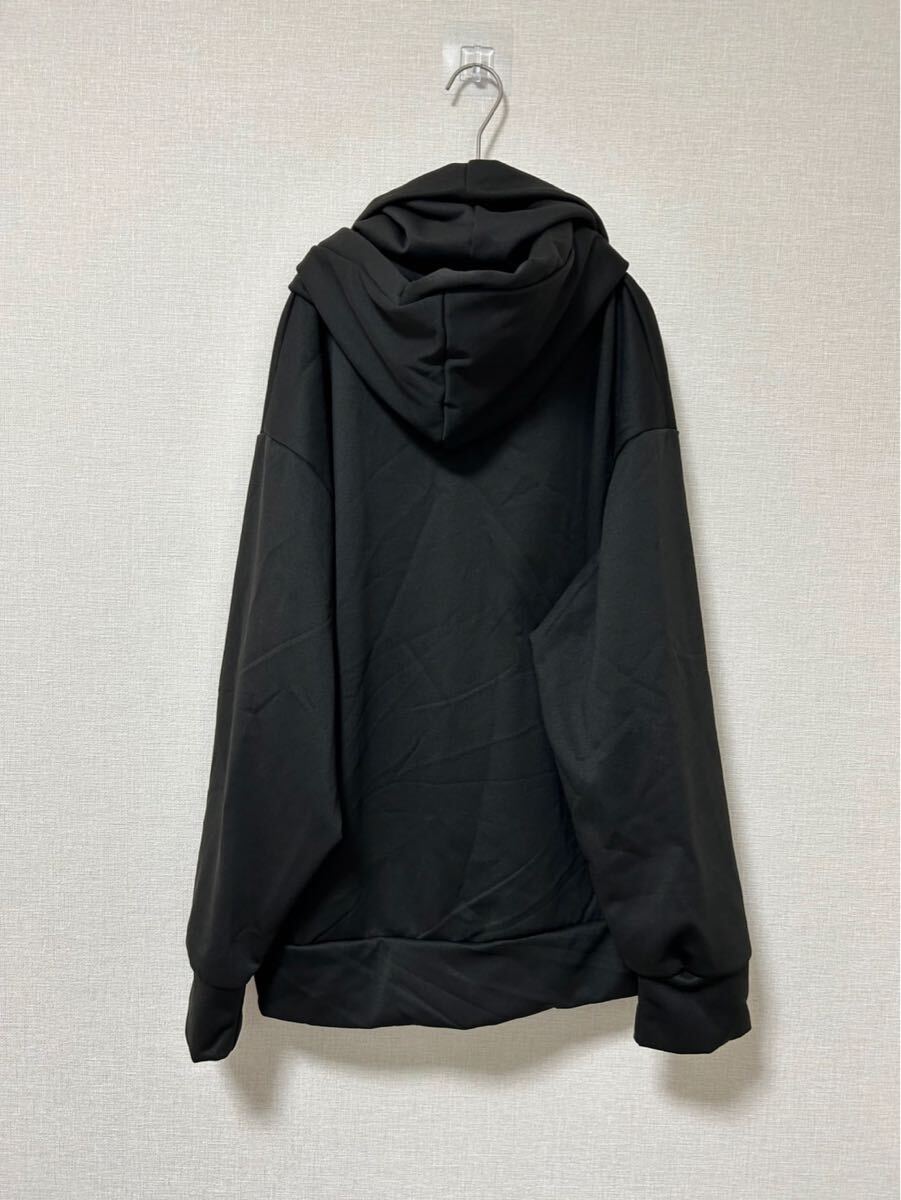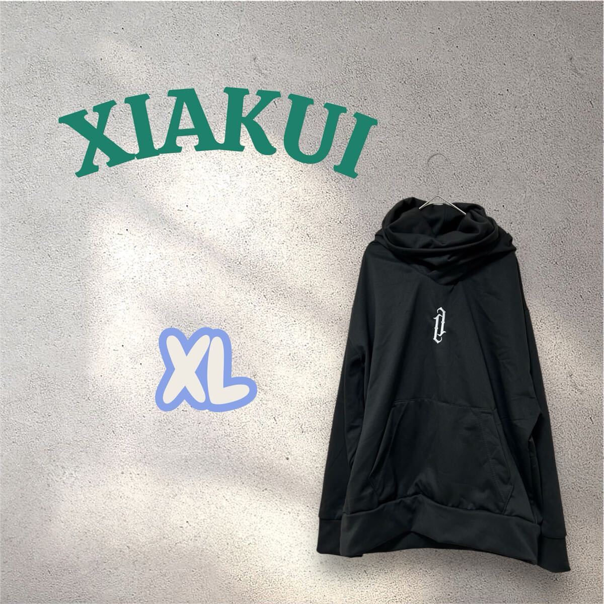 シンプルなデザインのブラックXLパーカー、フロントポケット付き。