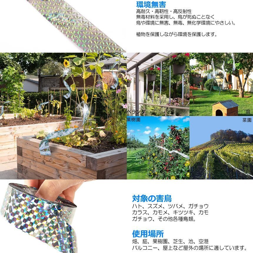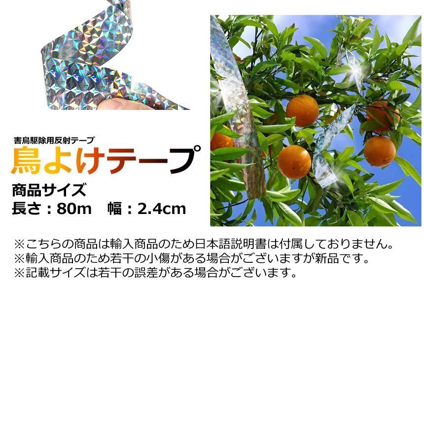 | 送料無料!!! 送料及び下記のご案内をご確認の上、ご入札お願い致します。 離島地域を除く九州、四国、本州まで送料無料。 ※北海道は+1000円、離島地域及び沖縄県は+3000円にて承ります。(発送前に加算) ※画像内にカラー及びサイズ等の選択が可能と記載がある場合がございますが、 お届けする物はタイトルまたは商品説明文に記載の物です。 ★※注文後のカラー変更や異なるカラー・サイズ指定等は一切承っておりません。 ※★※仕様(ロゴデザイン/ロゴ有無等も含む)は予告なく変更する場合があります。 ※多少の汚れや小傷がある場合がございますがご了承ください。 梱包は簡易包装ですので、箱の角落ち等はご了承願います。 【商品説明】 \カラス・野鳥のゴミ散乱や糞害にお困りの方へ!!/ ホログラフィック加工の鳥除けテープです。 貼るだけ簡単♪ 両面に鏡面反射があり鳥の嫌がるきらめきを発揮!! 耐久性のあるホログラフィック防虫反射テープ ぶ厚く強い耐候性、長期間にわたりアピールします。 長期間に太陽の光を反射させ、害鳥を遠ざけます。 組み立て等が不要の貼り付けタイプだから 場所も選ばずどこでもご使用いただけます。 【様々なシーンで活躍!】 お庭/田畑/お店/オフィス/公園/池/プール/自宅 ベランダ等の様々な場所であらゆる鳥たちを遠ざけます。 ============= 【商品仕様】 サイズ:長さ50m 幅24mm ※ロール芯のカラーは入荷時期により変更される場合がございます。 ※非粘着式です ※日本語説明書は付属しておりません ※モニタにより若干色味が変化する場合がございます ※輸入品ですので多少の臭いやスレ傷、汚れはご了承ください ※サイズは実寸ですが若干前後する場合がございます ============= ※詳細は画像にてご確認ください ![]() ![]() ![]() ![]() ![]() |