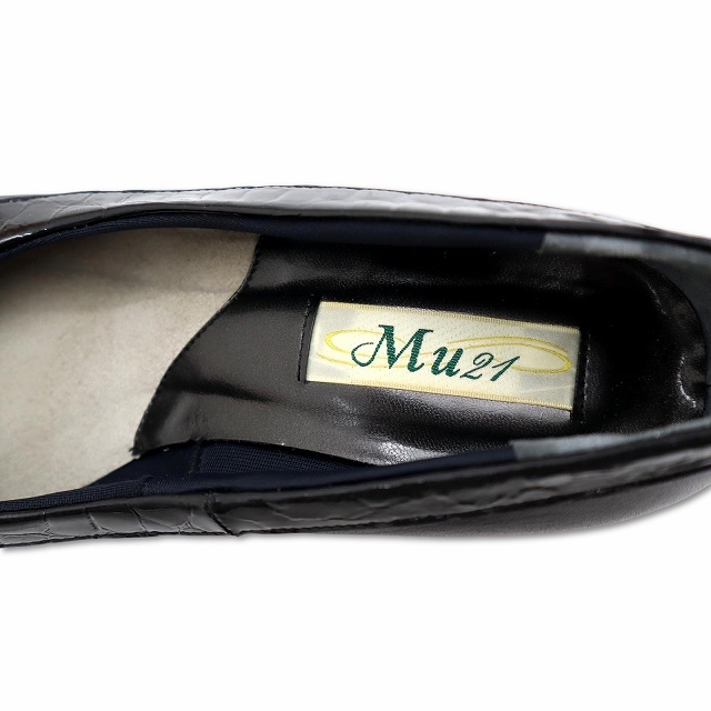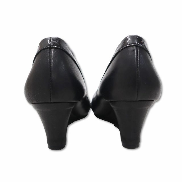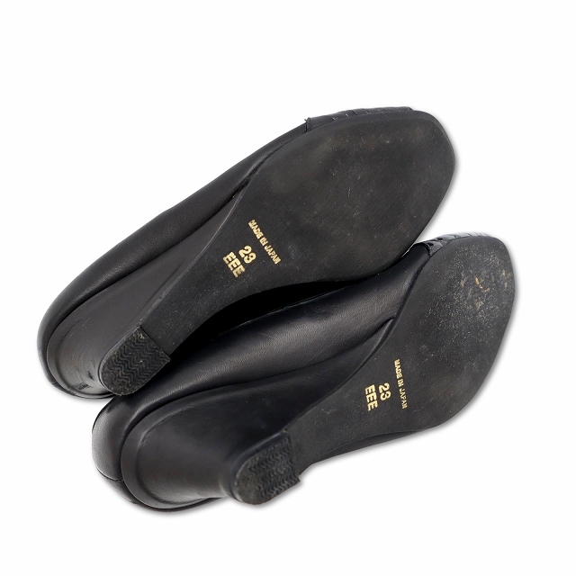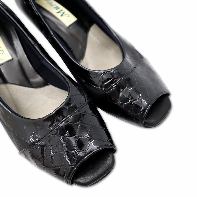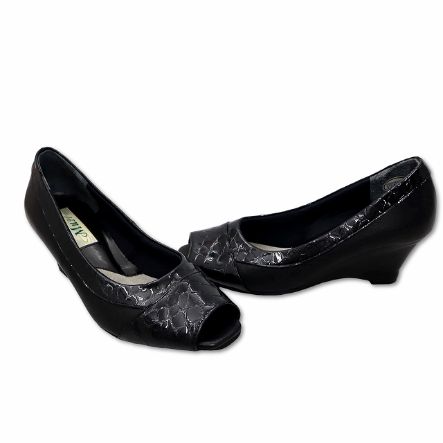 エナメル 型押し × レザー オープントゥ ウェッジソール パンプス 23 ブラック レディース
