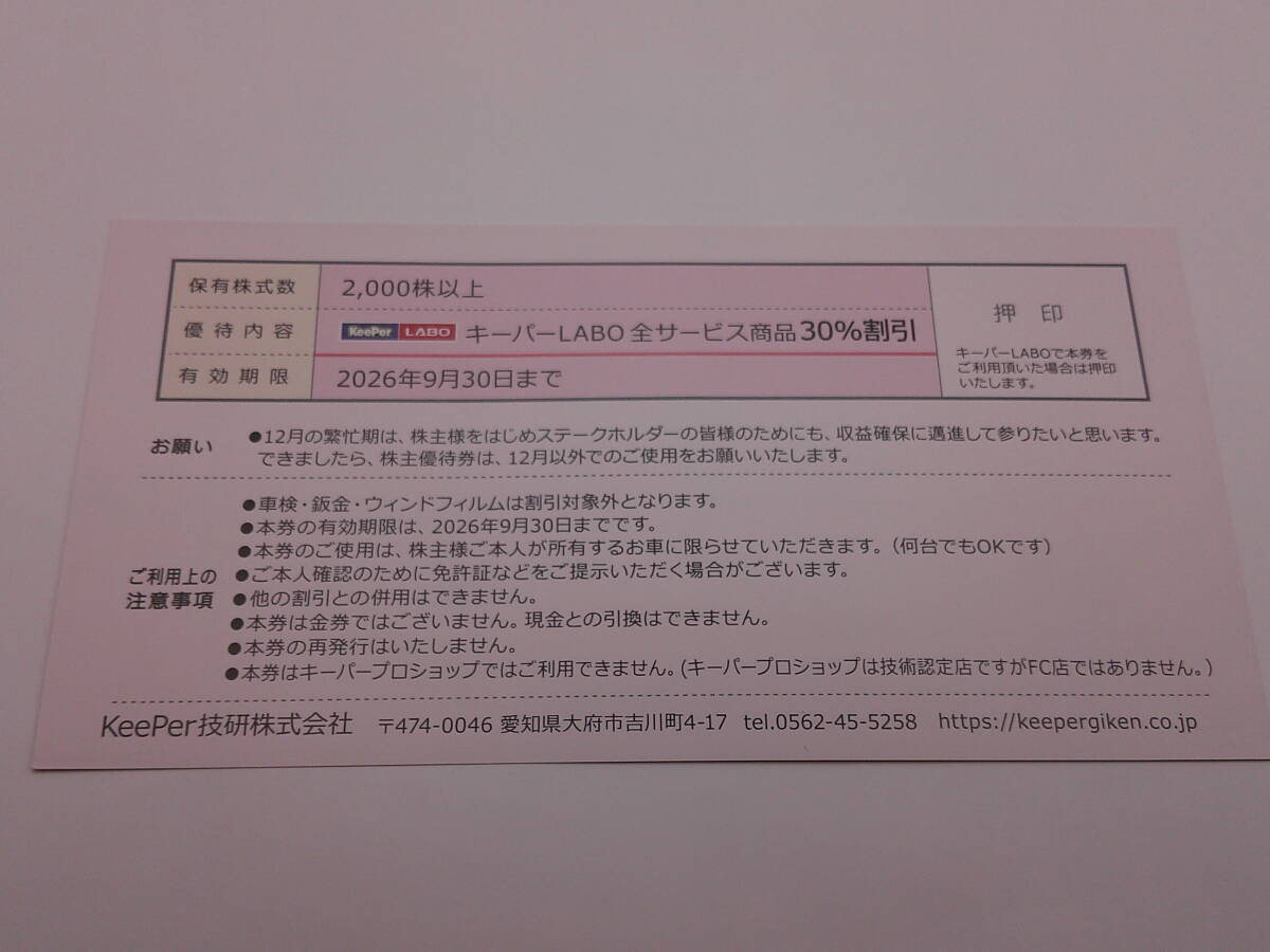 KeePer技研株主優待券(30%割引)1枚 キーパーLABO