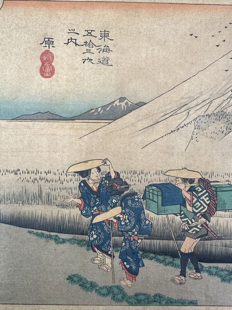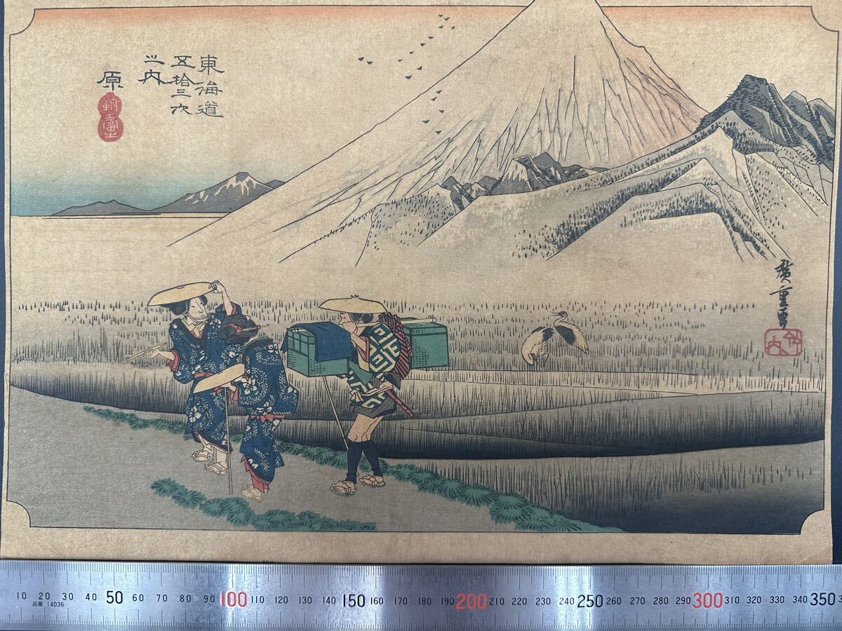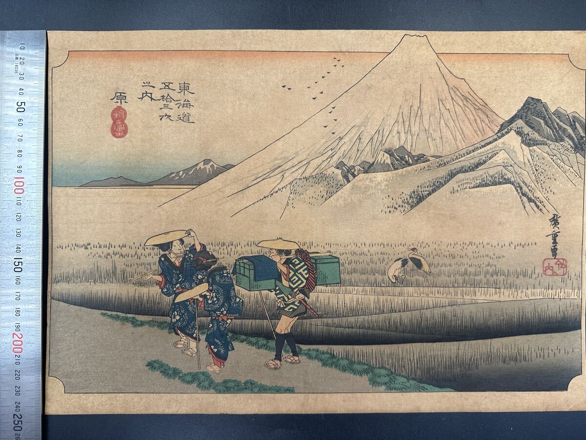 【真作】江戸期 本物浮世絵木版画 歌川広重「東海道五拾三次之内 原 朝之富士」名所絵 大判 錦絵 保存良い