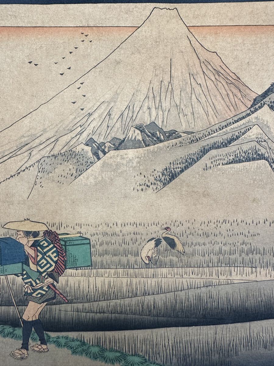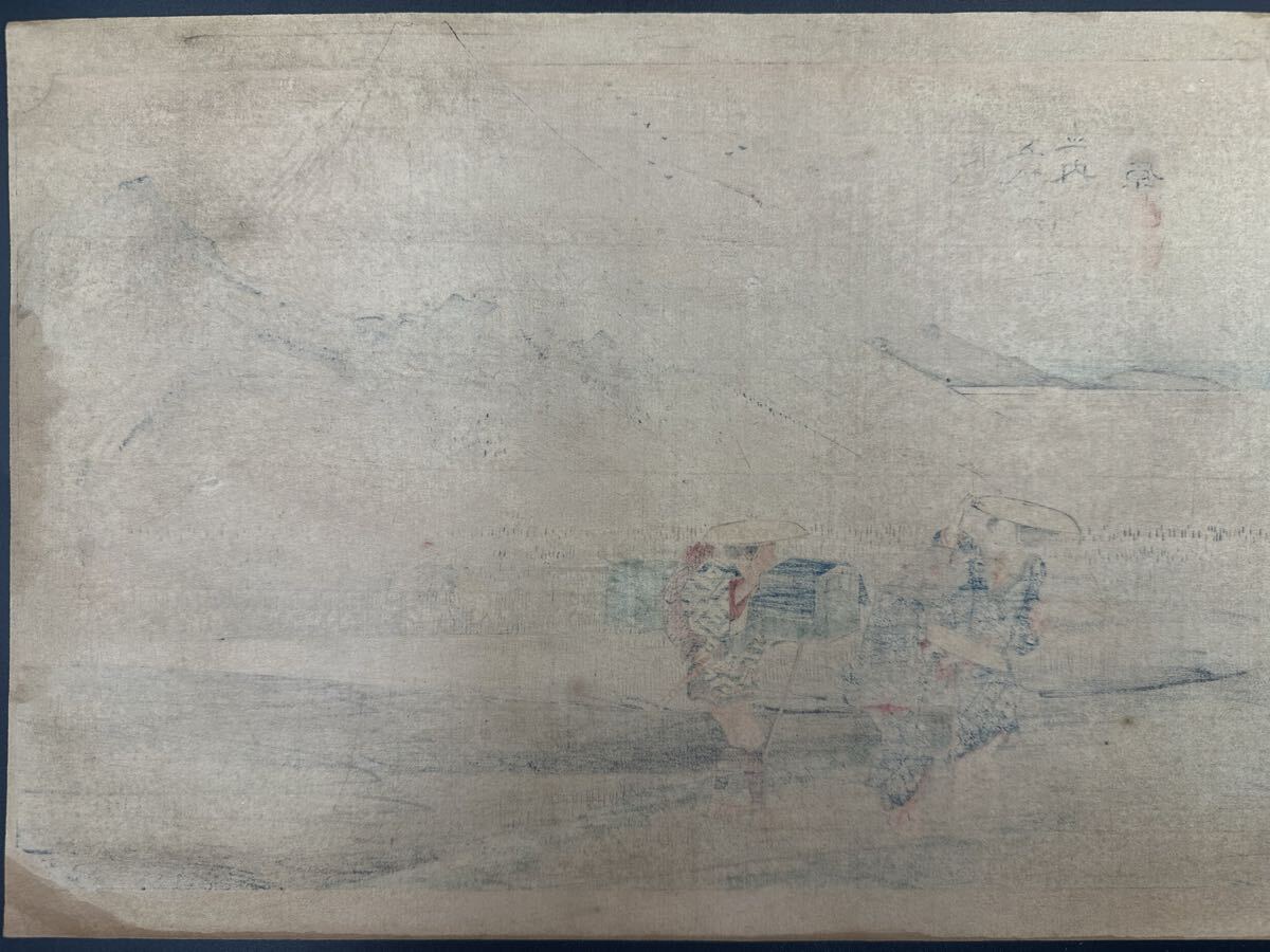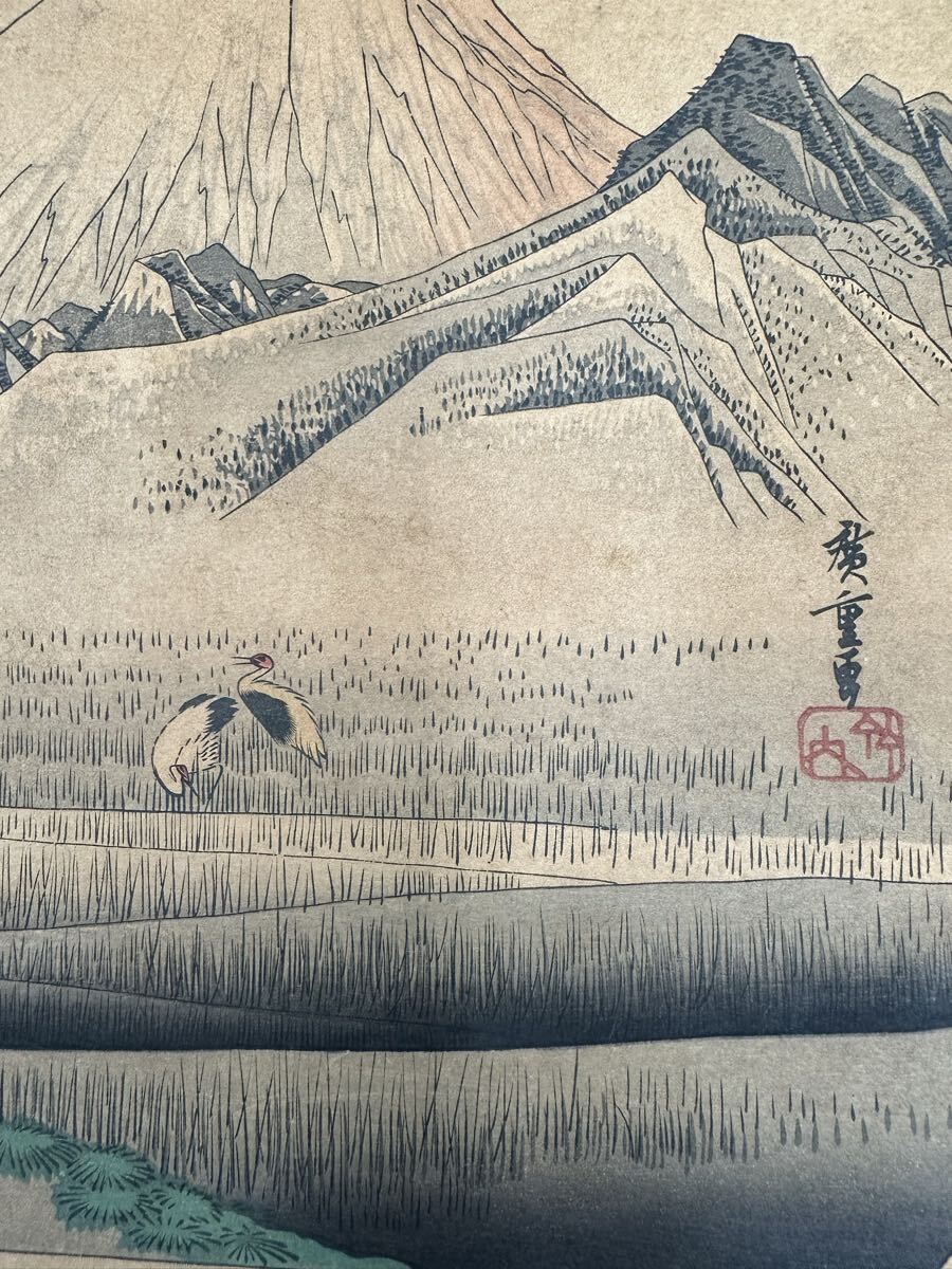 【真作】江戸期 本物浮世絵木版画 歌川広重「東海道五拾三次之内 原 朝之富士」名所絵 大判 錦絵 保存良い