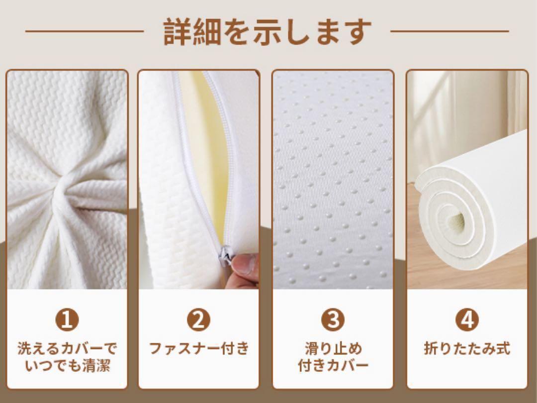 【こだわりの素材・取り外せる外カバー】オリジナルカバーは優しい肌触りで、抗菌・防ダニ・防臭が対応しています。さらにインナーカバーが付いており、本体の劣化を防ぎ、清潔度も確保できます。カバーの裏面はフローリングでも滑りにくいノンスリップ仕様、ズレにくいから安心してご利用いただけます。外側カバーがファスナーで簡単に着脱し、洗濯でき、常に清潔を保つことができます。また、収納袋が付属しているので、使わないとき収納しスペースを有効に活用していただけます。