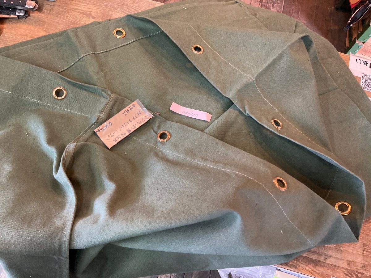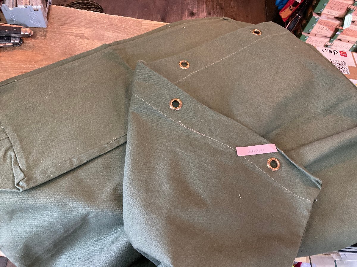 写真の1.2枚目の写真は流用です。実物は3枚目の写真のように淡い緑です。ぶ厚いキャンバス製で実によい味のある一品。「パッキングの原点はダッフルバッグから」とも言われる様に、コレを使いこなせたらアウトドアのプロと呼ばれるかも?サイズはべたおきで高さ約80cm×直径約42cm程度。沖縄離島を除く全国500円でお送りいたします、落札価格にプラスでお願いいたします。キャンプ用品