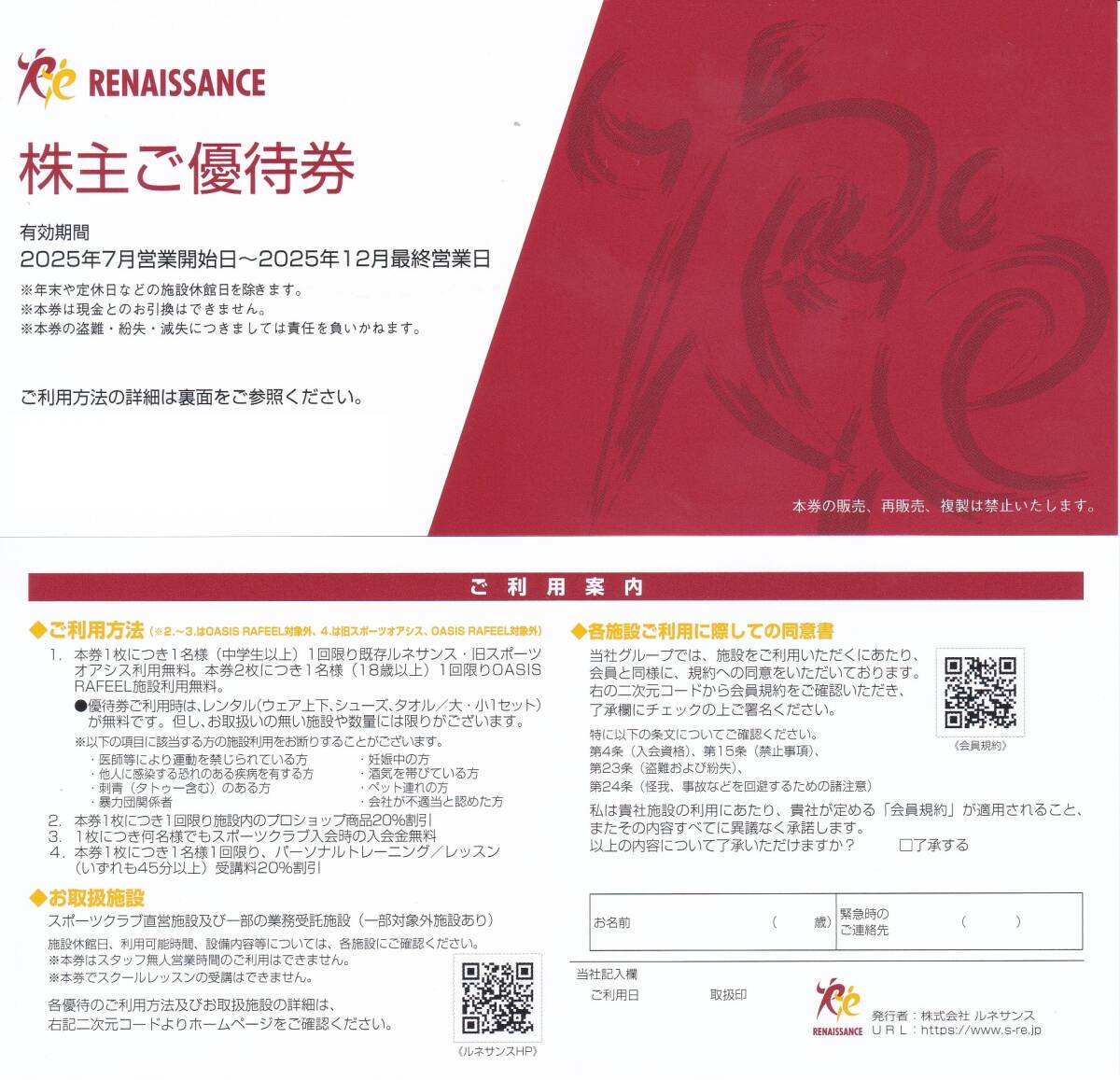 【1枚1280円】ルネサンス株主優待 フィットネスクラブ・ダイエット