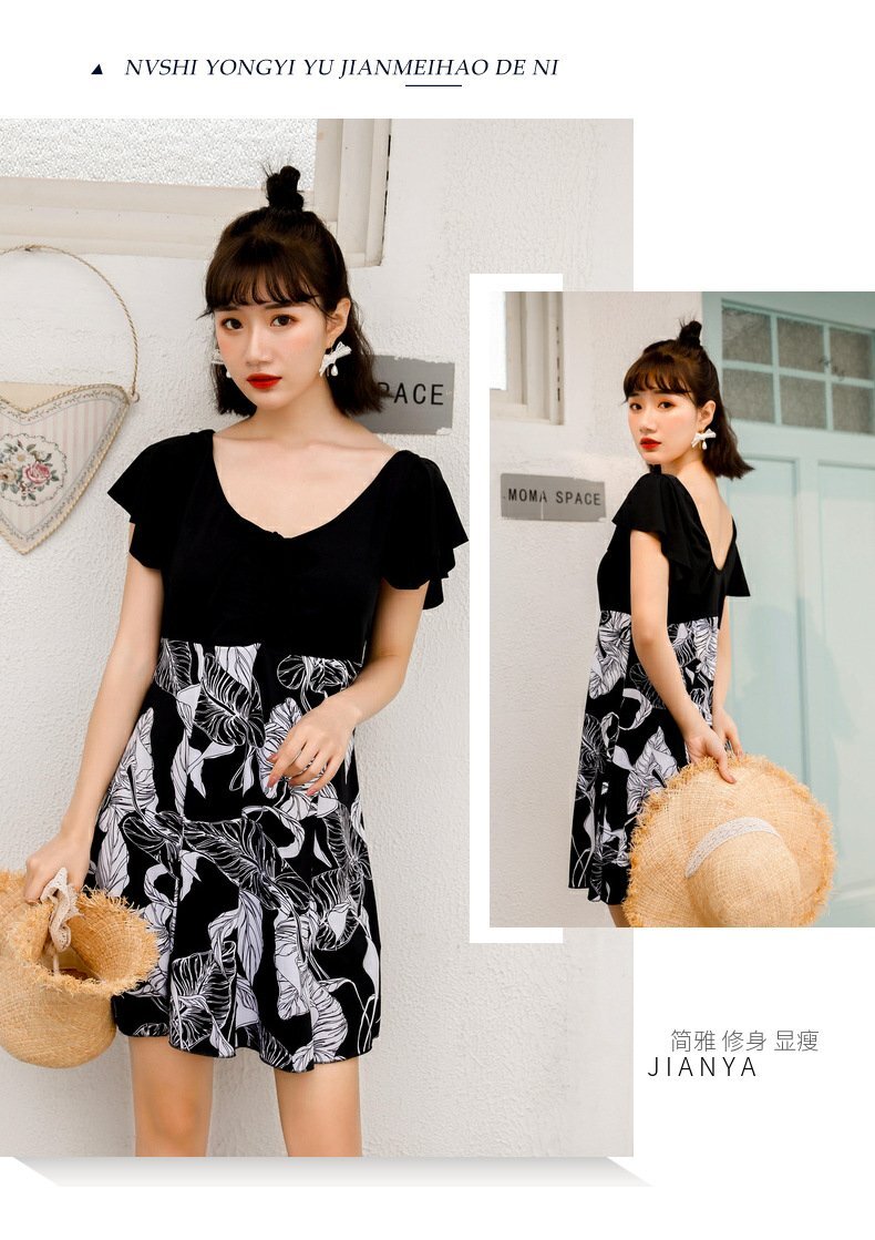 ・リーフ柄がお洒落なワンピース水着。フロントはシンプルなAラインシルエットです。