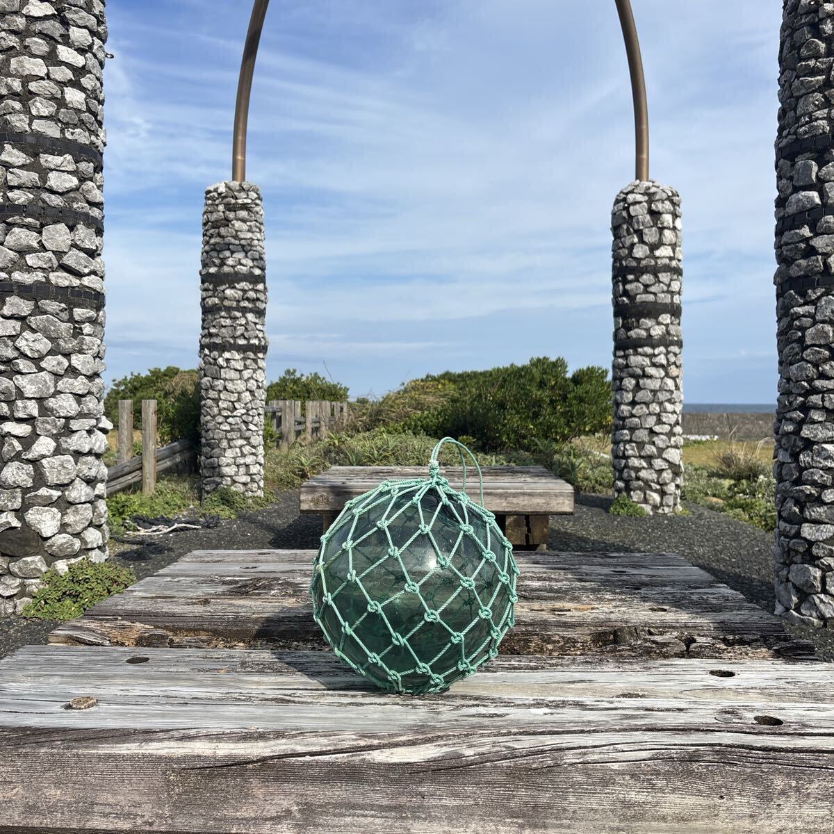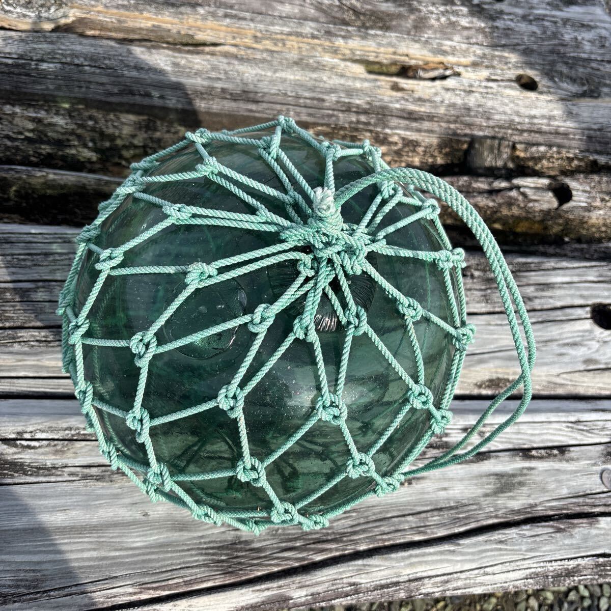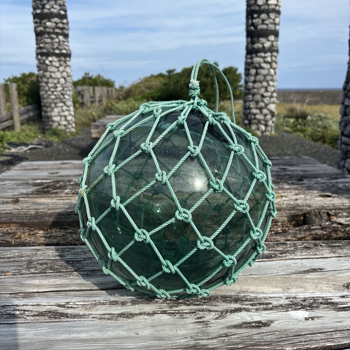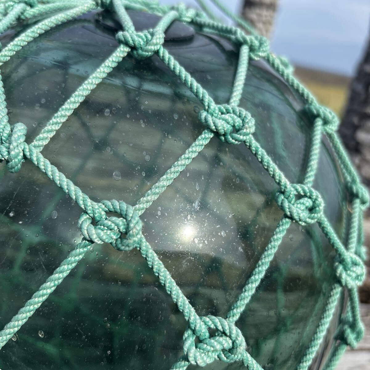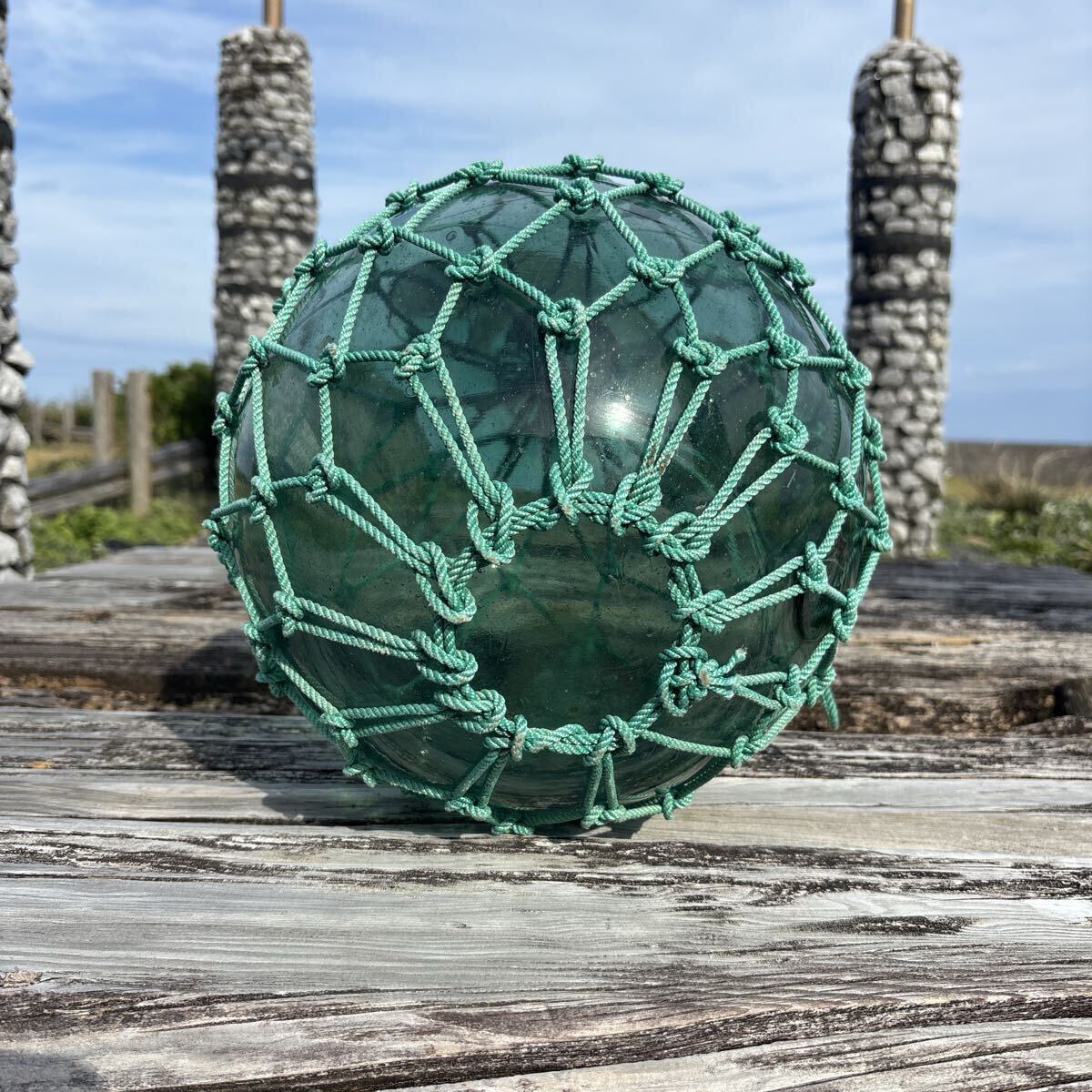 こちら昔漁師さんが使っていた瓶玉です。ギザギザヘソと濃いグリーンの鮮やかな直径30センチ編み付き、気泡ありです。画像よりご確認の上ノーリスクノーリターンでのお取引宜しくお願い致します。重量約3.9キロと重みのある品です。ギザヘソ横にもヘソの様なマルがあります。インテリアにいかがでしょうか