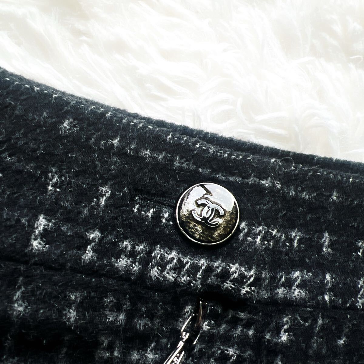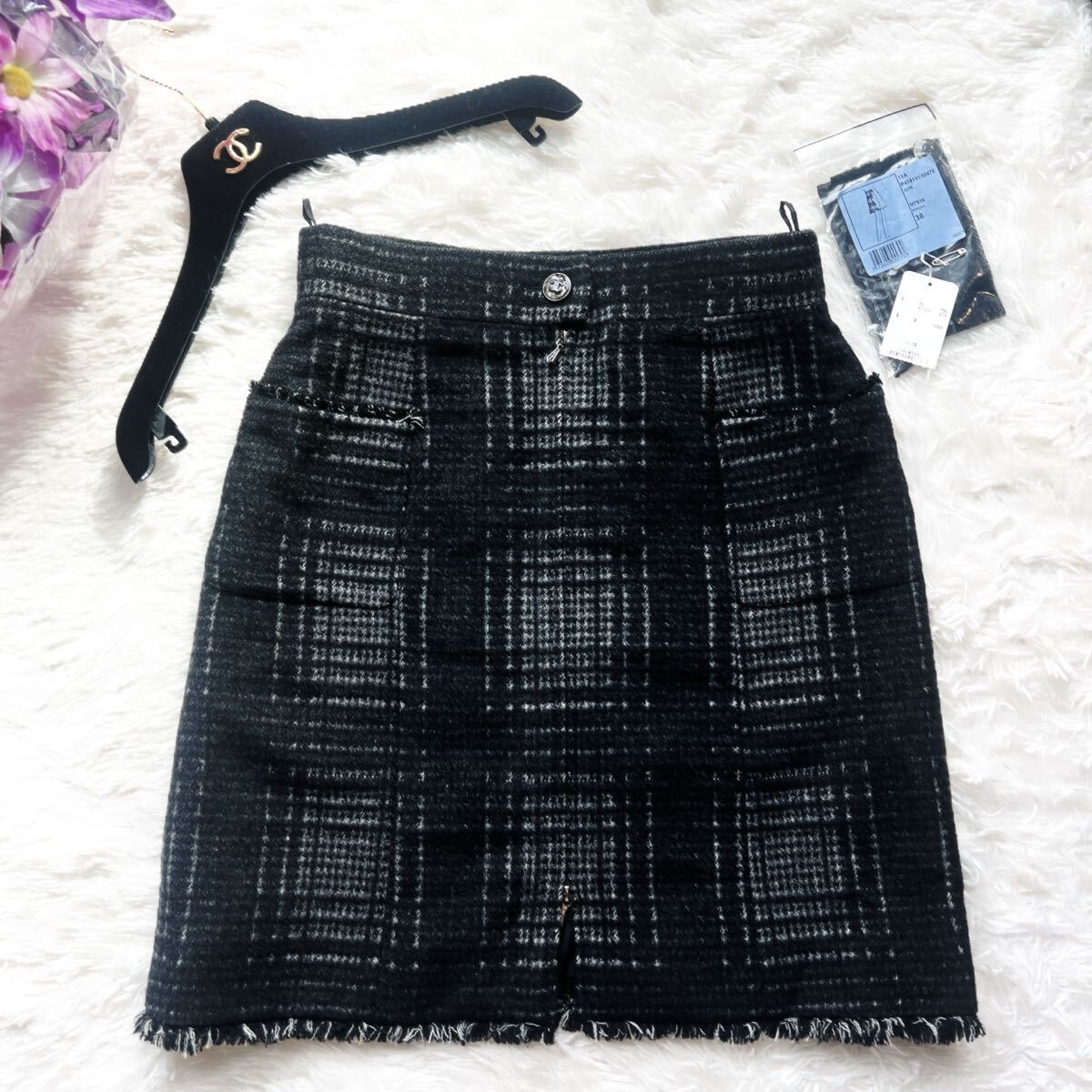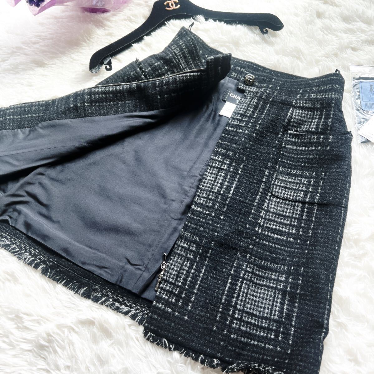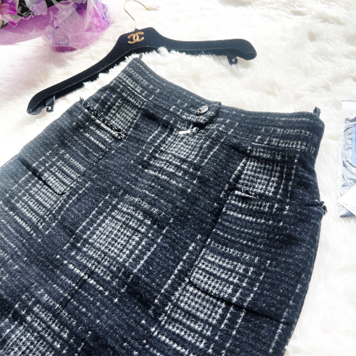 秋冬のおしゃれにぴったりなチェック柄のシャネルのスカートでございます。ふわふわしたウールお素材。ウェストポイントにはガラス細工用いられました。クリアのグリポアボタンが美しいです。