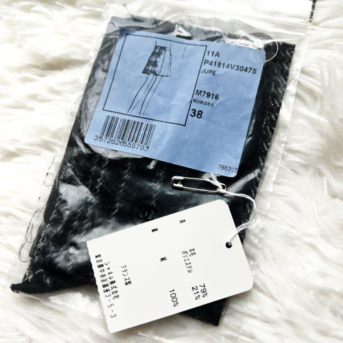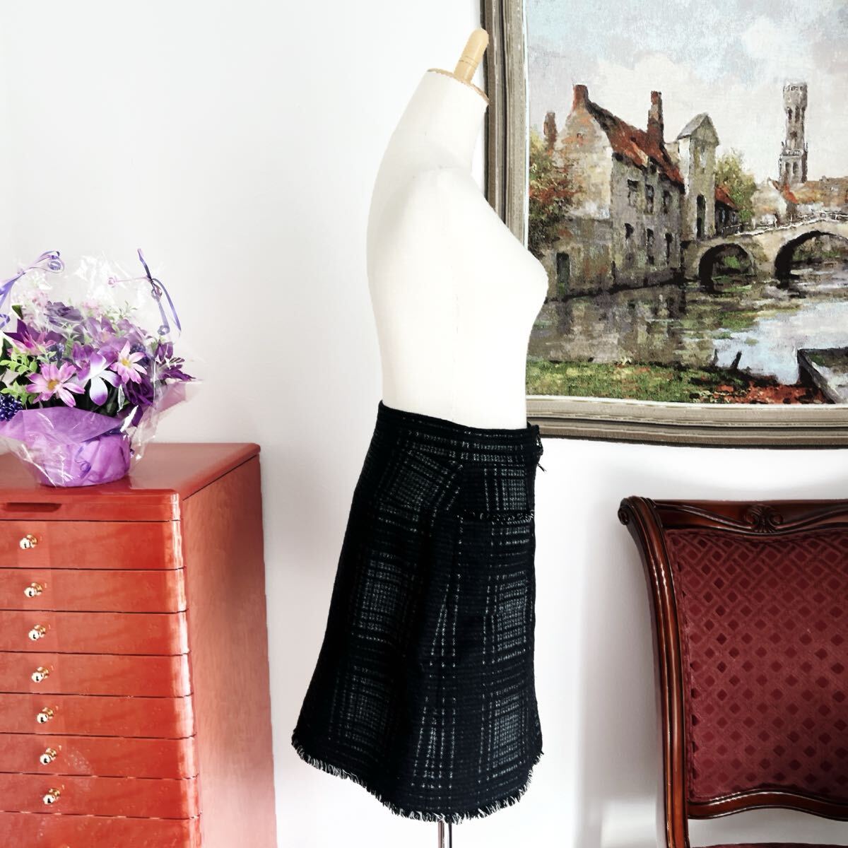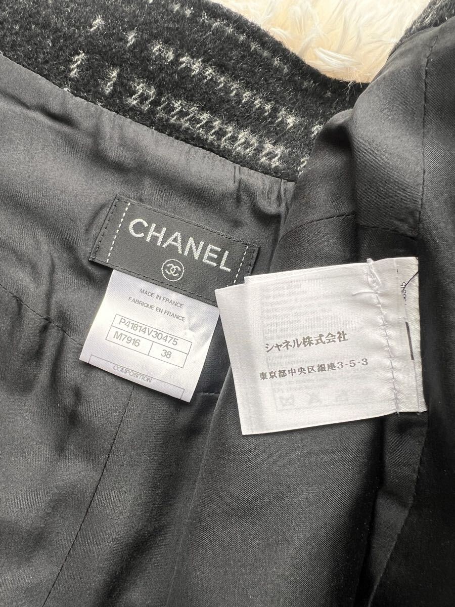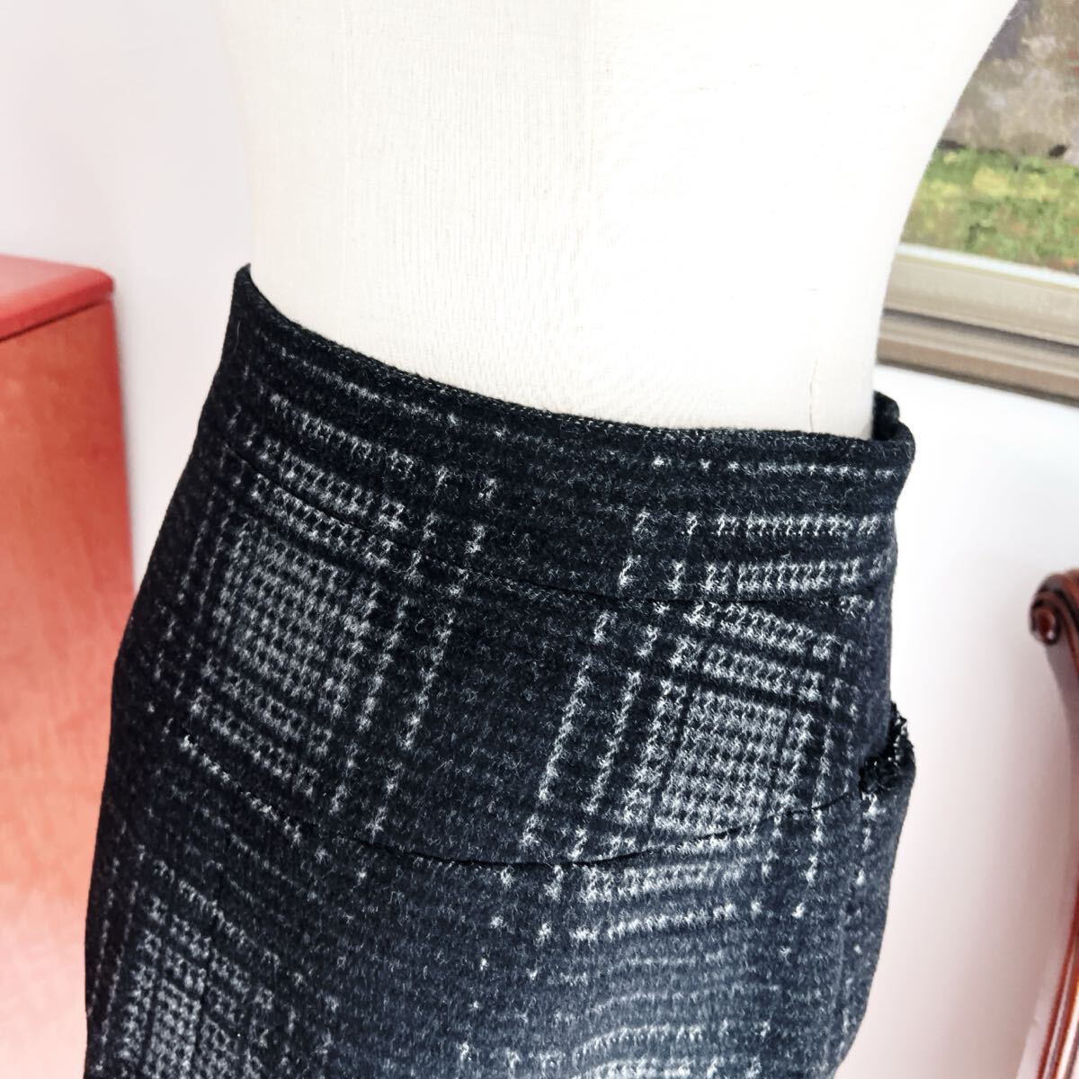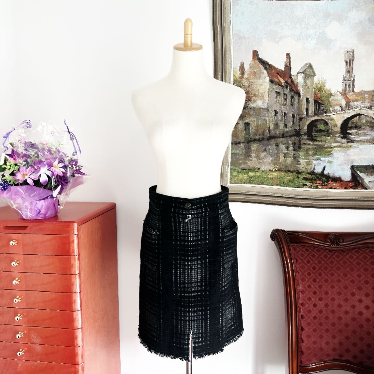 秋冬のおしゃれにぴったりなチェック柄のシャネルのスカートでございます。ふわふわしたウールお素材。ウェストポイントにはガラス細工用いられました。クリアのグリポアボタンが美しいです。