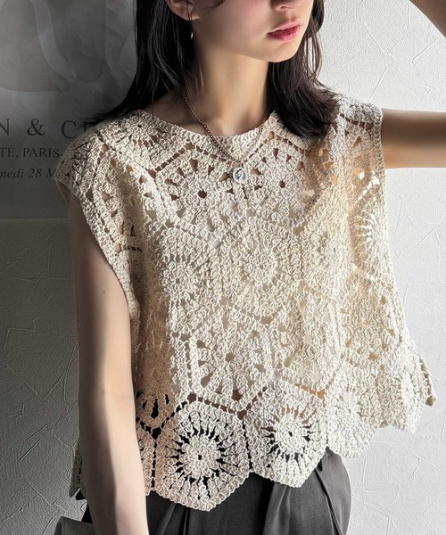 参考商品名:レトロ感漂うトレンド♪前後2WAYクロシェレースフレンチスリーブカットソー