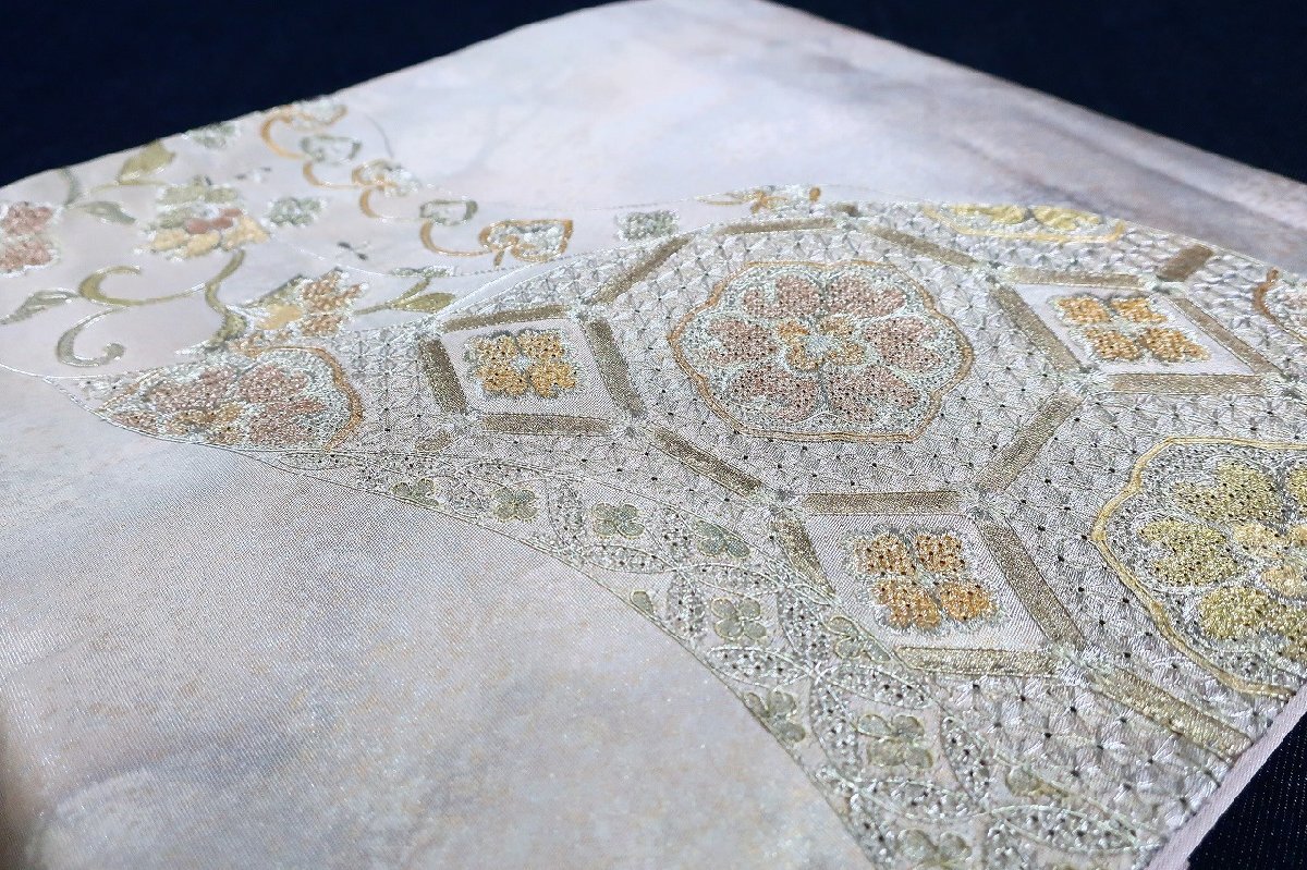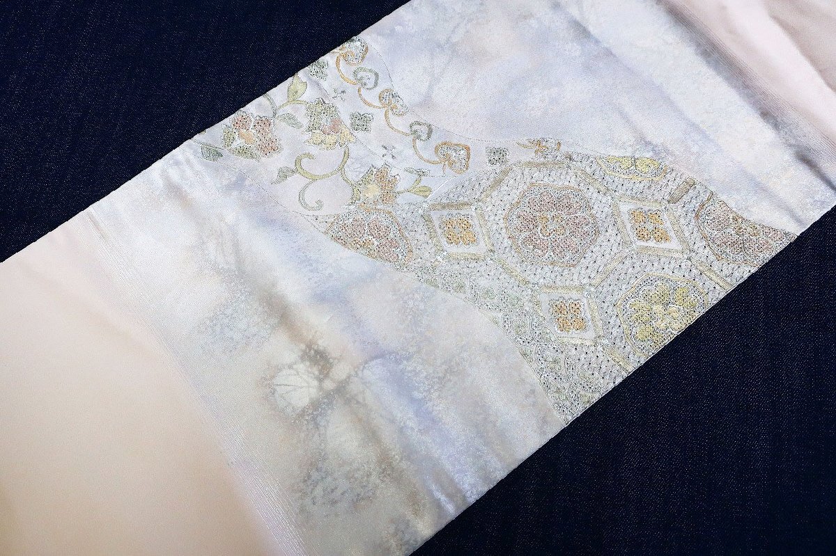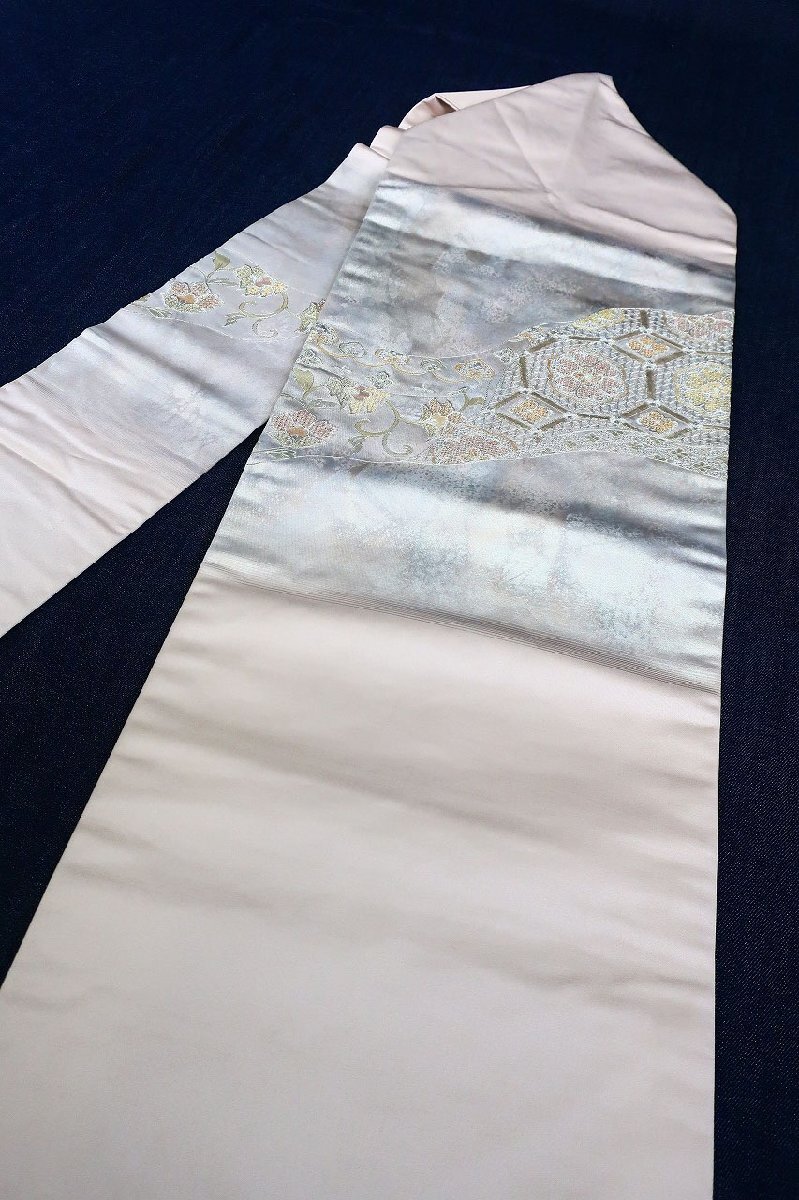 未使用品 名古屋帯 薄桜色 華文 唐花 刺繍 長さ3m65cm お洒落 カジュアル 正絹 仕立て上がり 着物フィ m-8301 |