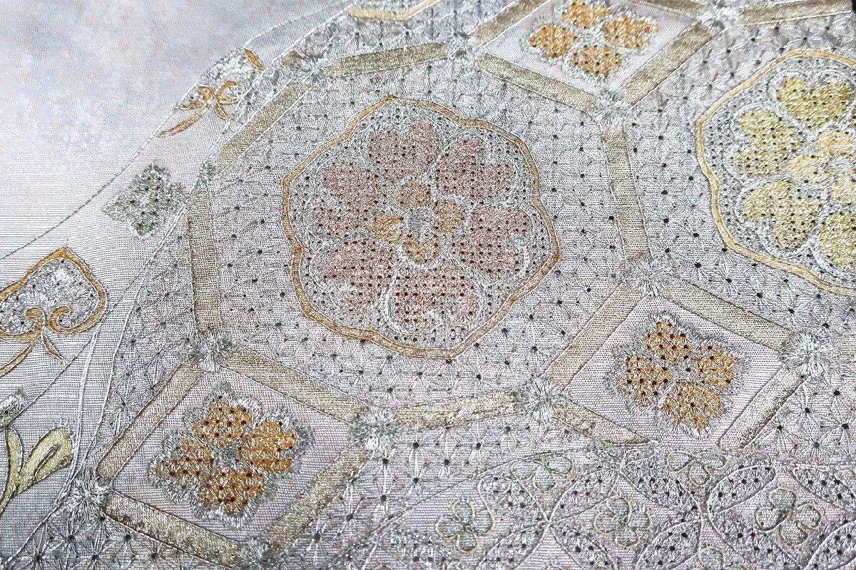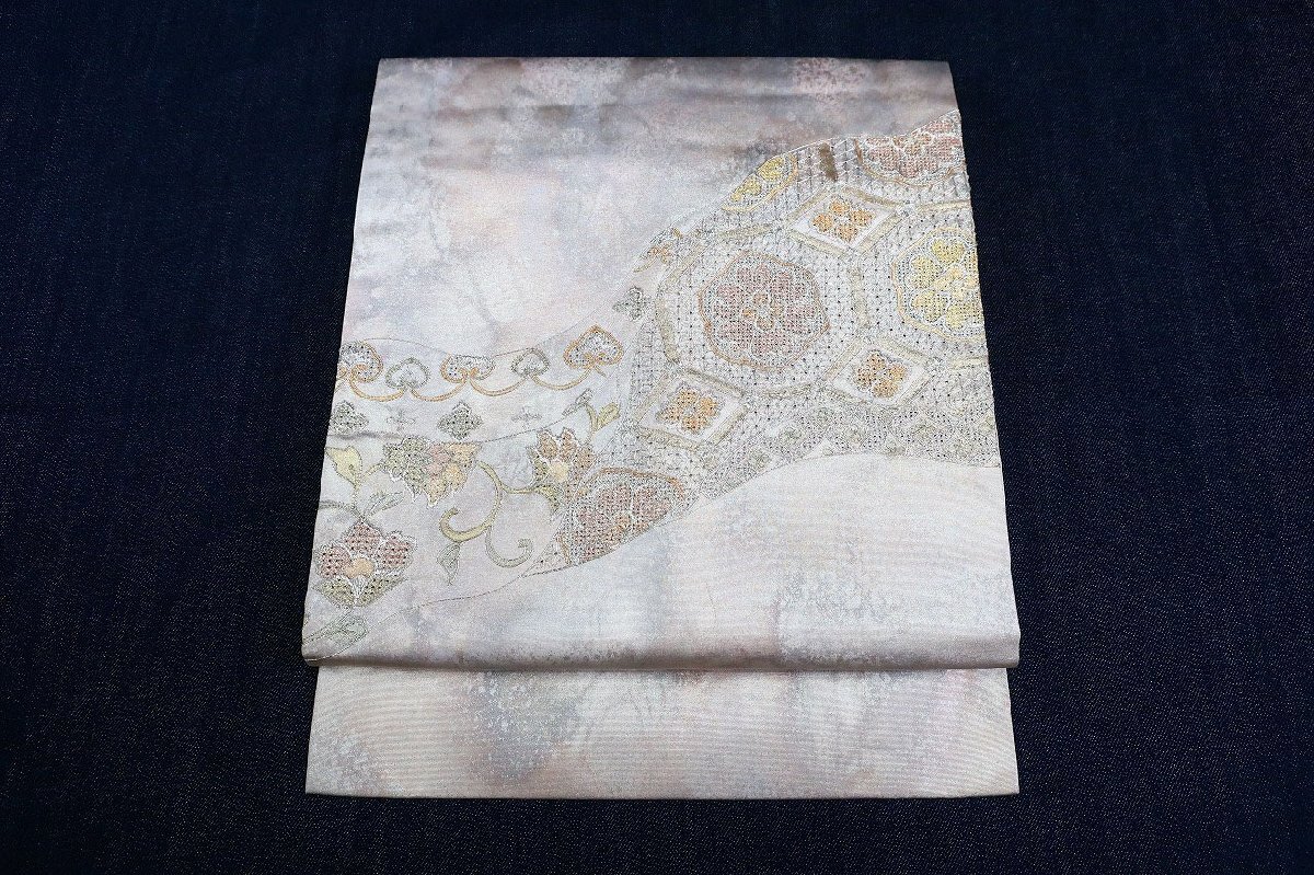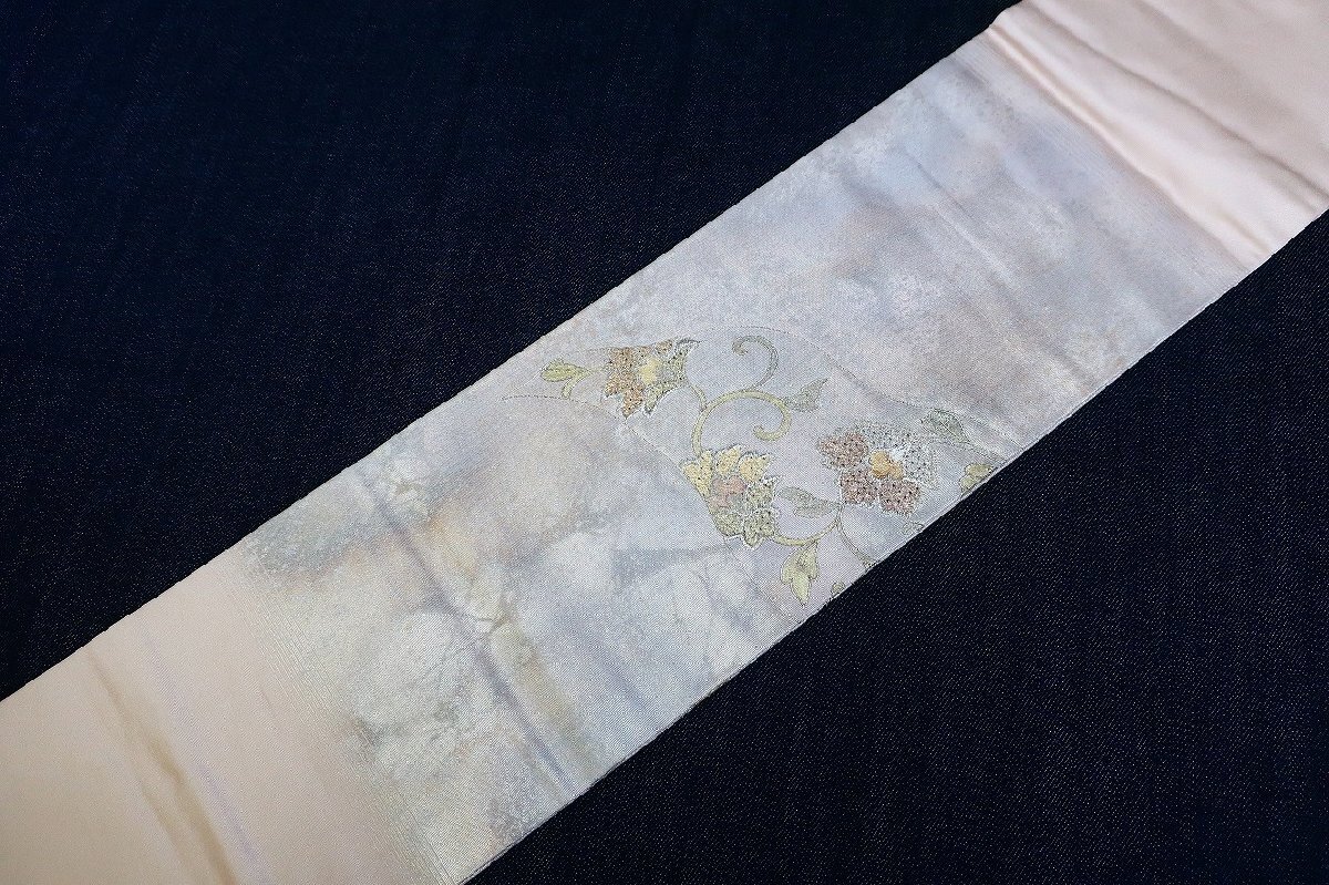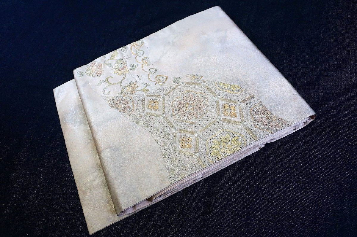 未使用品 名古屋帯 薄桜色 華文 唐花 刺繍 長さ3m65cm お洒落 カジュアル 正絹 仕立て上がり 着物フィ m-8301 |