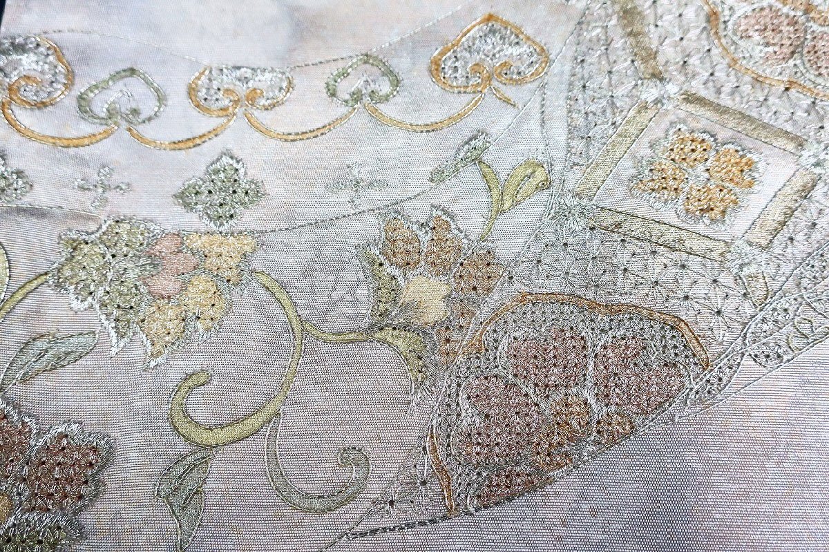 薄桜色の絹地に華文や唐花が織り込まれた名古屋帯です。 部分的に銀糸で刺繍が施された、お洒落な一本です。 未使用品です。 担当:前田 |